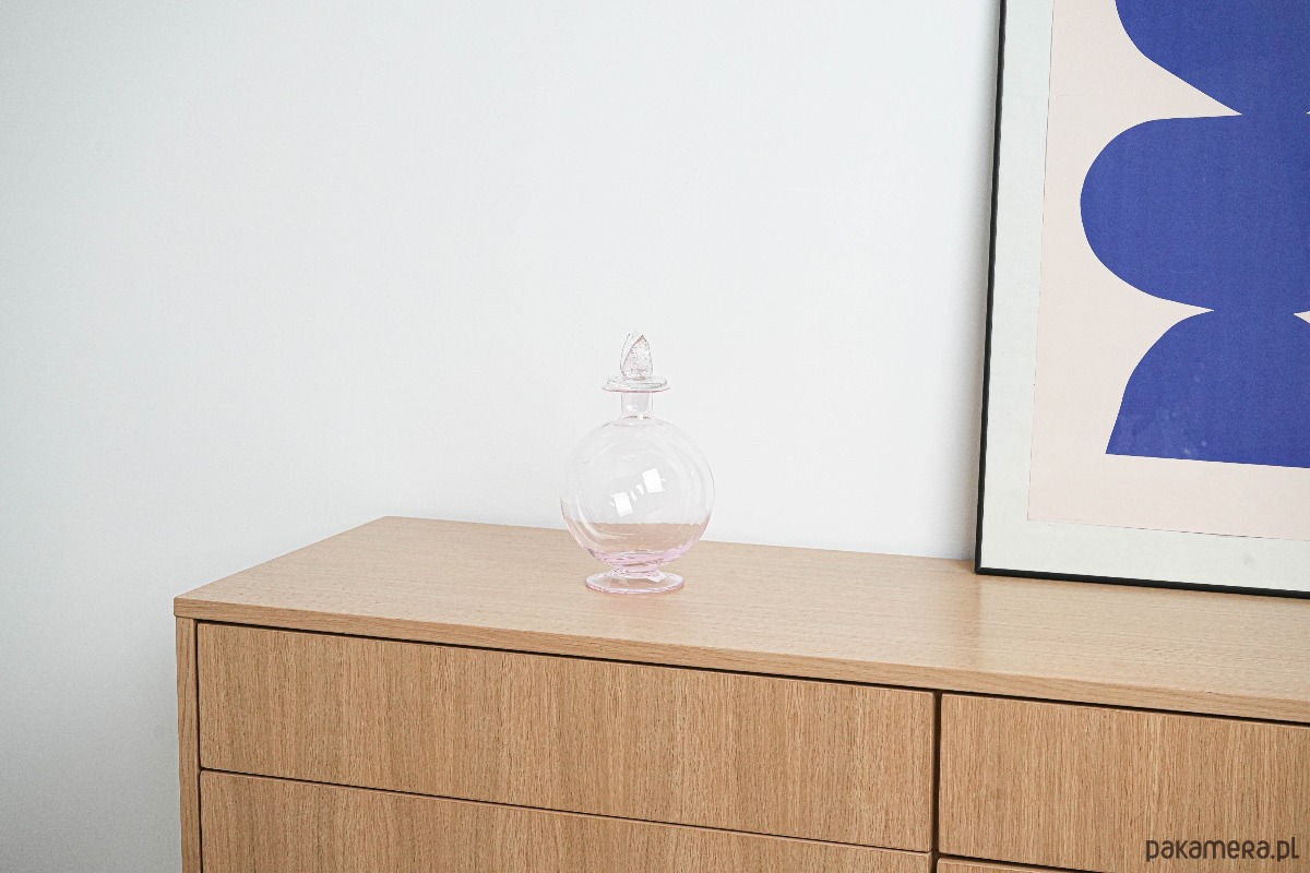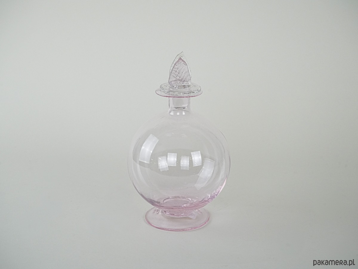 Różowa, kulista karafka z przezroczystym, dekoracyjnym korkiem w kształcie liści. Wykonana z dmuchanego szkła, w latach 70.–80., w stylu charakterystycznym dla włoskich hut szkła z regionu Murano. Delikatny kolor i organiczna forma czynią z niej efektowny element kolekcjonerski i dekoracyjny, idealny do ekspozycji w witrynie lub na stylowym barku.