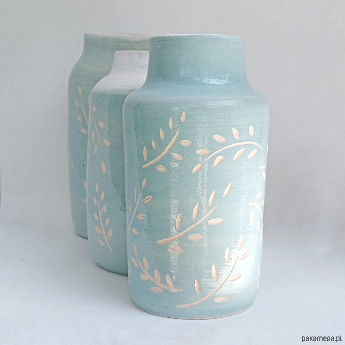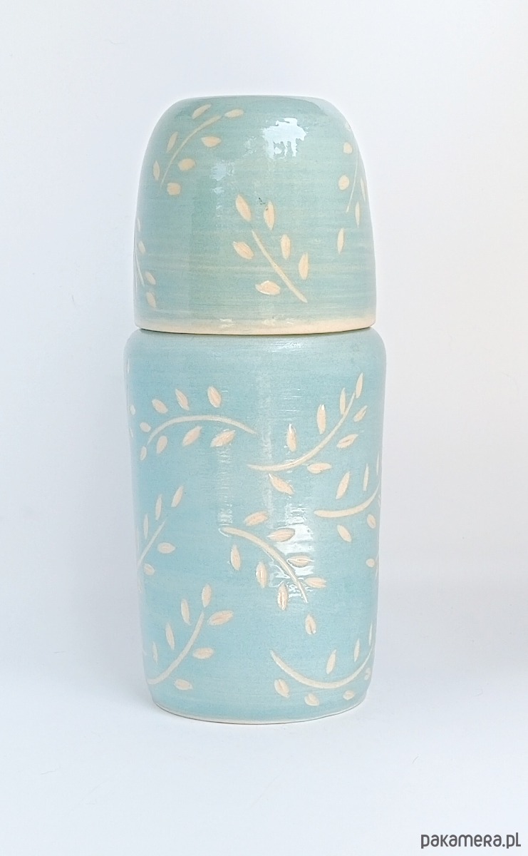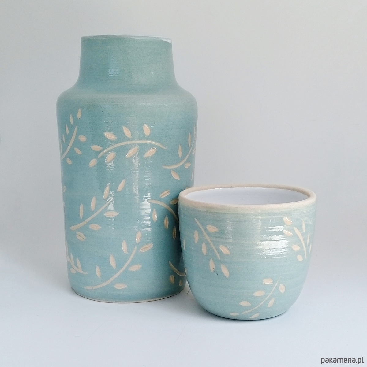 Wzór listków został nacięty na powierzchni malowanej na turkusowo gliny, poszkliwiony szkliwem transparentnym. Wnętrze białe. Pojemność 550 ml.