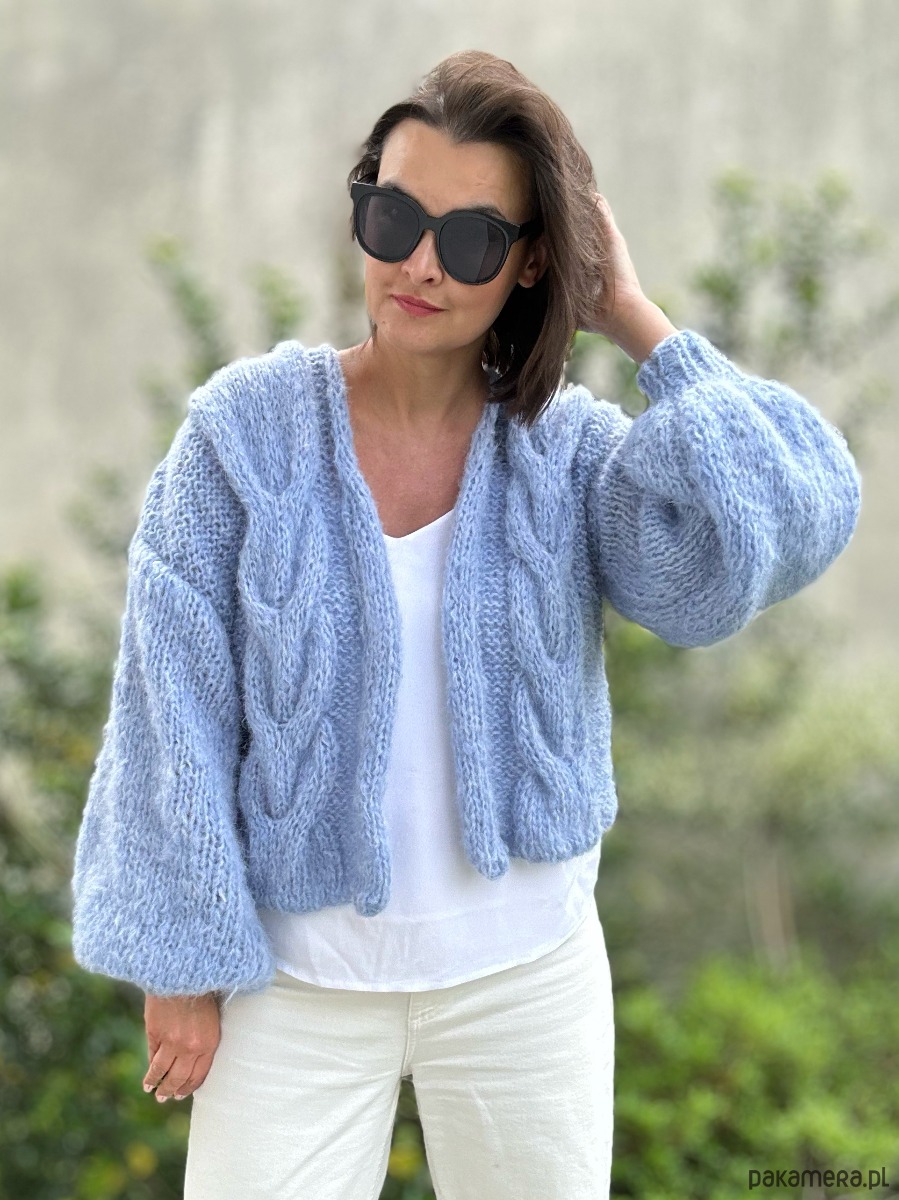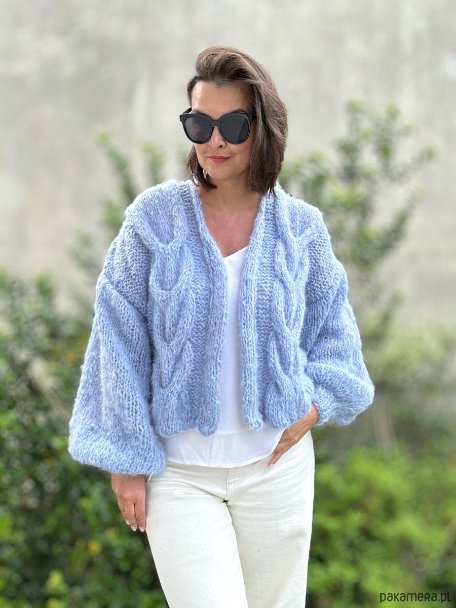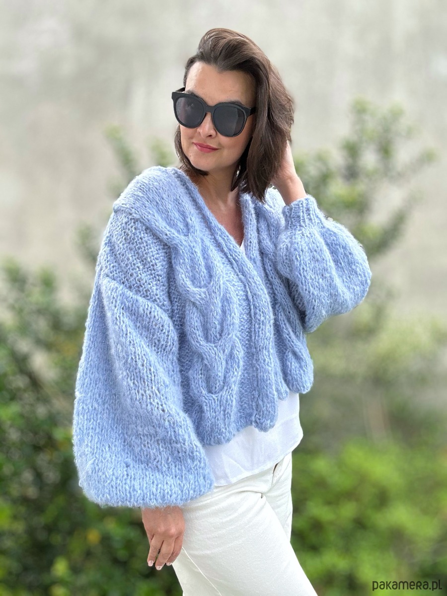 Kardi Ann w pięknym , przepięknym odcieniu błękitu. Jest lekki, przewiewny spleciony na drutach z naturalnej włóczki. Ozdobiony warkoczami i posiadający szerokie , lekko balonowe rękawy. Skład włóczki: 50% fine alpaca, 25% baby alpaca, 15% wolna od mulesingu wełna, 10% nylon. Posiada certyfikat Oeko-Tex.