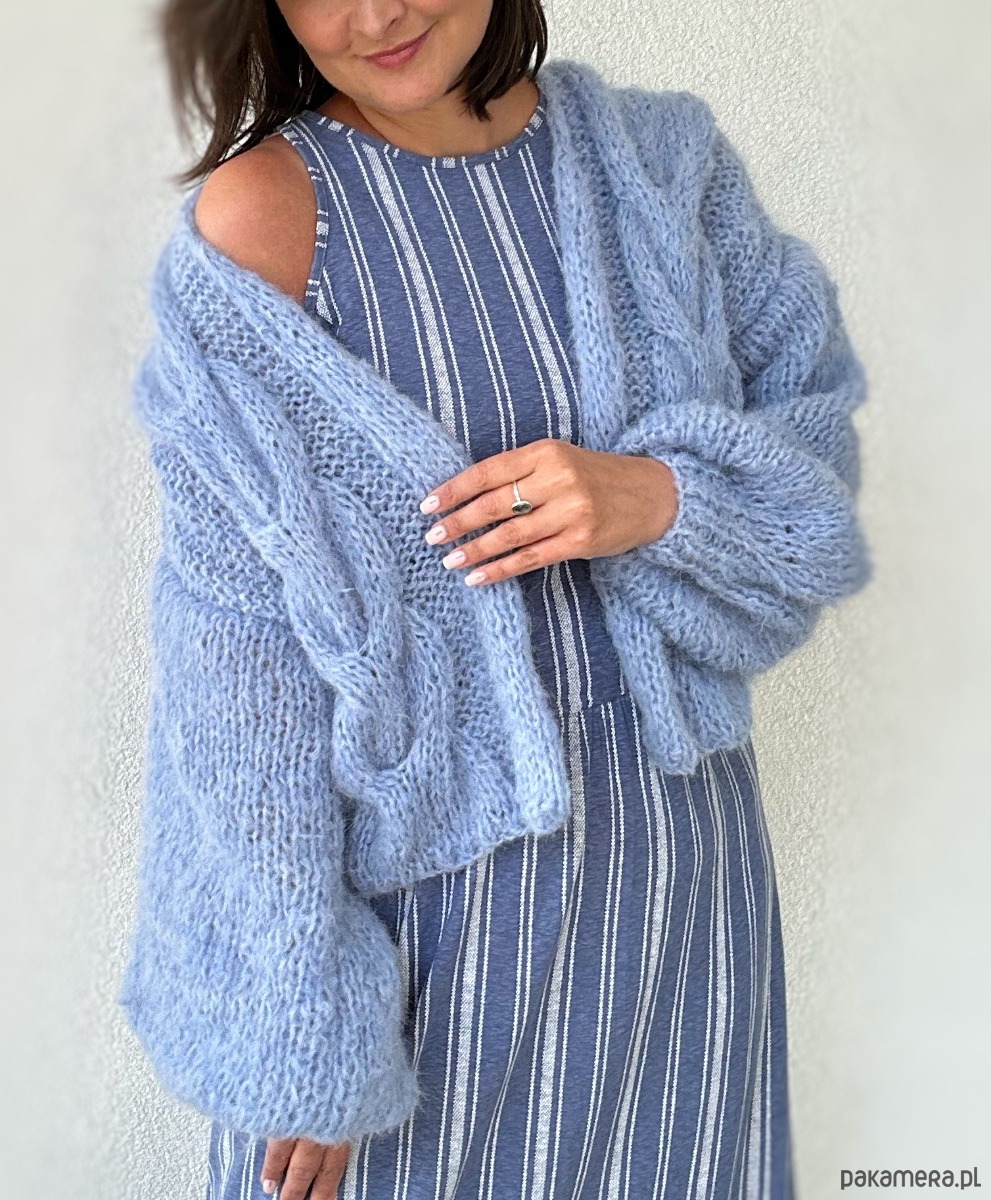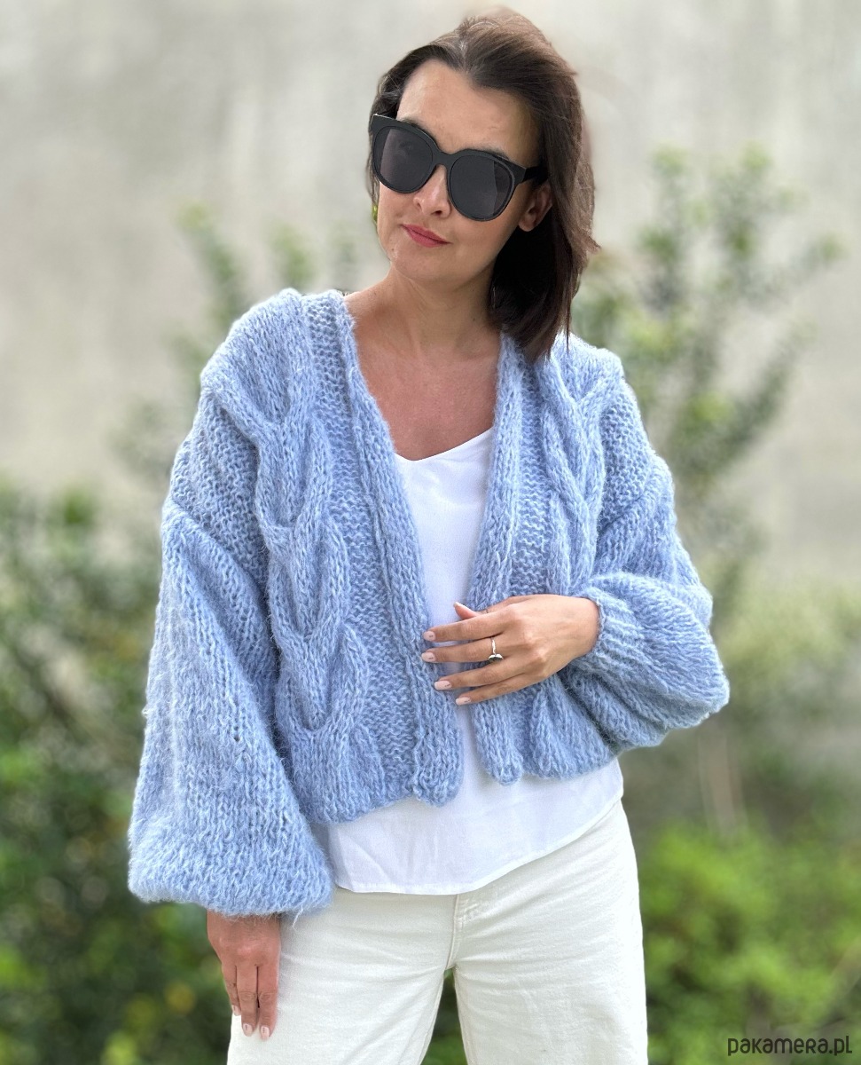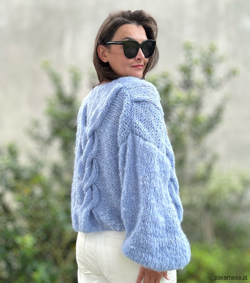 Kardi Ann w pięknym , przepięknym odcieniu błękitu. Jest lekki, przewiewny spleciony na drutach z naturalnej włóczki. Ozdobiony warkoczami i posiadający szerokie , lekko balonowe rękawy. Skład włóczki: 50% fine alpaca, 25% baby alpaca, 15% wolna od mulesingu wełna, 10% nylon. Posiada certyfikat Oeko-Tex.