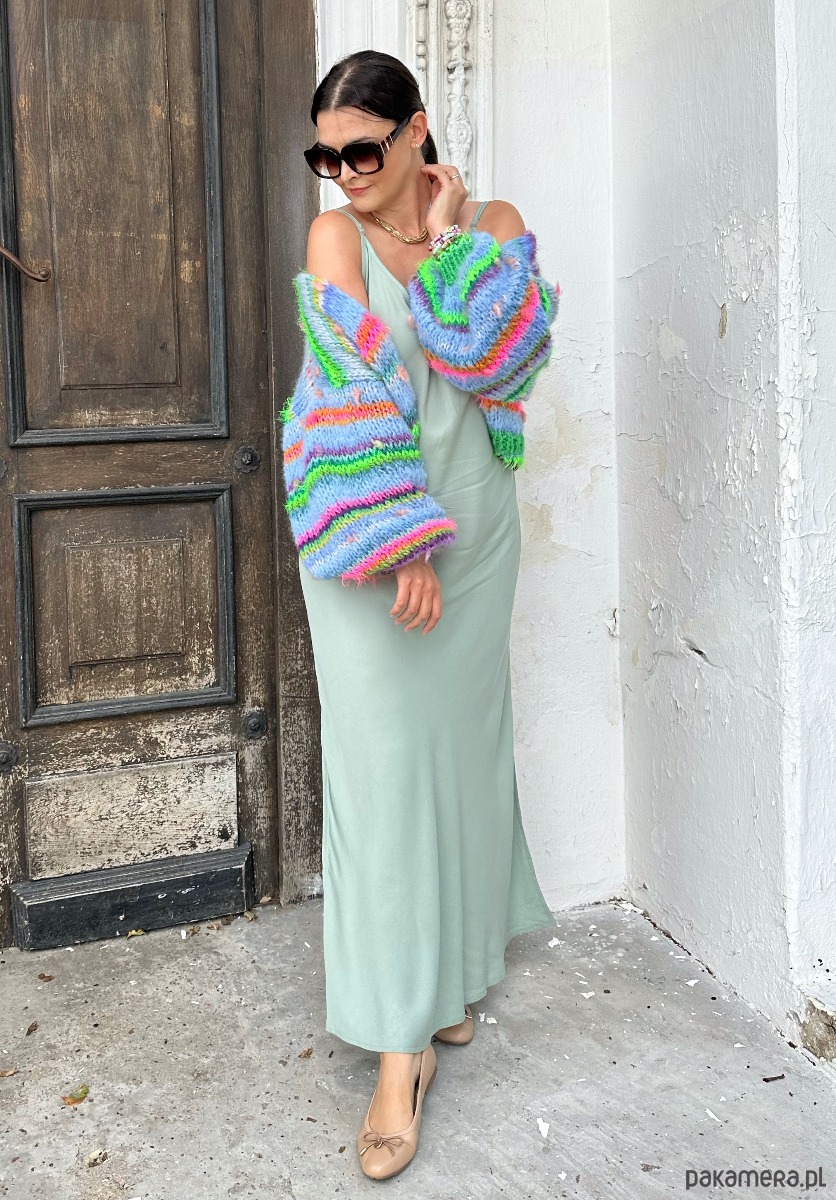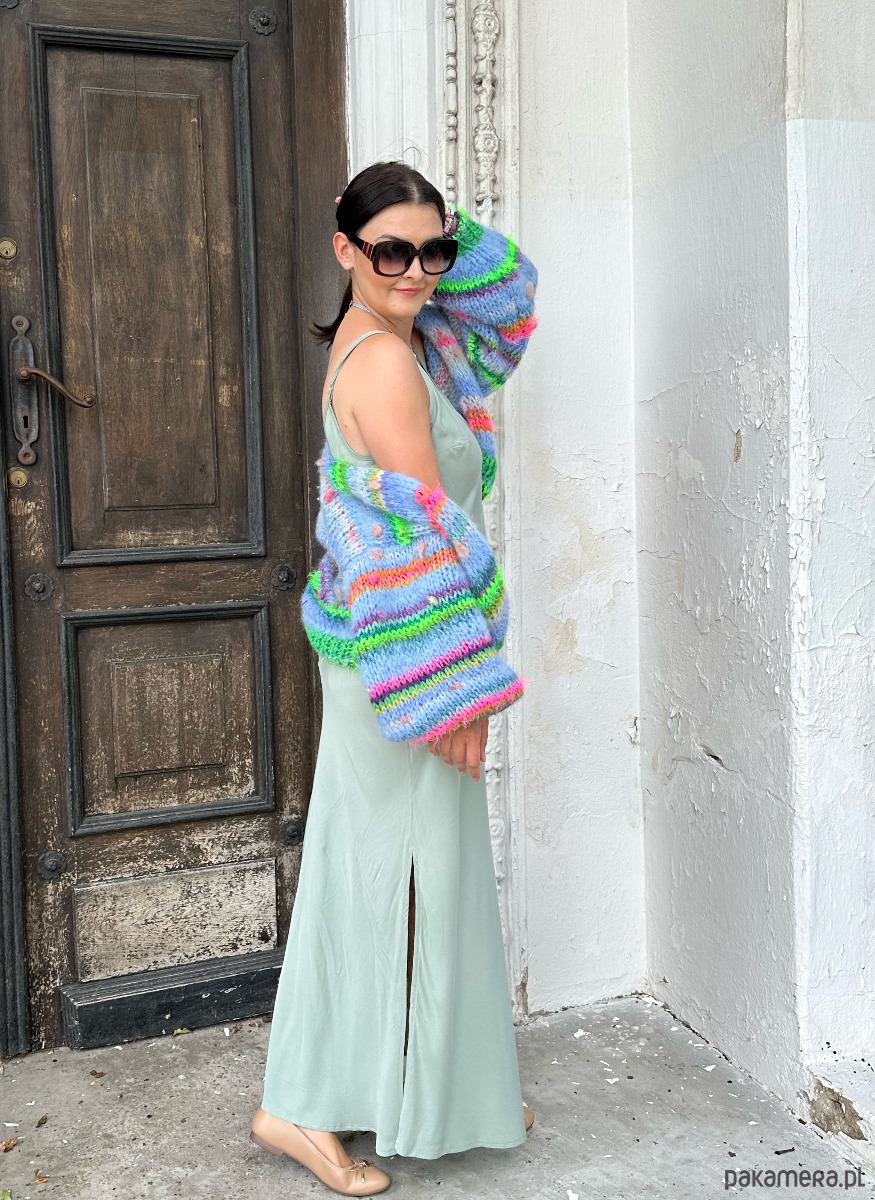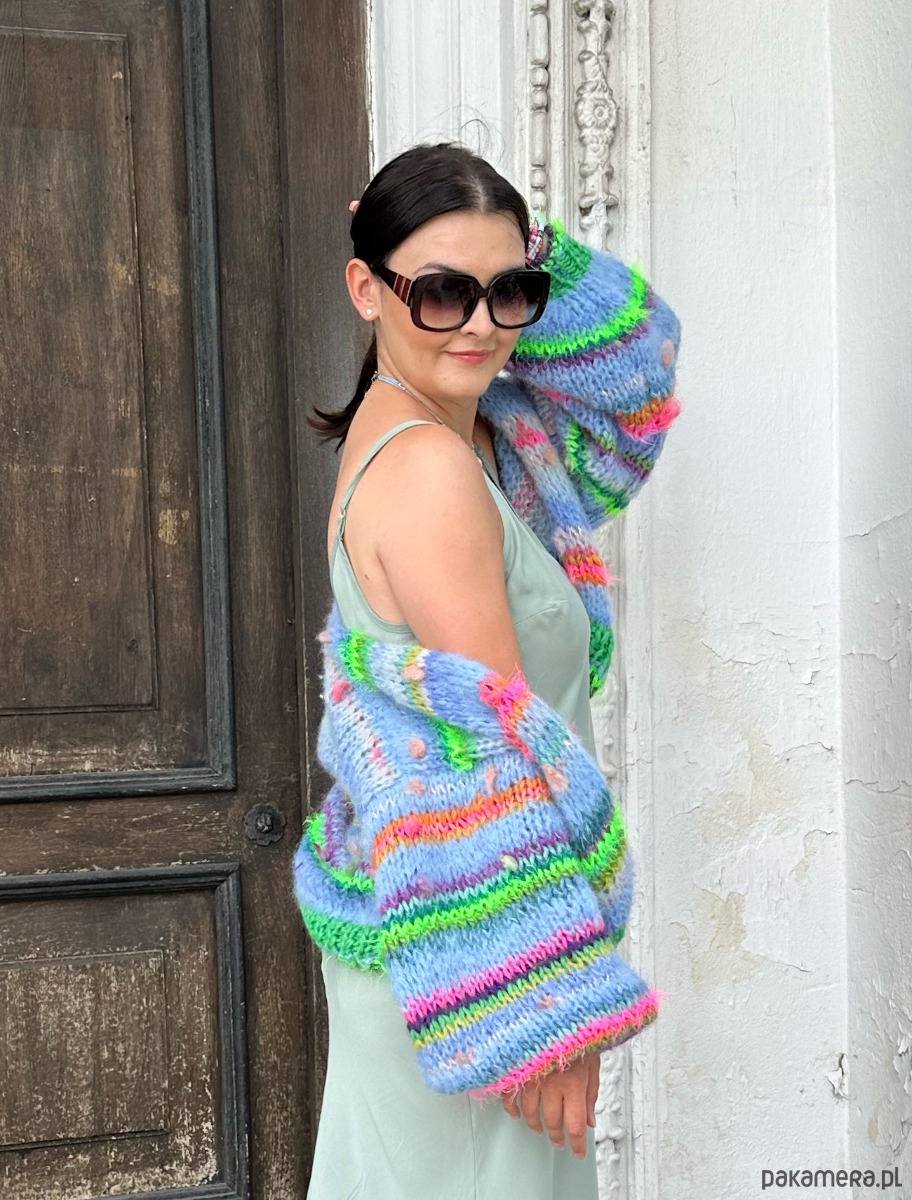 Kardigan Blue Butterfly to energetyczne połączenie włóczek: alpaki, merino, jedwabiu , moheru z minimalną domieszką akrylu. Fantazyjne włóczki z kolorowymi nopkami dodają mu charakteru i oryginalności.Kardigan jest niezwykle kolorowy (w przewagą odcieni niebieskiego), puszysty i cudownie miękki. To całoroczny model , dla kobiet które lubią naturalne materiały, wygodę i uwielbiają być zauważone. Kolor kardiganu może odrobinę różnić się , w zależności od ustawień monitora.