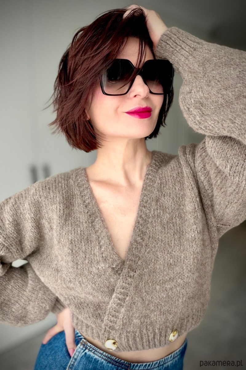 Krótki kardigan w odcieniu ciepłego beżu, wykonany ze szlachetnej dzianiny. Zmysłowy dekolt w kształcie litery V subtelnie podkreśla linię ramion, a skrócona forma pięknie akcentuje talię. Złote guziki dodają mu charakteru.