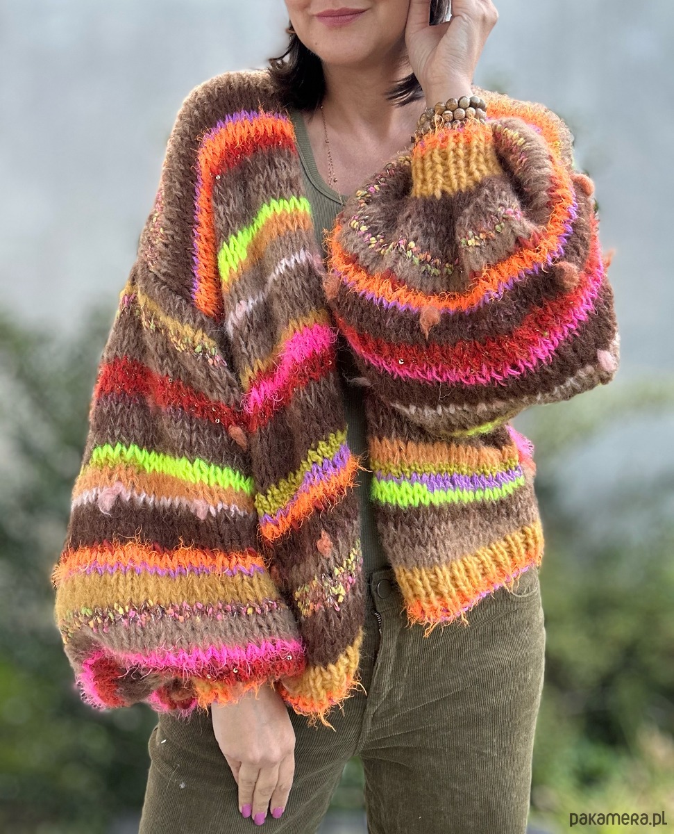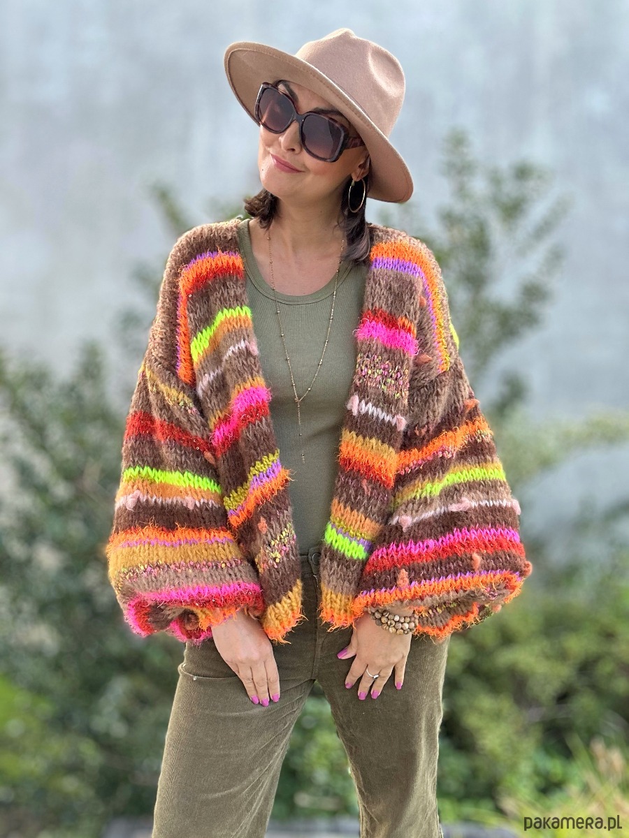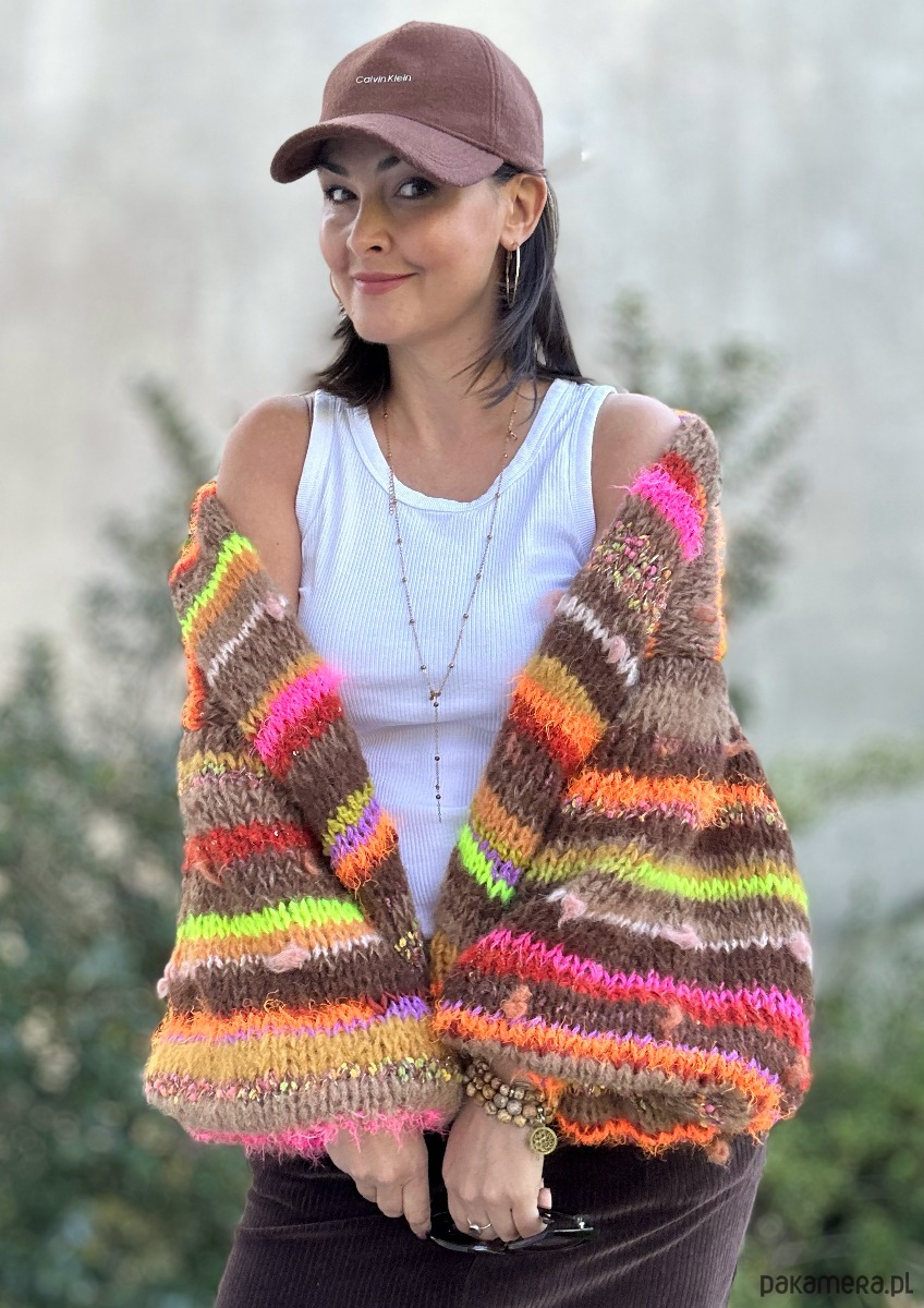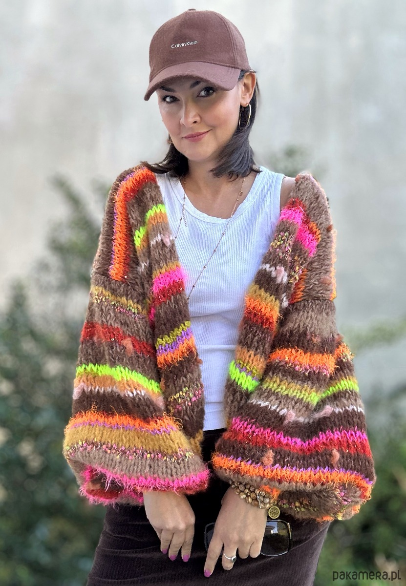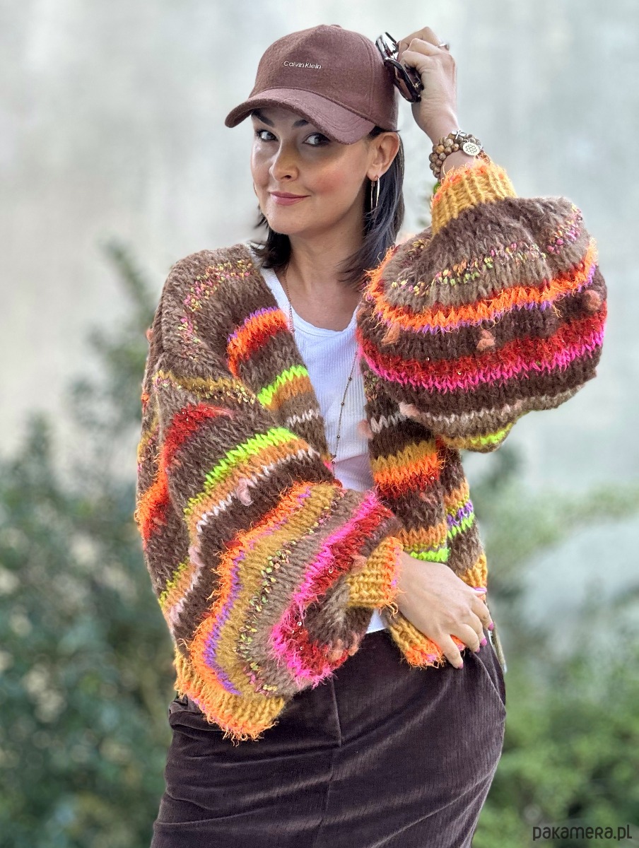 Kardigan Brown Butterfly to energetyczne połączenie włóczek: alpaki, merino, jedwabiu , moheru z minimalną domieszką akrylu. Fantazyjne , neonowe włóczki dodają mu charakteru i oryginalności. Kardigan jest niezwykle kolorowy (w przewagą odcieni brązu), puszysty i cudownie miękki. To całoroczny model , dla kobiet które lubią naturalne materiały, wygodę i uwielbiają być zauważone.