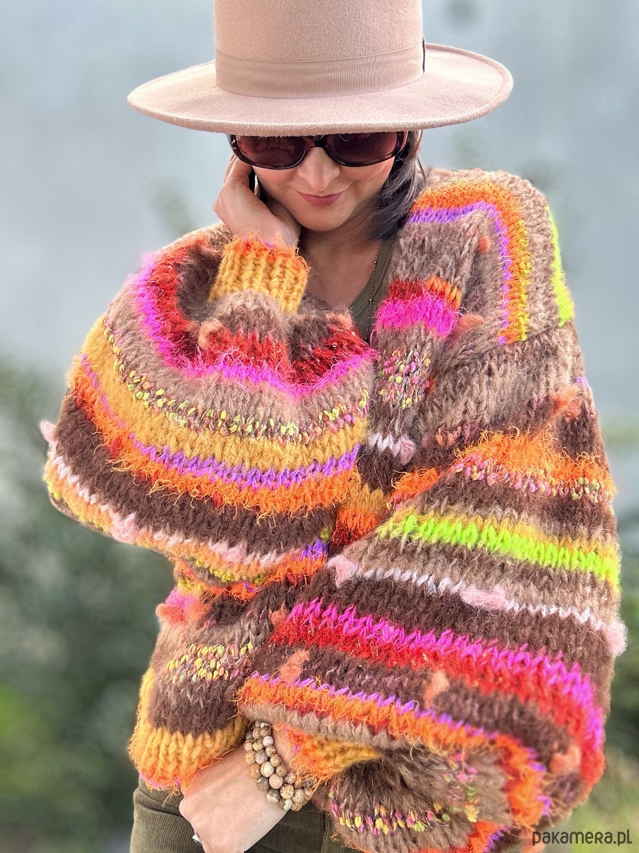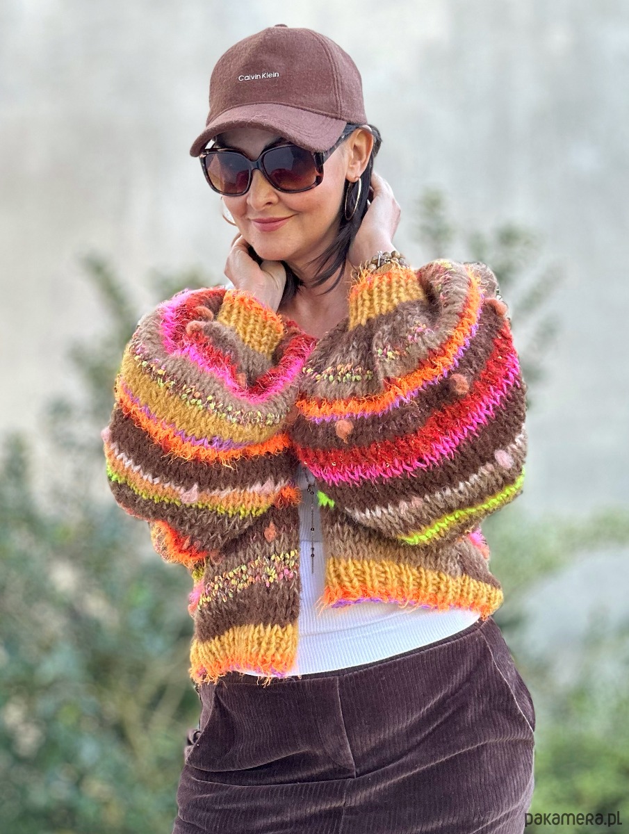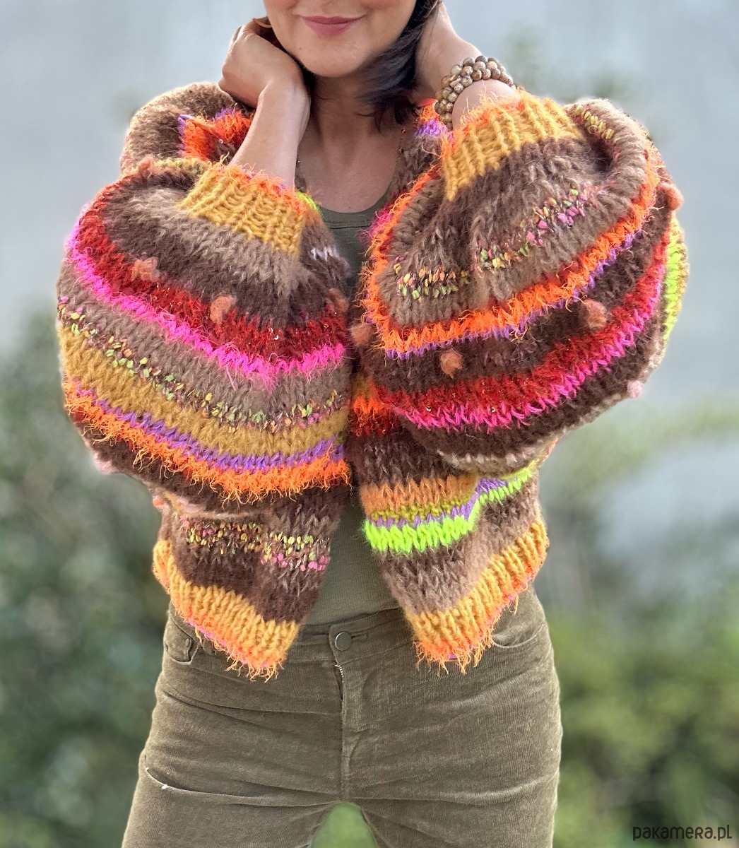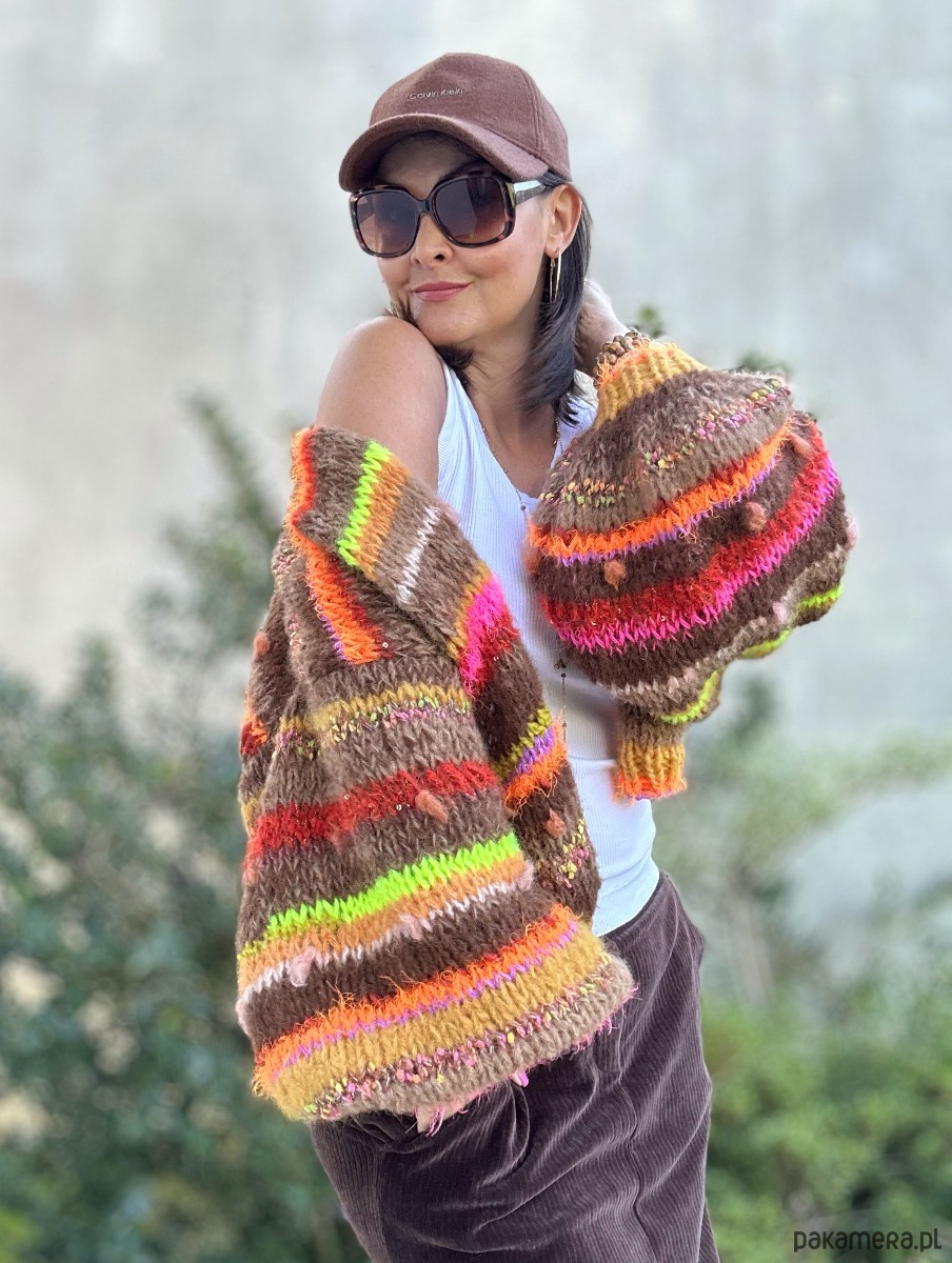 Kardigan Brown Butterfly to energetyczne połączenie włóczek: alpaki, merino, jedwabiu , moheru z minimalną domieszką akrylu. Fantazyjne , neonowe włóczki dodają mu charakteru i oryginalności. Kardigan jest niezwykle kolorowy (w przewagą odcieni brązu), puszysty i cudownie miękki. To całoroczny model , dla kobiet które lubią naturalne materiały, wygodę i uwielbiają być zauważone.