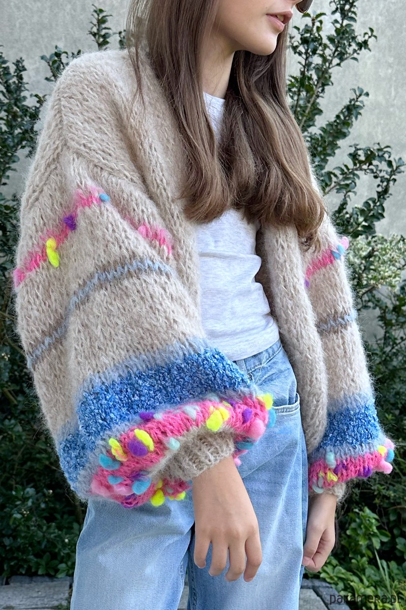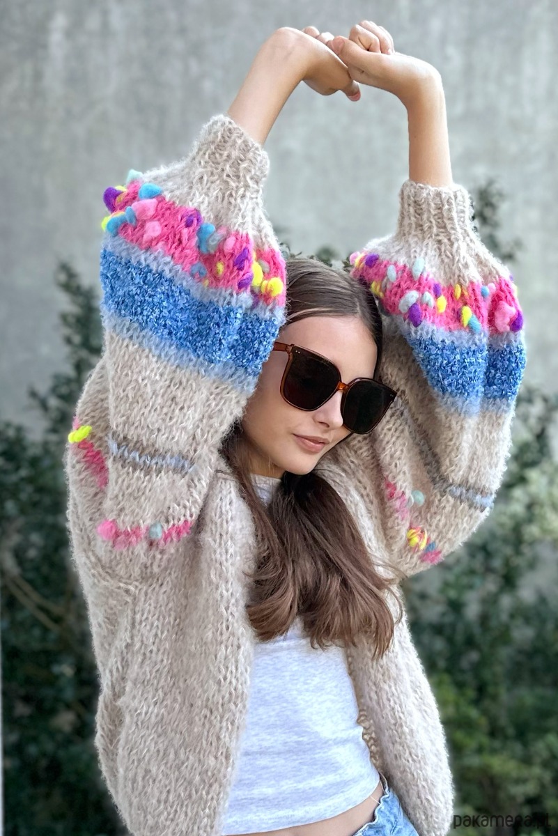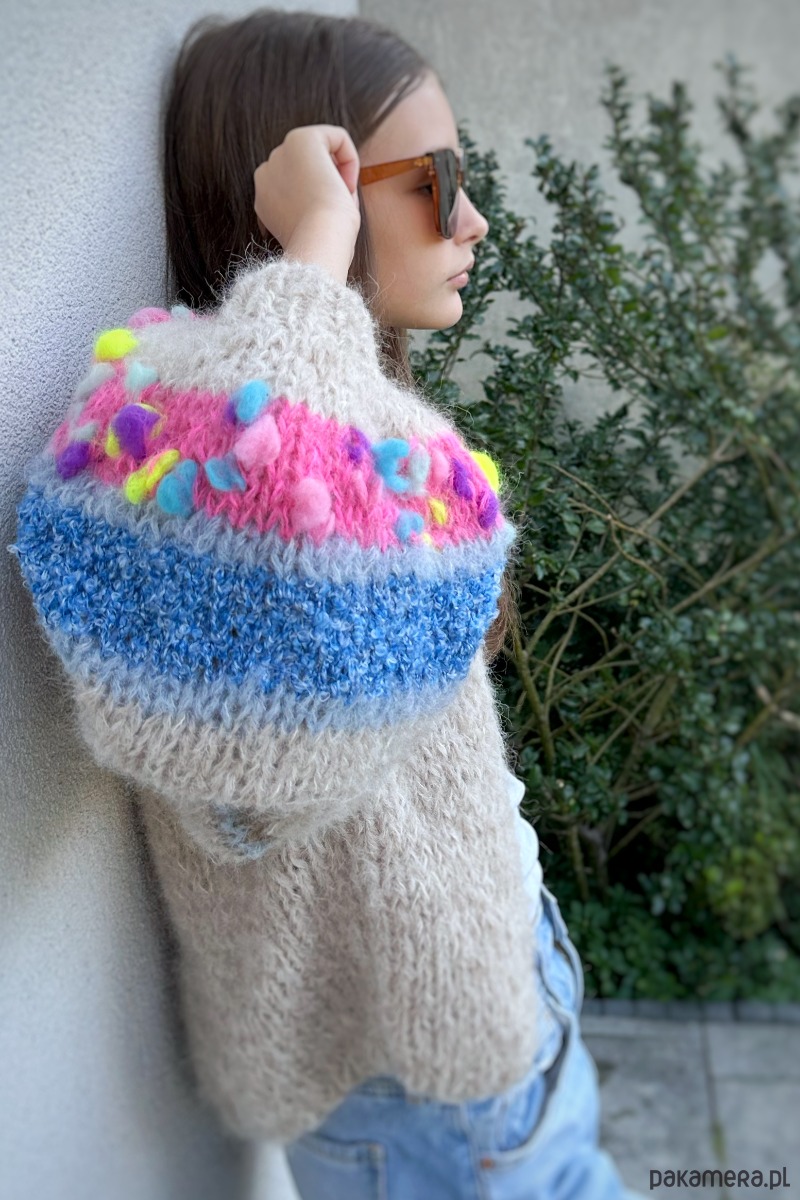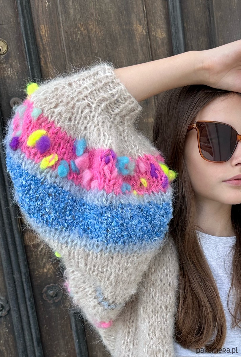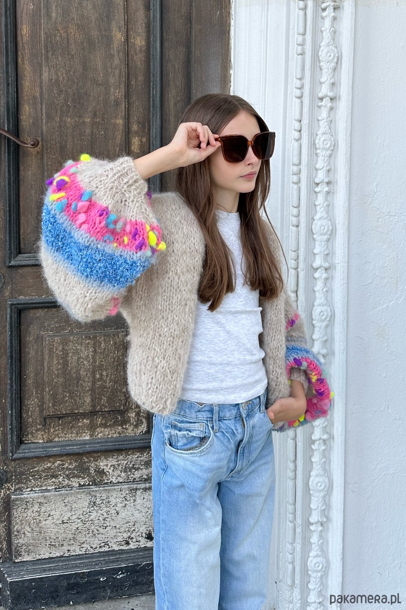 Lekki , przewiewny i efektowny kardigan Dream to przepiękna propozycja na każdą porę roku. Kardigan ma szerokie rękawy, z dodatkiem efektownych i fantazyjnych włóczek. Kardigan jest w pięknym , odcieniu jasnego beżu.Kobiecy i oryginalny. Spleciony jest z naturalnych włóczek (podwójna nitka).
