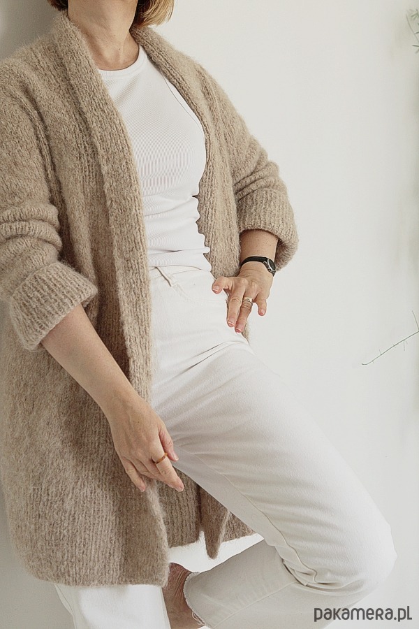Fason swobodny z obniżoną linią ramion, otwarty bez zapięć, rękawy długie z wywinięciem.