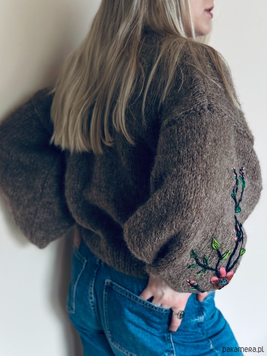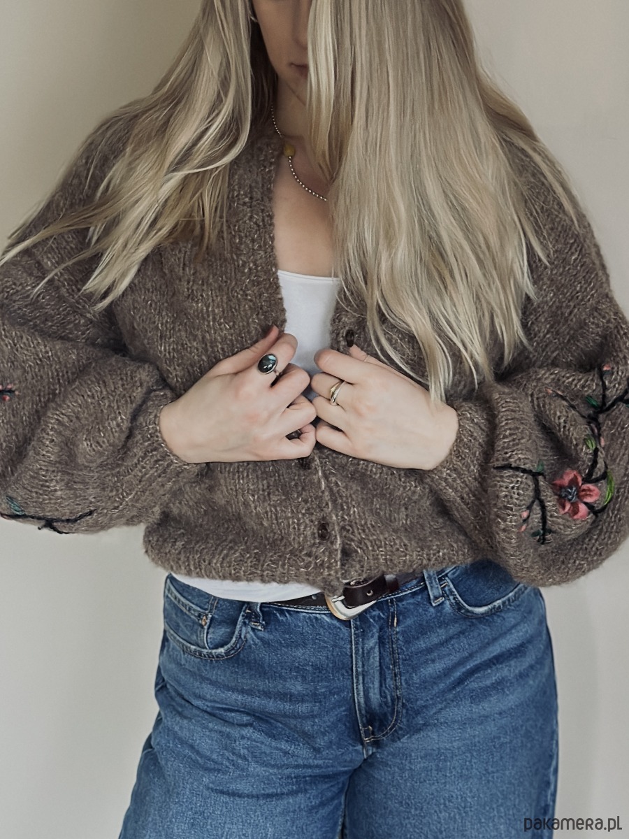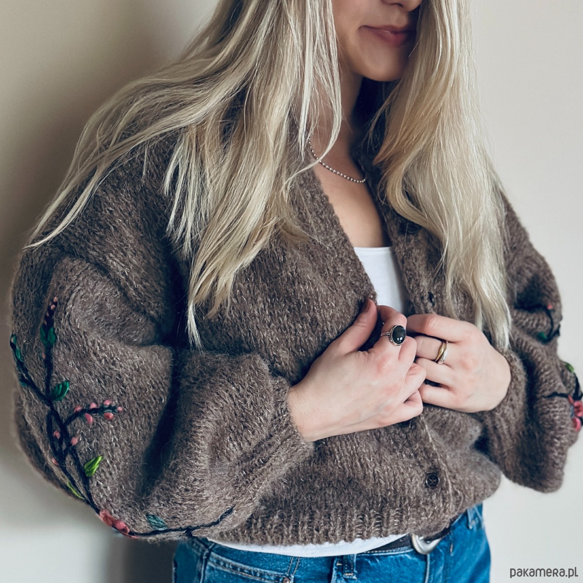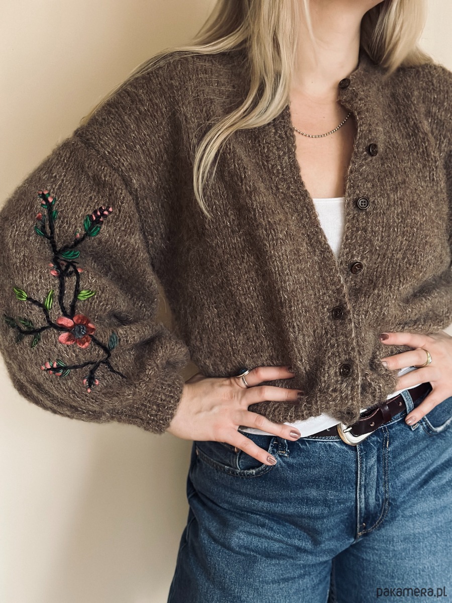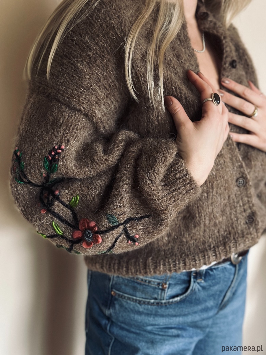 Ten kardigan to idealne połączenie komfortu i ciepła. Wykonany z wysokogatunkowej włóczki: mieszanki czesankowej superfine alpaca (77 %) i delikatnie lśniącego jedwabiu (23 %). Zapinany na guziki. Kolor podstawowy: kawowy brąz. Delikatny motyw kwiatowy na rękawach wyhaftowany jest z włóczek, które w swoim składzie mają naturalne włókna: alpakę, moher, merynos. Idealny do każdej stylizacji.