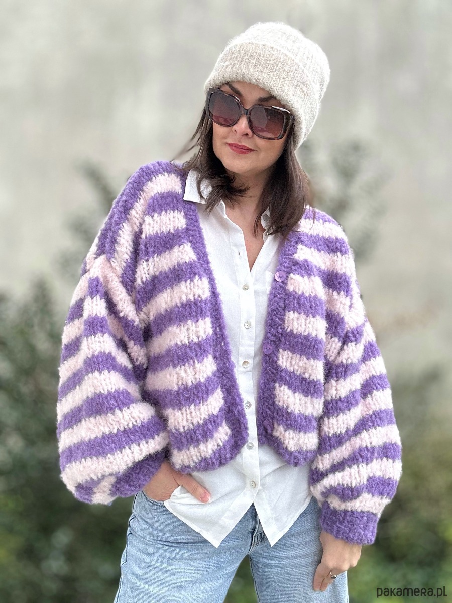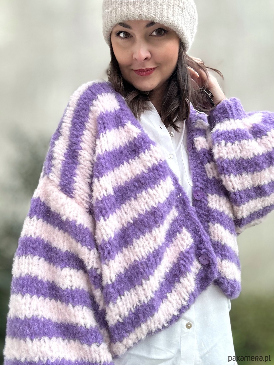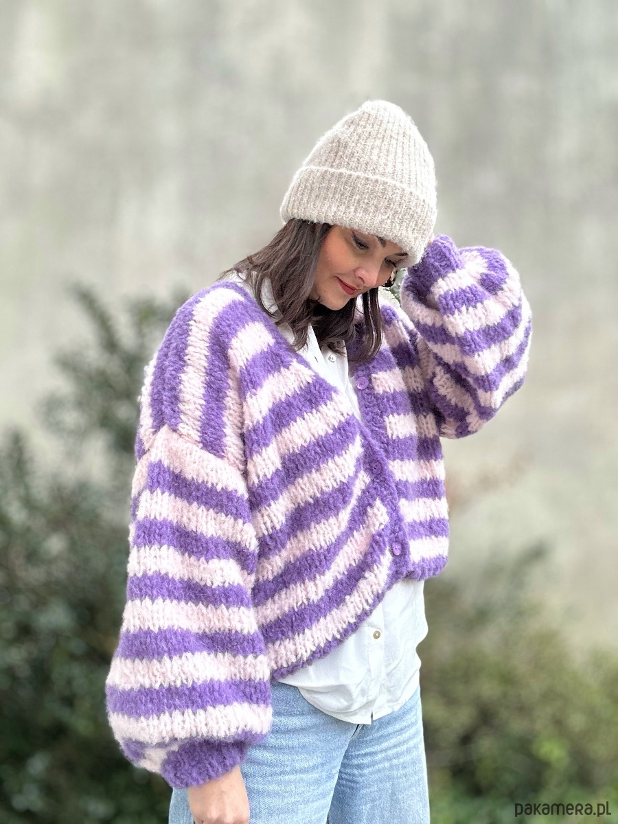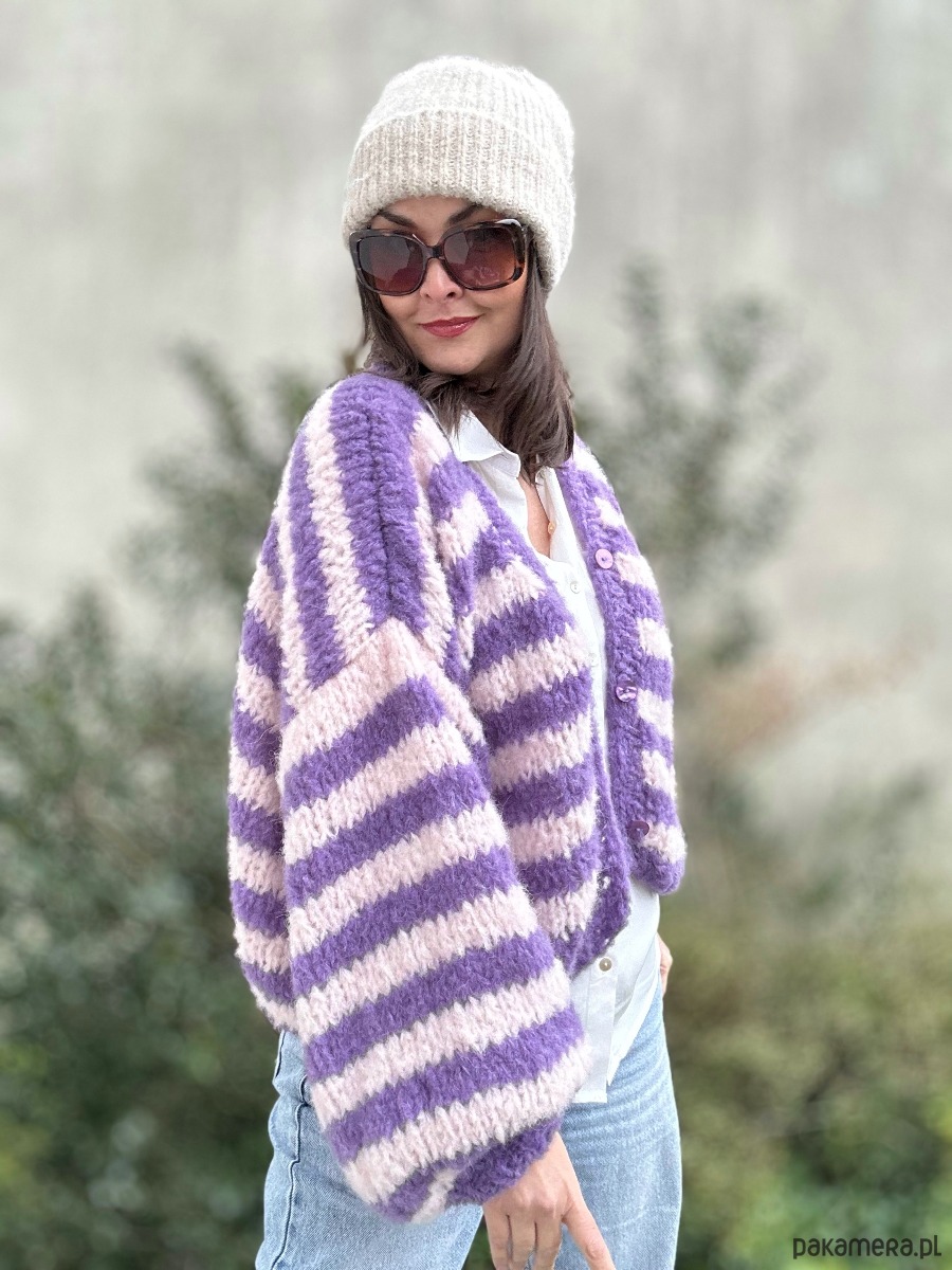 Kardigan Linda to całoroczny kardigan spleciony na drutach z naturalnej włóczki w paski koloru fioletowego i blado różowego. Jest lekki , miękki , puszysty, ma szersze rękawy i można go zapiac na dwa guziczki. Skład:55% alpaka , 40% wełna, 5% nylon.