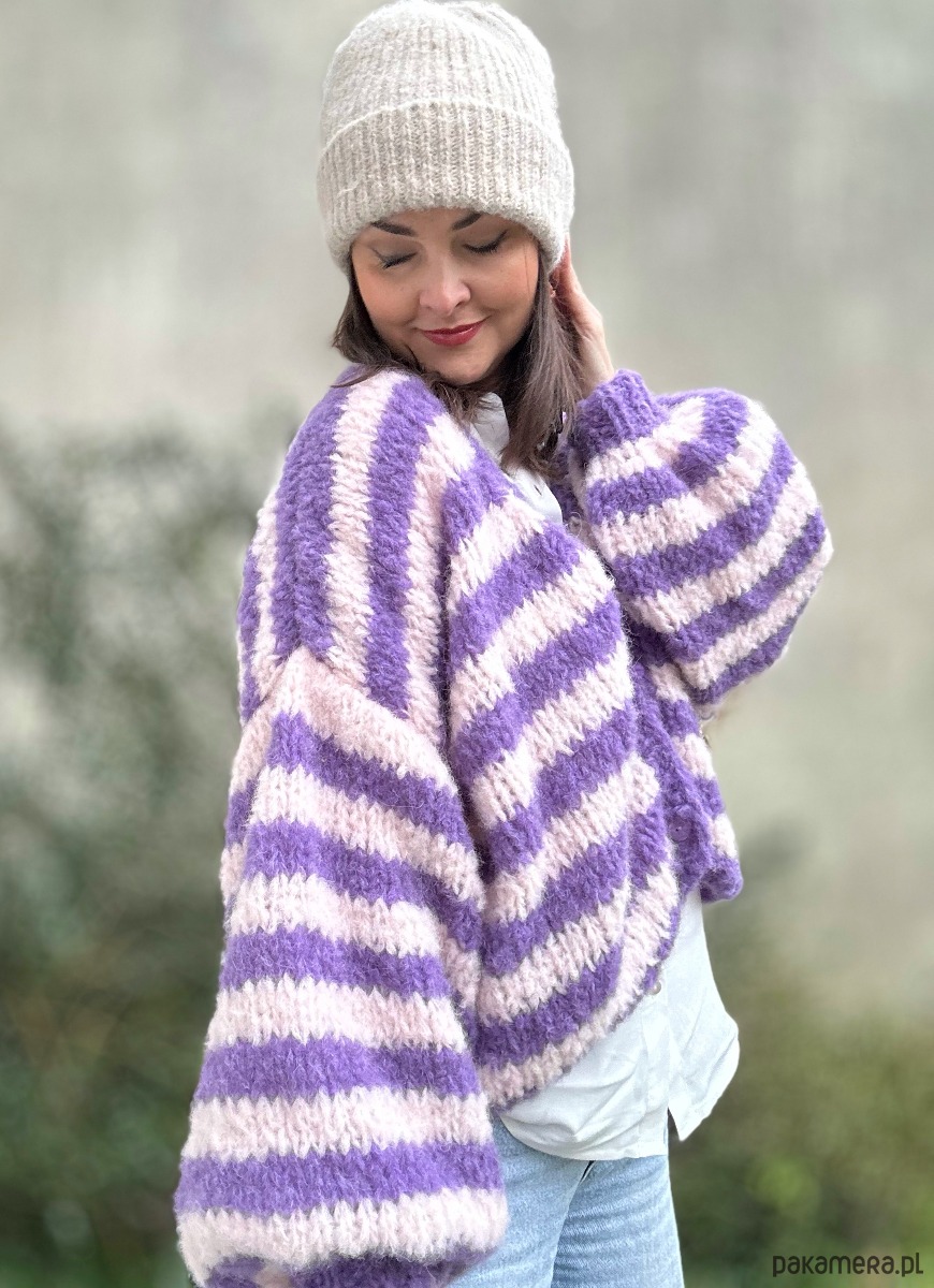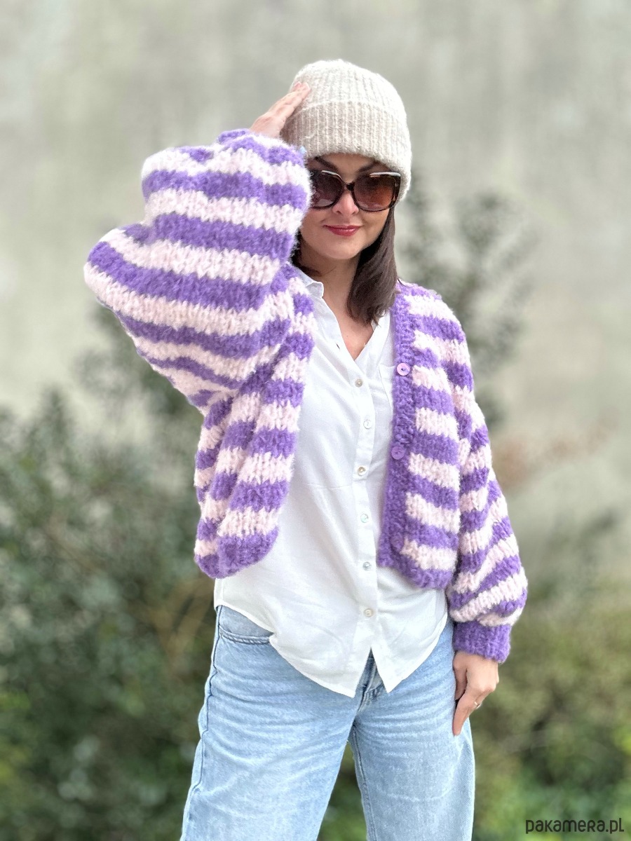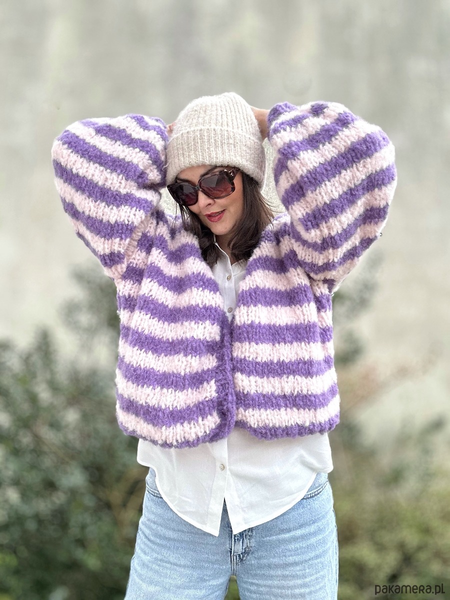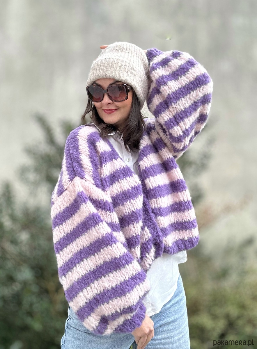 Kardigan Linda to całoroczny kardigan spleciony na drutach z naturalnej włóczki w paski koloru fioletowego i blado różowego. Jest lekki , miękki , puszysty, ma szersze rękawy i można go zapiac na dwa guziczki. Skład:55% alpaka , 40% wełna, 5% nylon.
