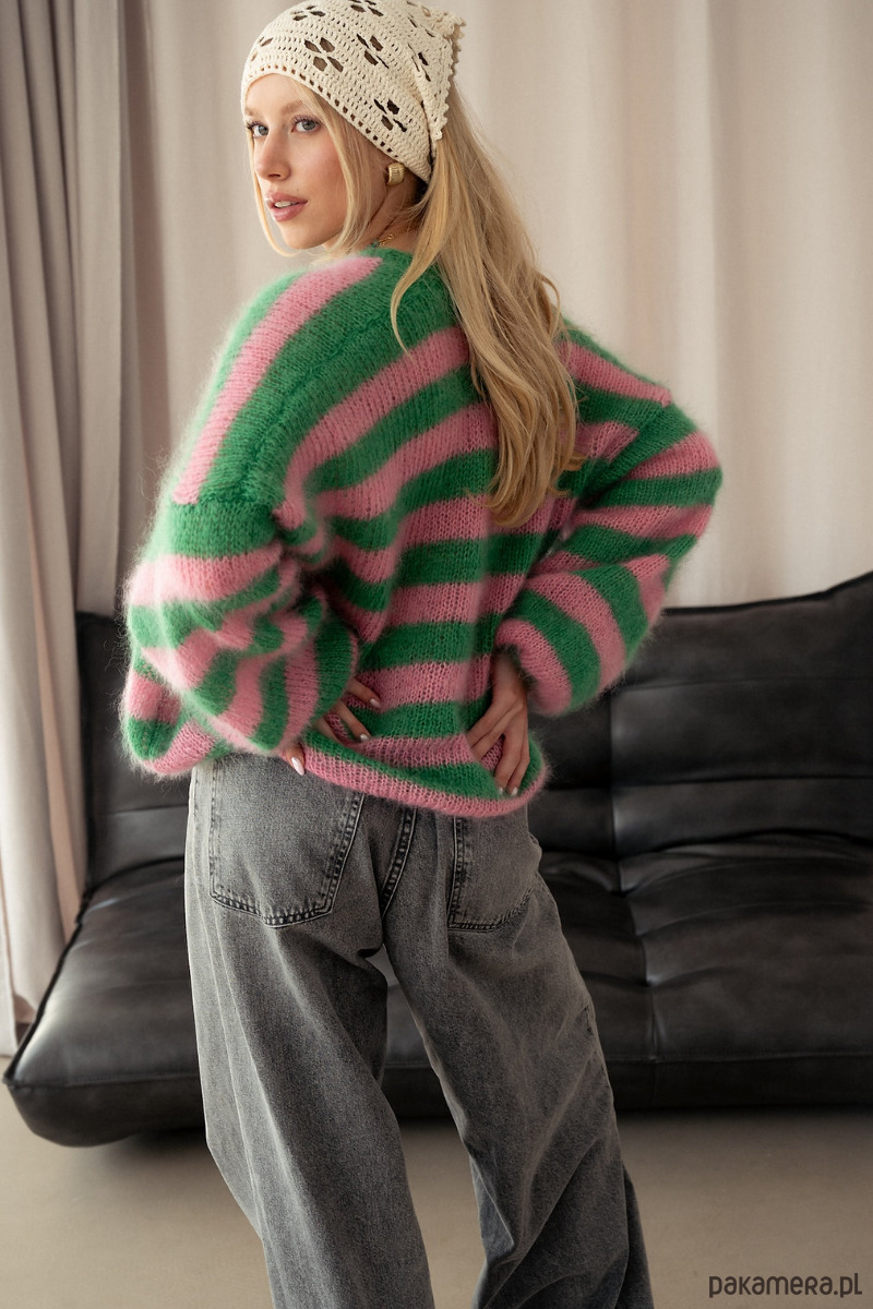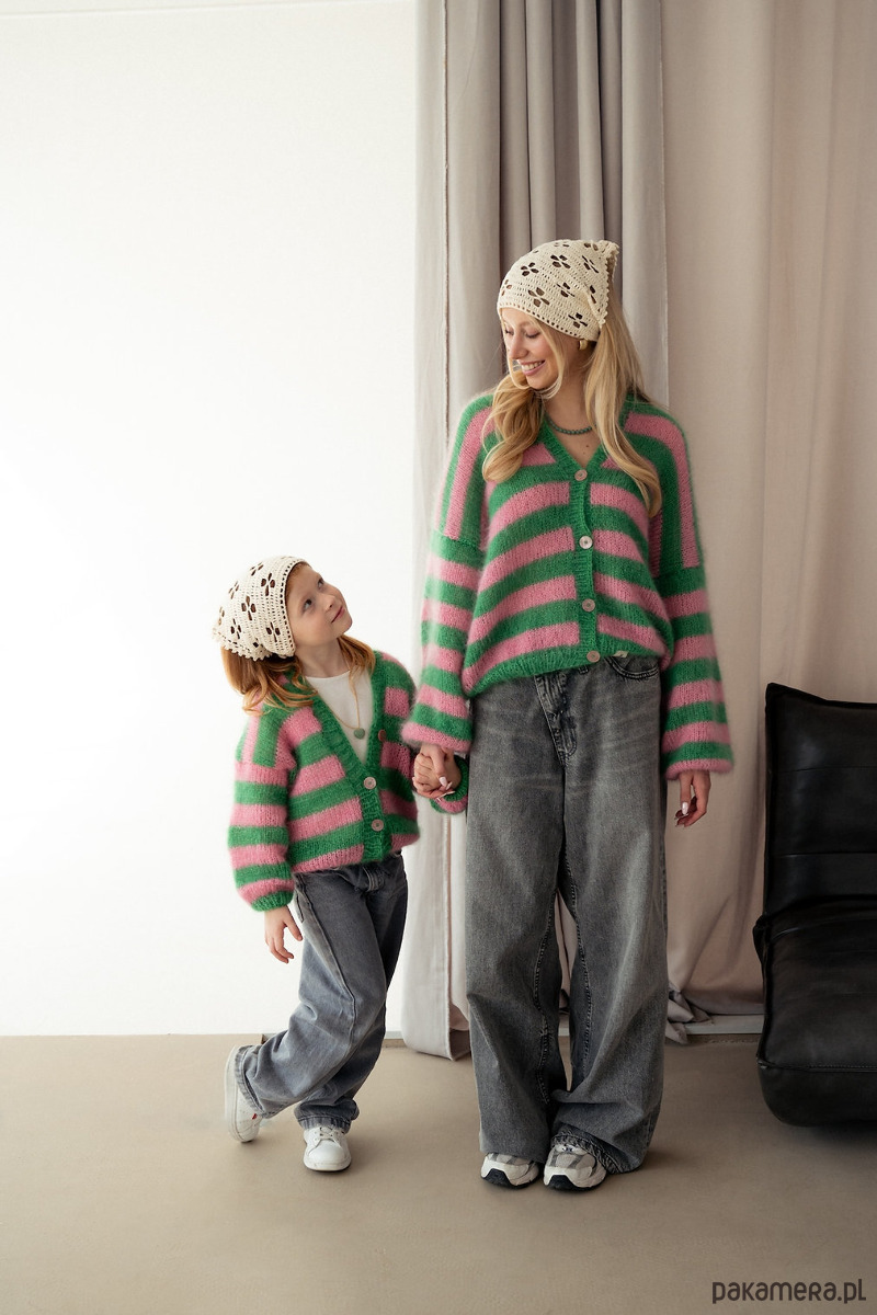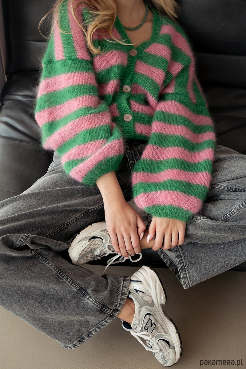 Kardigan Malva to idealny wybór dla miłośniczek ręcznie dzierganych swetrów. Jego połączenie cukierkowego różu z zielenią sprawia, że wygląda przepięknie. Wykonany jest z włochatego i puszystego moheru z dodatkiem delikatnego jedwabiu, co sprawia, że jest nie tylko piękny, ale również miły w dotyku. Bufiste rękawy oraz oversizowy krój nadają mu luźny i wygodny charakter. Zapinany na perłowe rózowe guziki. Cudownie będzie wyglądał w letnich stylizacjach, dodając im niepowtarzalnego uroku i delikatności.