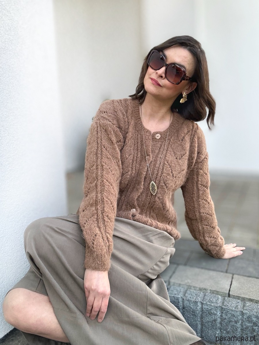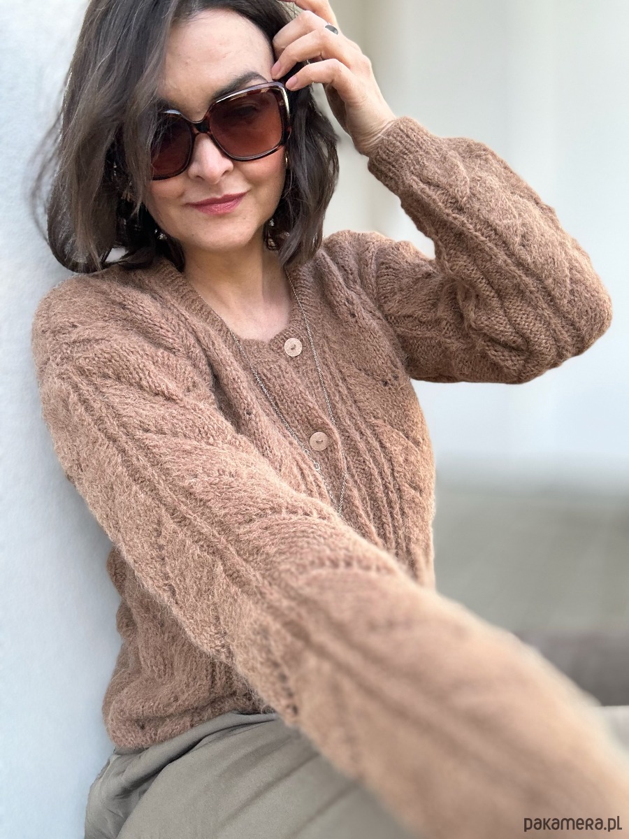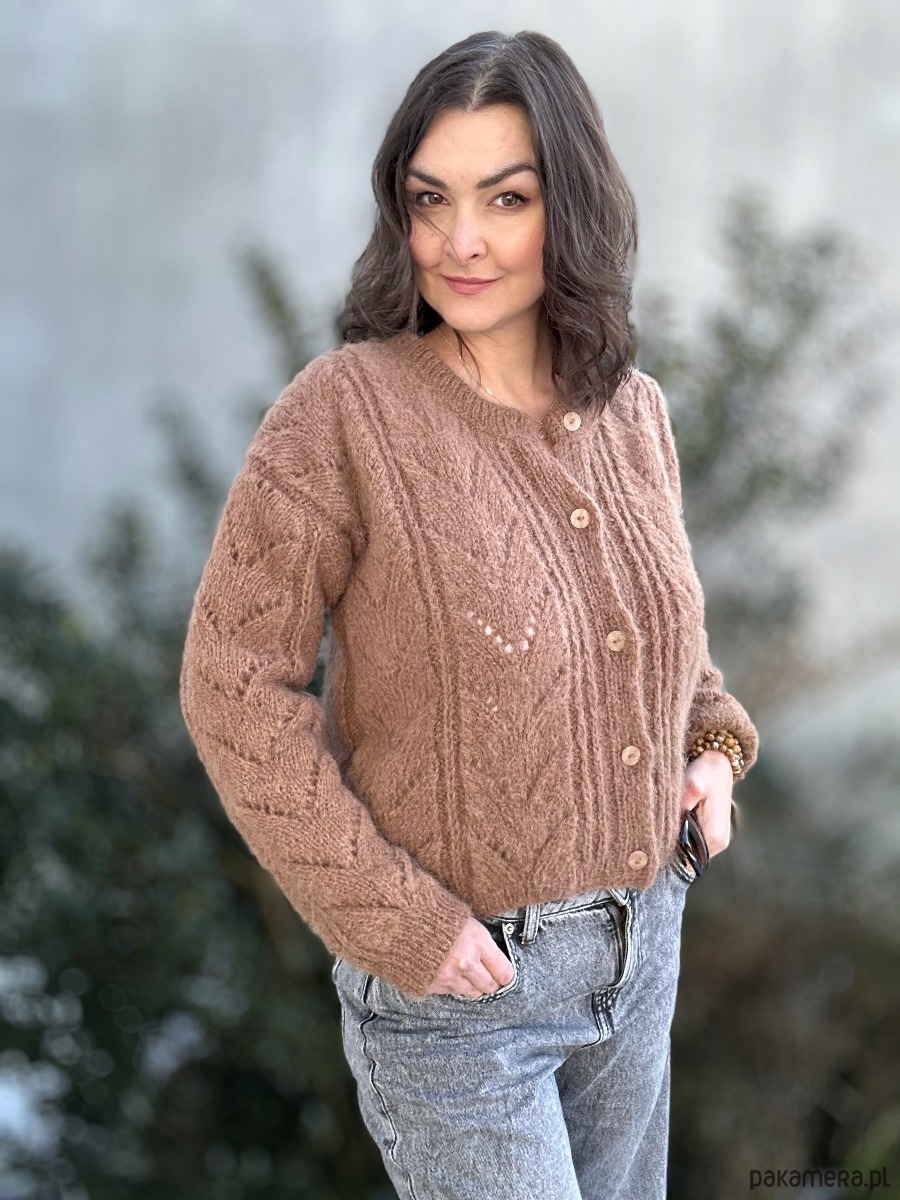 Kardigan Melody of LOVE w modnym kolorze brązu to całoroczna propozycja dla dziewczyn szukających komfortu, stylu, naturalnych włókien. Spleciony ręcznie na drutach , z ażurowymi detalami z przodu sweterka i na rękawach. Zapinany na guziczki. Ma naturalny skład: 71% Alpaka, 25% Wełna, 4% Poliamid