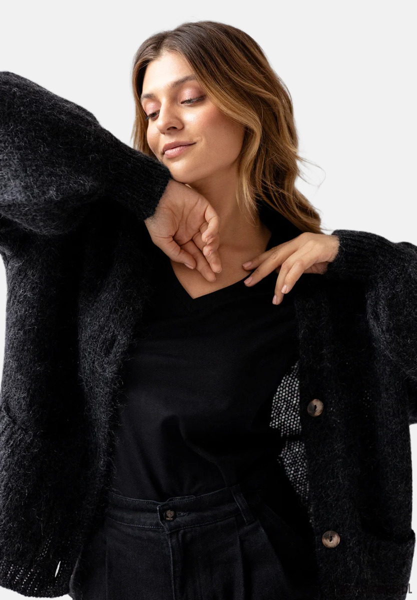 Kardigan Moher Lover otuli Wasze ciało i dopełni stylizacje w chłodniejsze dni. To wszystko zasługa materiału - unikatowej mieszanki wełny merino extrafine, kid moher i polimiadu, dzięki której jest nie tylko niesamowicie przyjemny w dotyku, ale też ma oryginalną, niepłaską fakturę, pięknie podkręcającą stylizacje. Sam poliamid ma w tym przypadku działanie utrwalające i sprawi, że kardigan zostanie z Wami na dłużej i będzie się mniej mechacił.