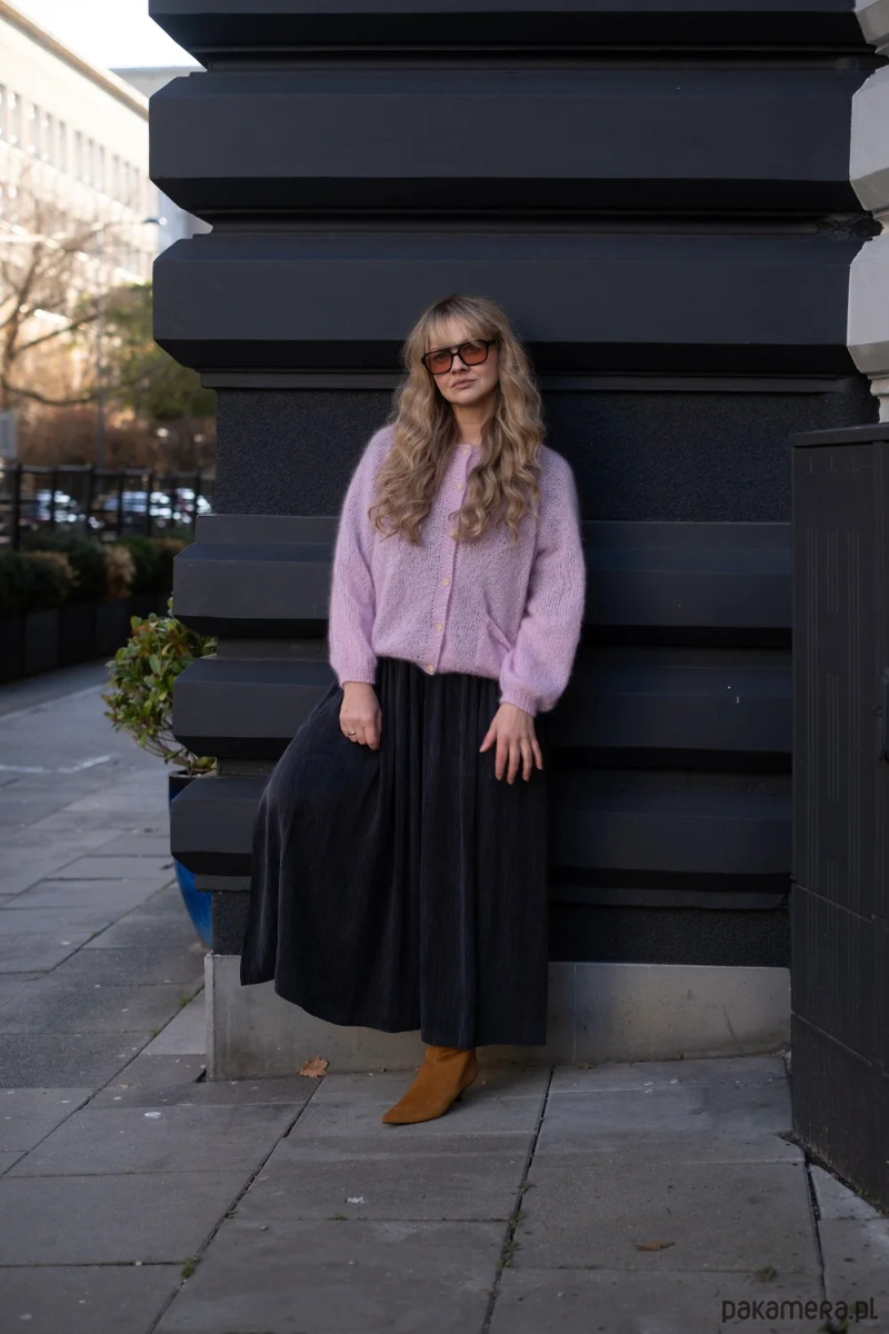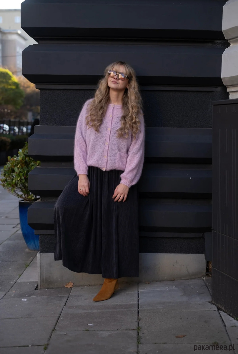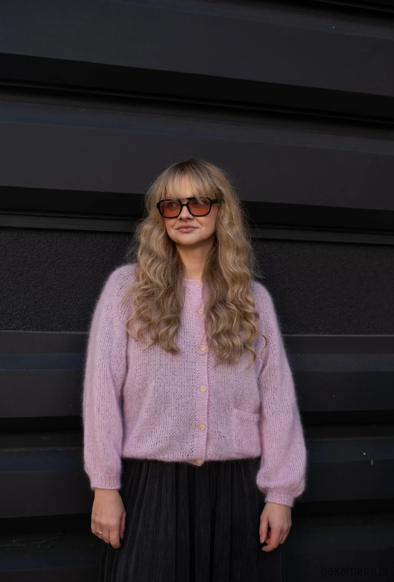 Fason jest prosty i ponadczasowy. Reglanowy krój układa się idealnie na ramionach. Lekko dopasowana forma podkreśla sylwetkę, a rękawy zwężające się ku nadgarstkowi sprawiają, że kardigan świetnie mieści się pod płaszczem lub kurtką. Na przodzie znajduje się mała, delikatna kieszonka dodająca uroku.