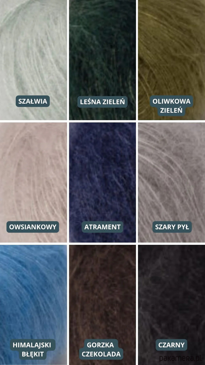 Skład: 61% super kid moher | 24% jedwab morwowy | 15% merino