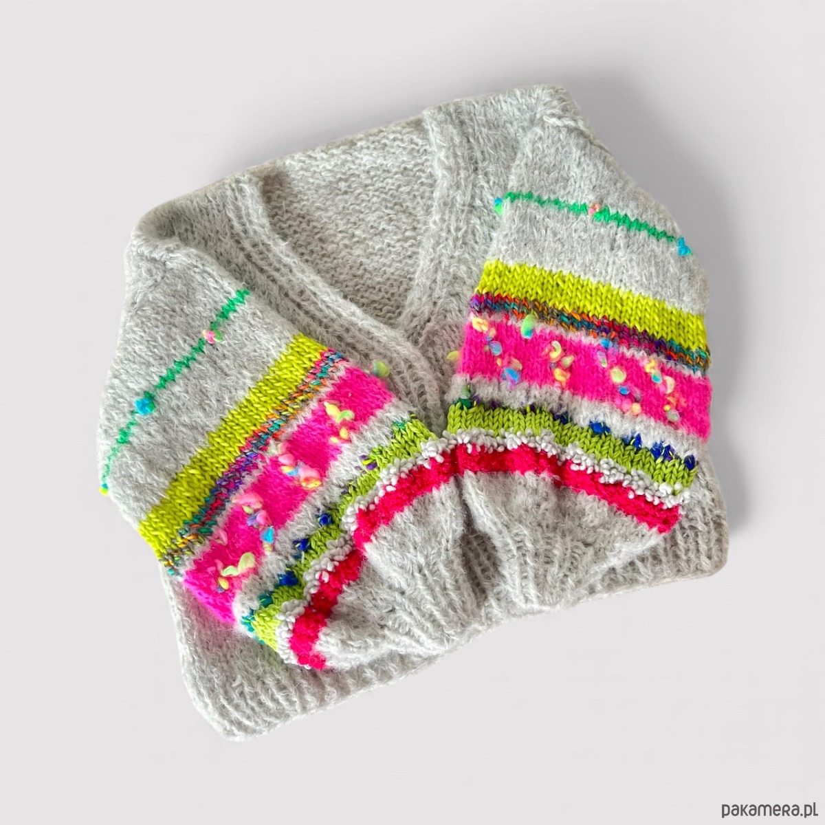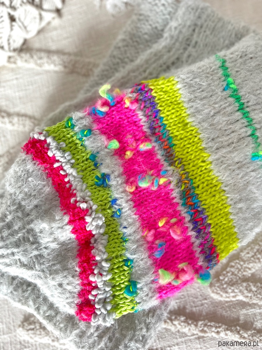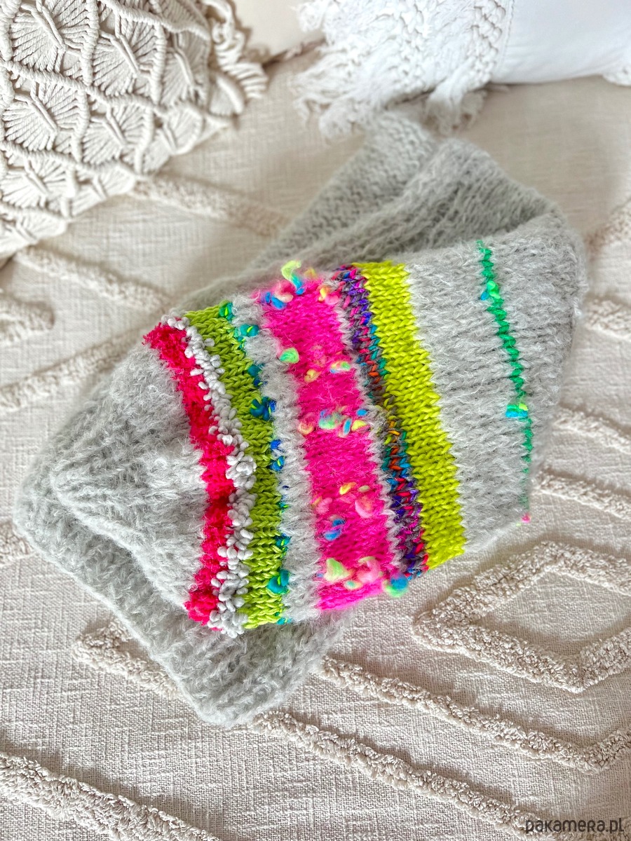 Szary kardigan z ozdobnymi rękawami. Wykonany z dwóch nitek włóczki o składzie 1: 71% alpaka 25% wełna merino i 4% poliamid. W rękawach znajdziemy wiele mieszanek fantazyjnych włóczek (moher, wełna, alpaka, akryl). Kardigan doskonale prezentować się będzie na osobie noszącej rozmiar S-L