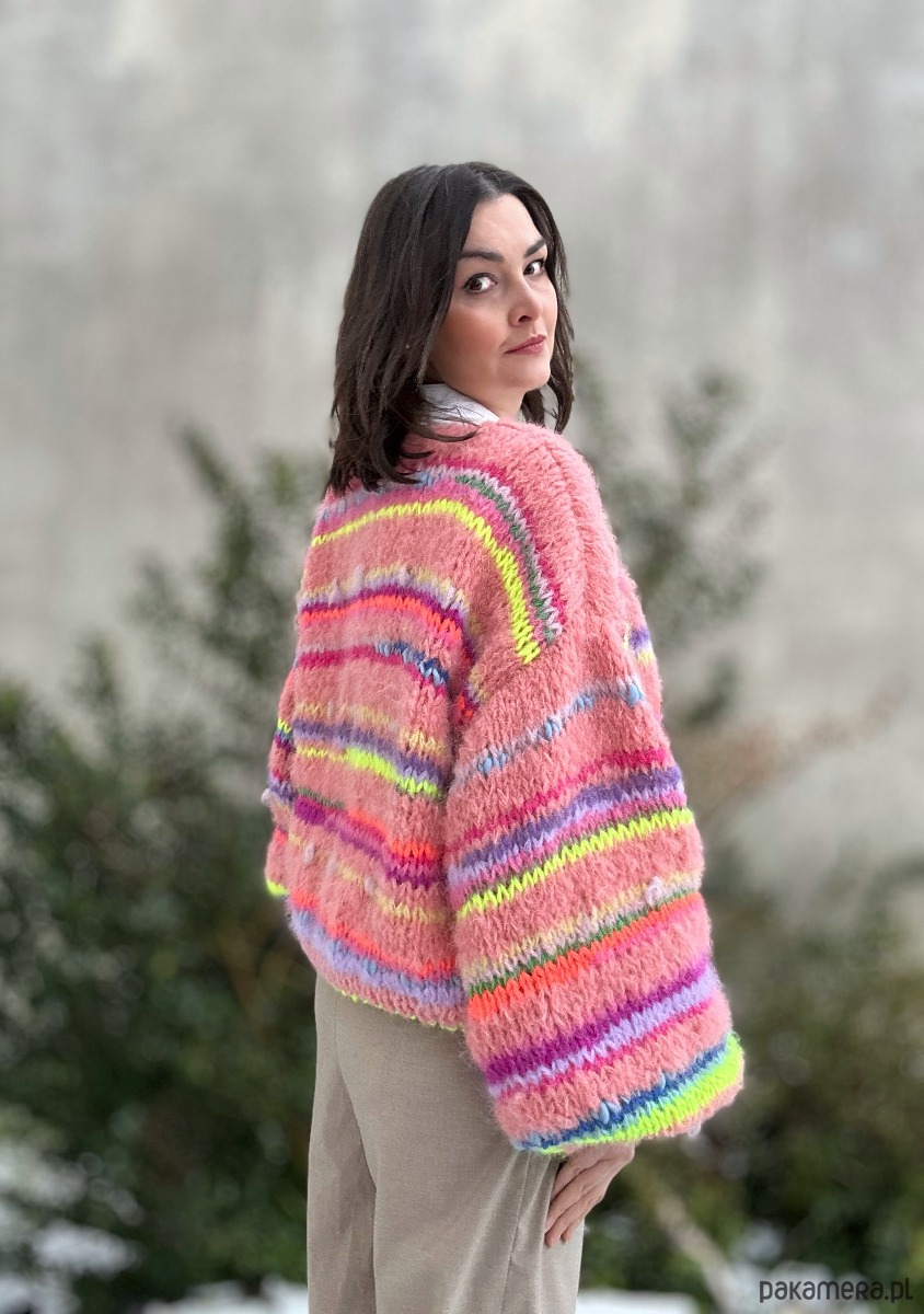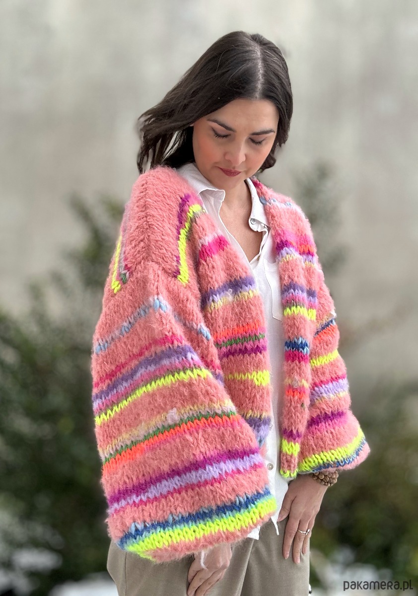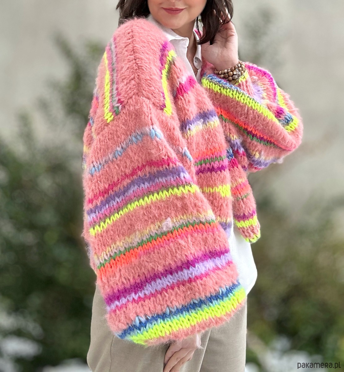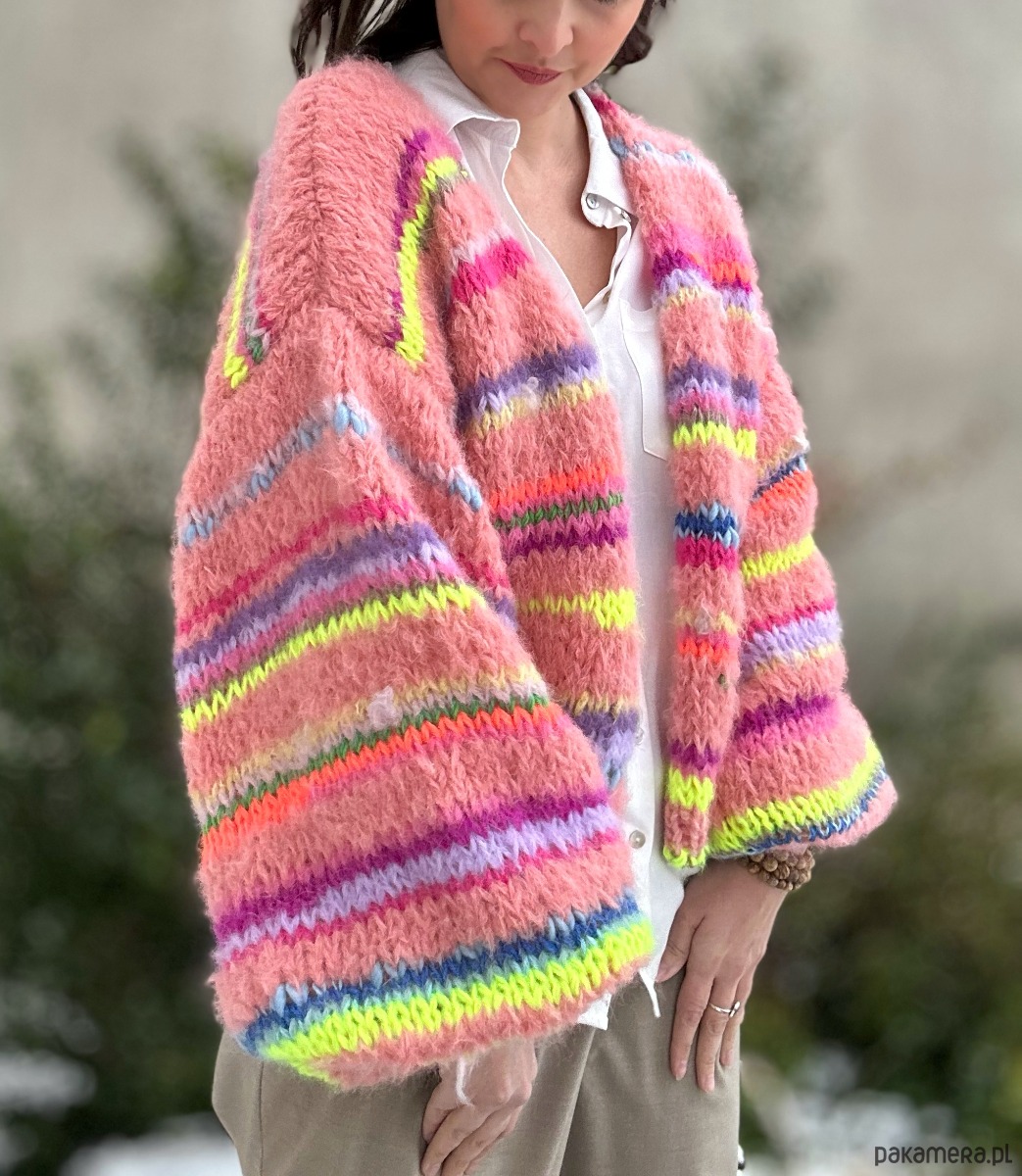 Kardigan Peach Butterfly to energetyczne połączenie włóczek: alpaki, merino, jedwabiu , moheru z minimalną domieszką akrylu. Fantazyjne , neonowe włóczki dodają mu charakteru i oryginalności. Kardigan jest niezwykle kolorowy (w przewagą odcieni brązu), puszysty i cudownie miękki. To całoroczny model , dla kobiet które lubią naturalne materiały, wygodę i uwielbiają być zauważone.