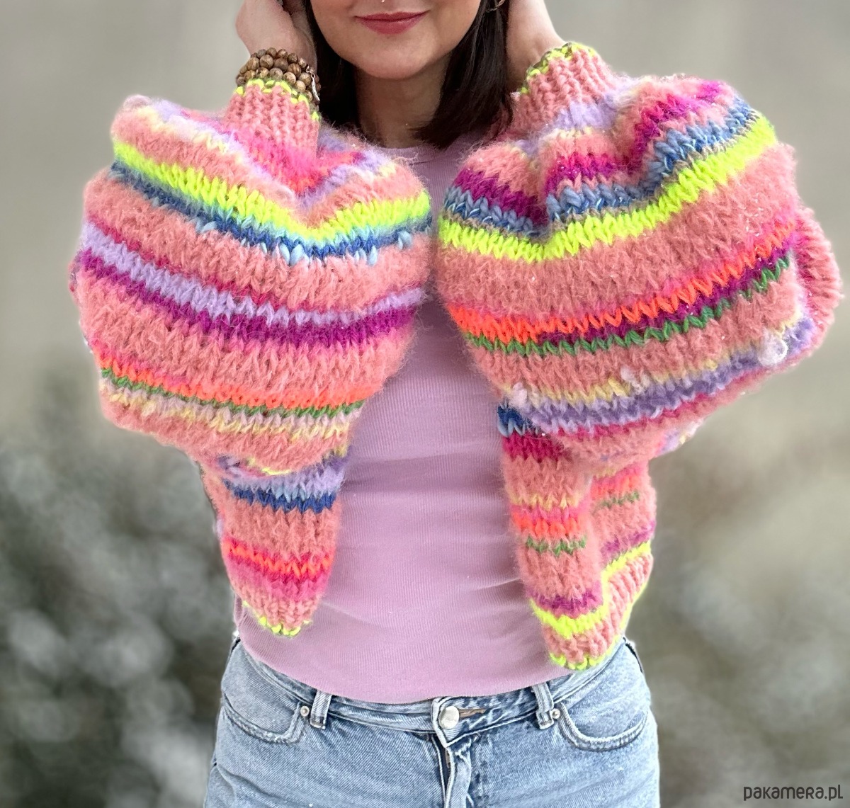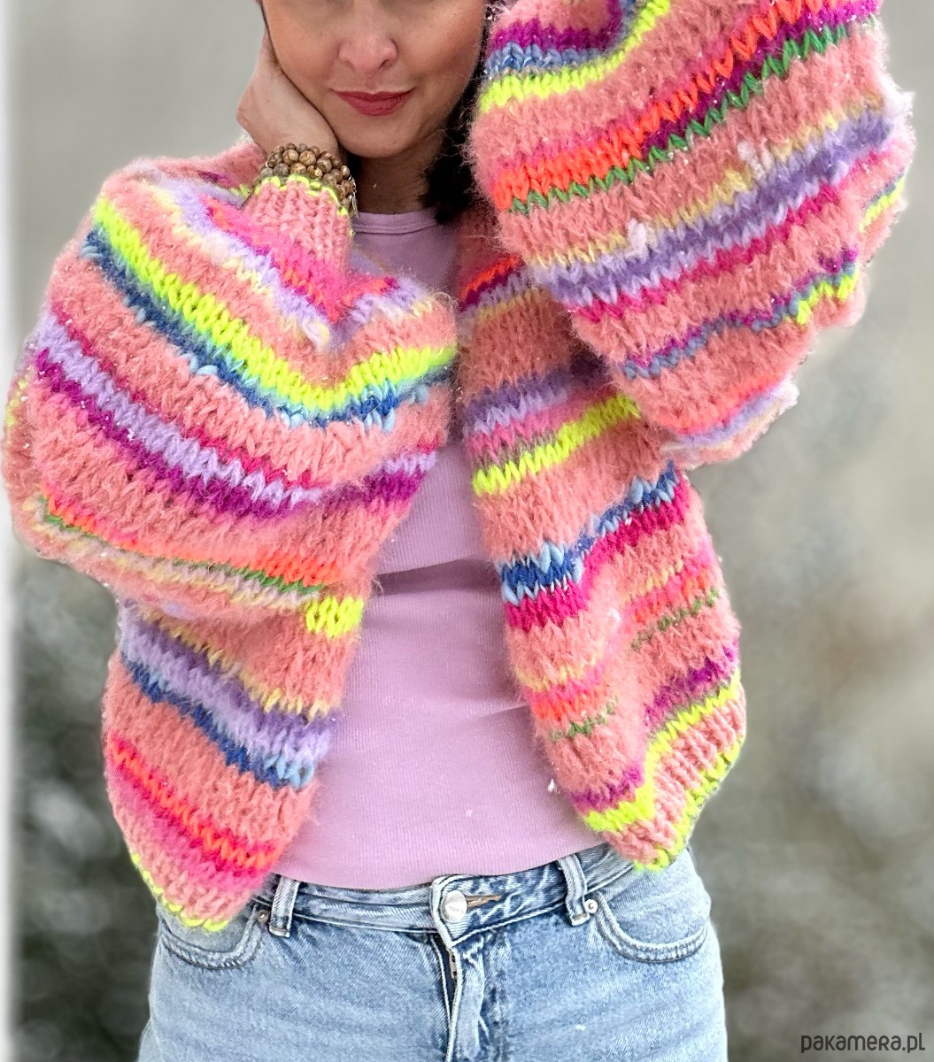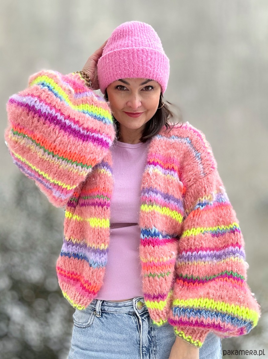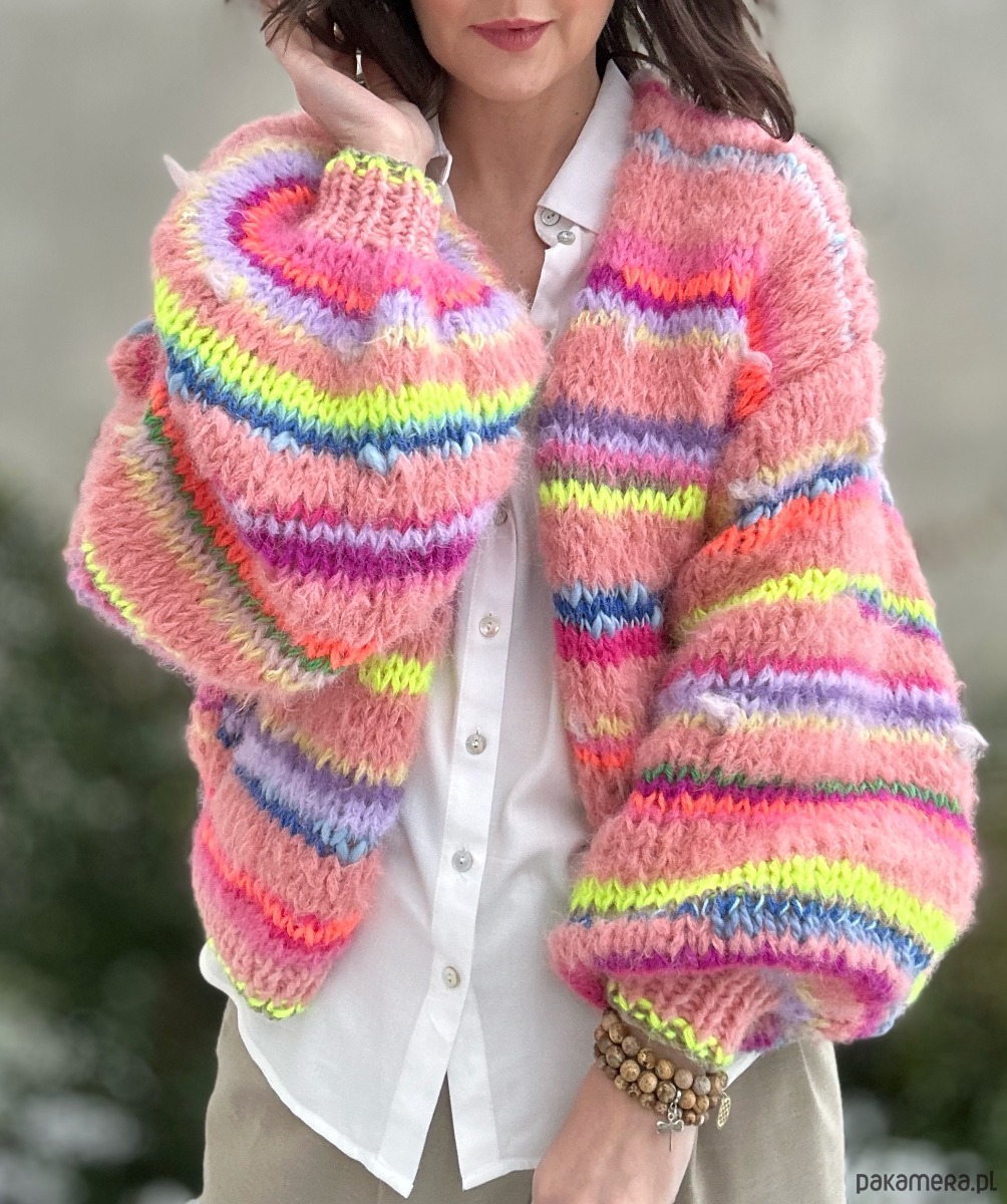 Kardigan Peach Butterfly to energetyczne połączenie włóczek: alpaki, merino, jedwabiu , moheru z minimalną domieszką akrylu. Fantazyjne , neonowe włóczki dodają mu charakteru i oryginalności. Kardigan jest niezwykle kolorowy (w przewagą odcieni brązu), puszysty i cudownie miękki. To całoroczny model , dla kobiet które lubią naturalne materiały, wygodę i uwielbiają być zauważone.