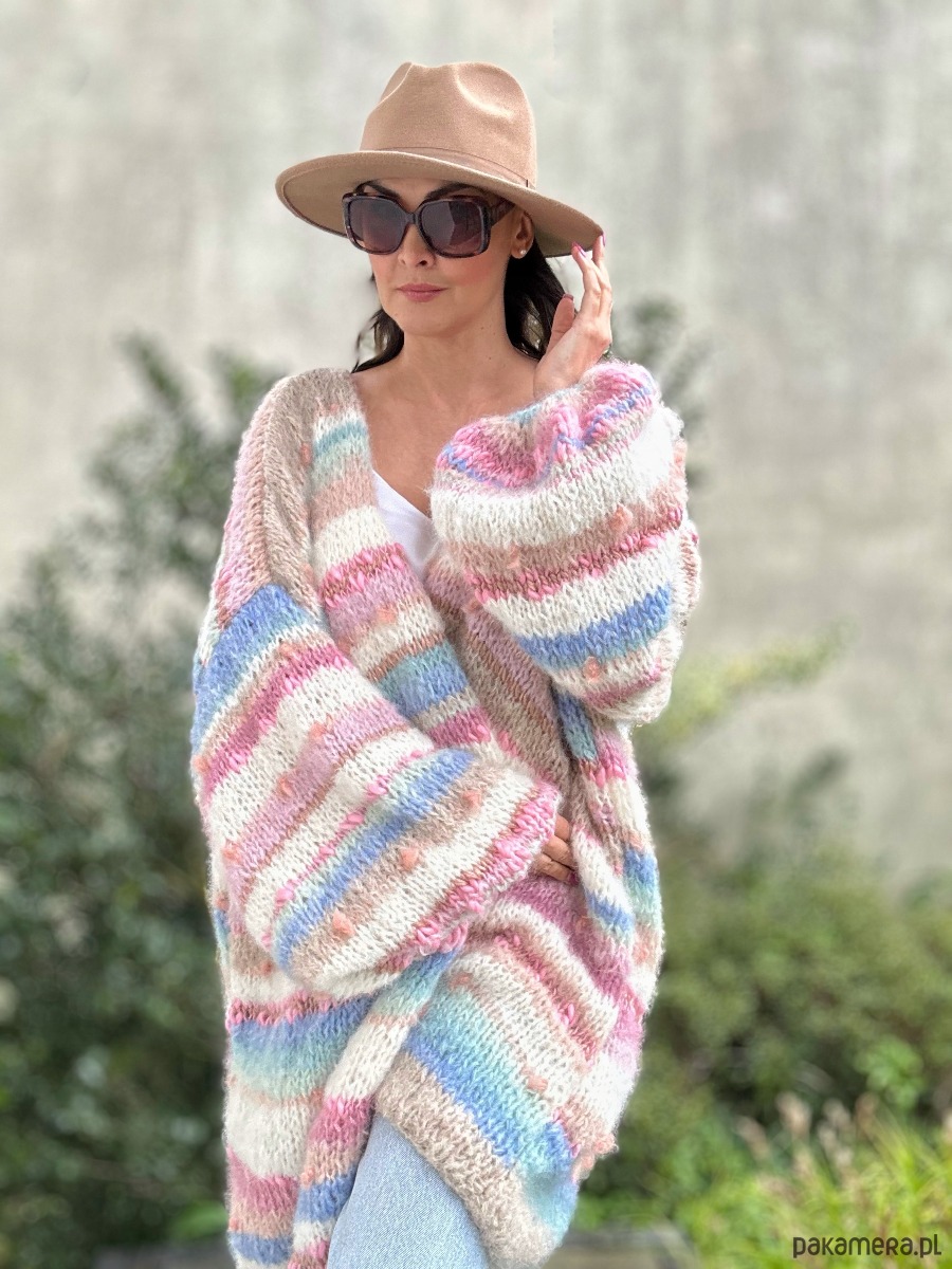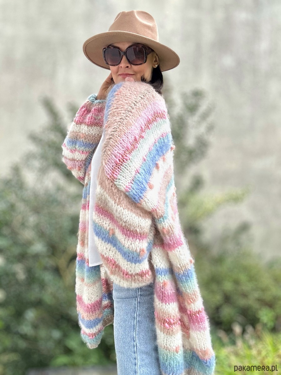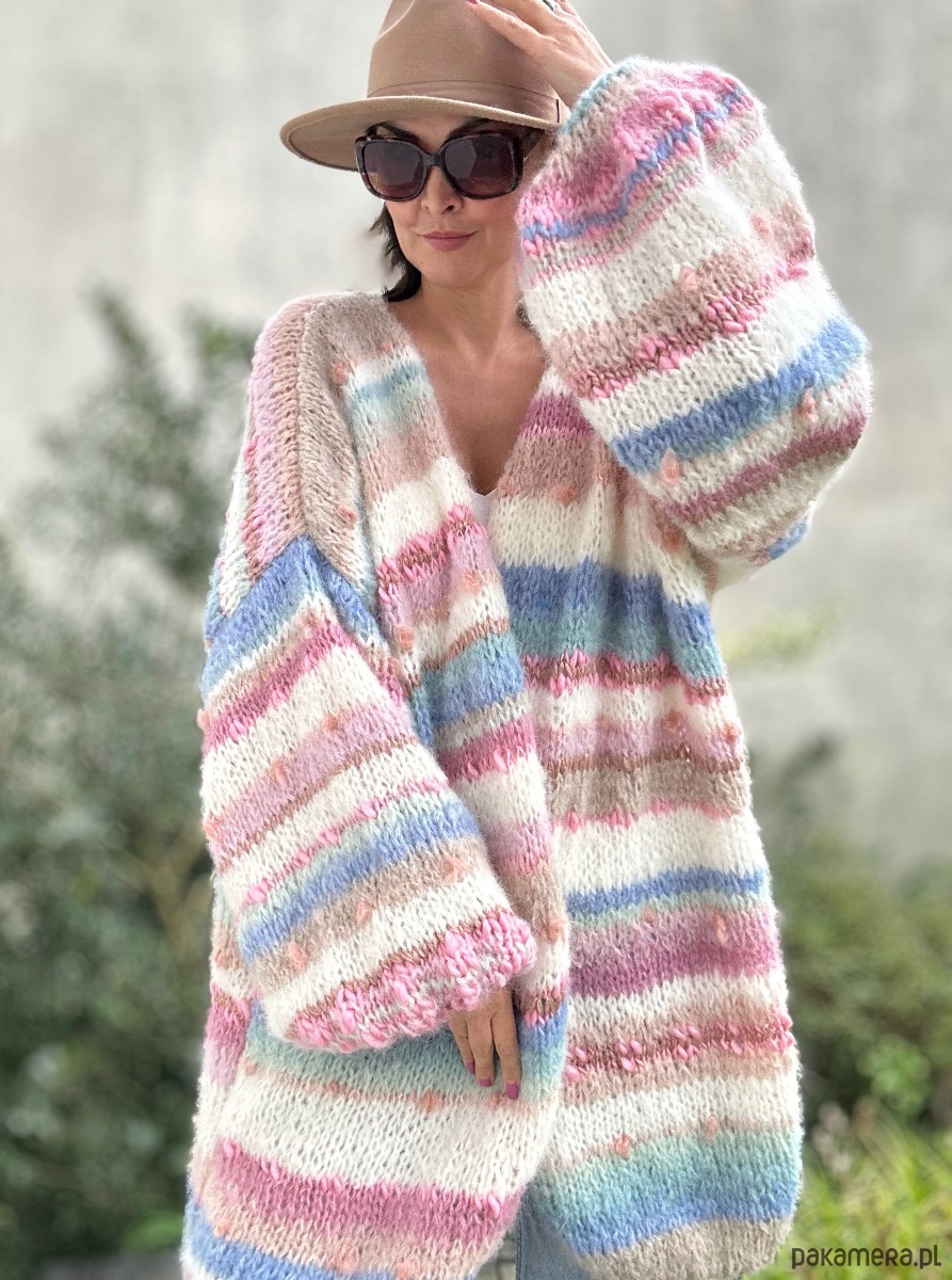 To niezwykłe połączenie delikatnych kolorów w pasach, przechodzących jeden w drugi , urozmaiconych piękną , fantazyjna włóczką. Szerokie rękawy dodają mu uroku, pazurka i oryginalności.