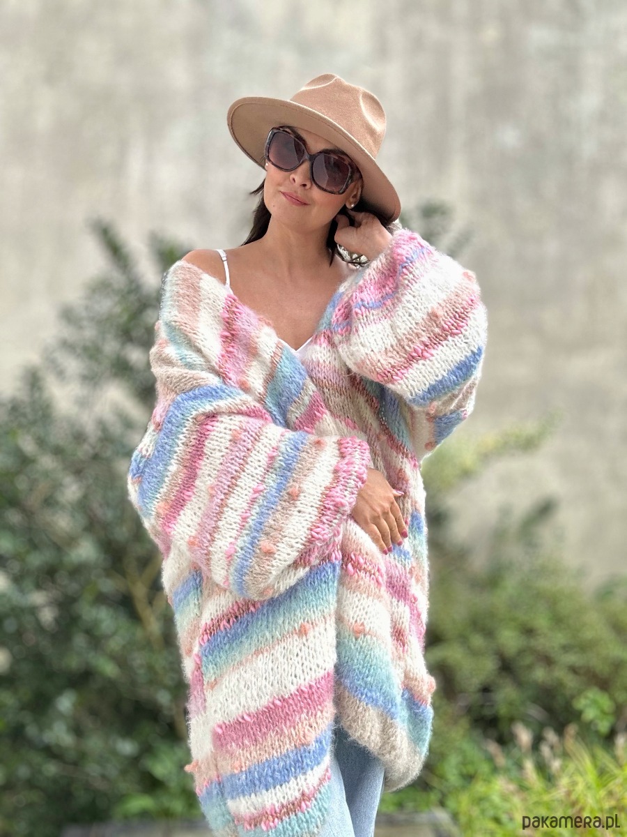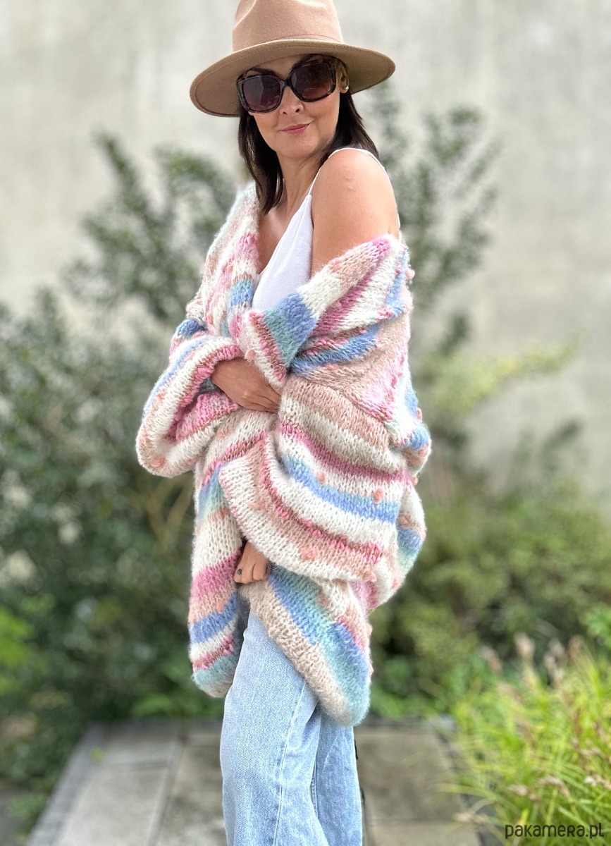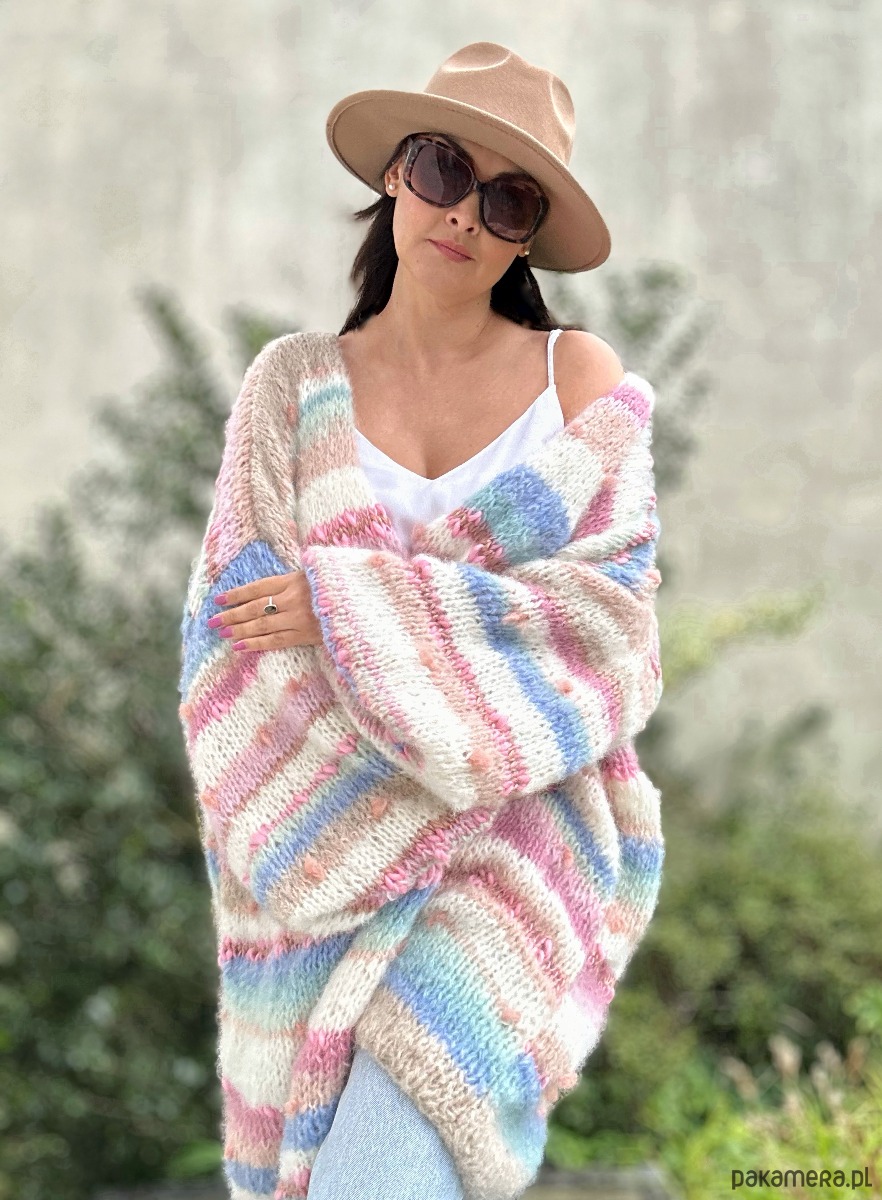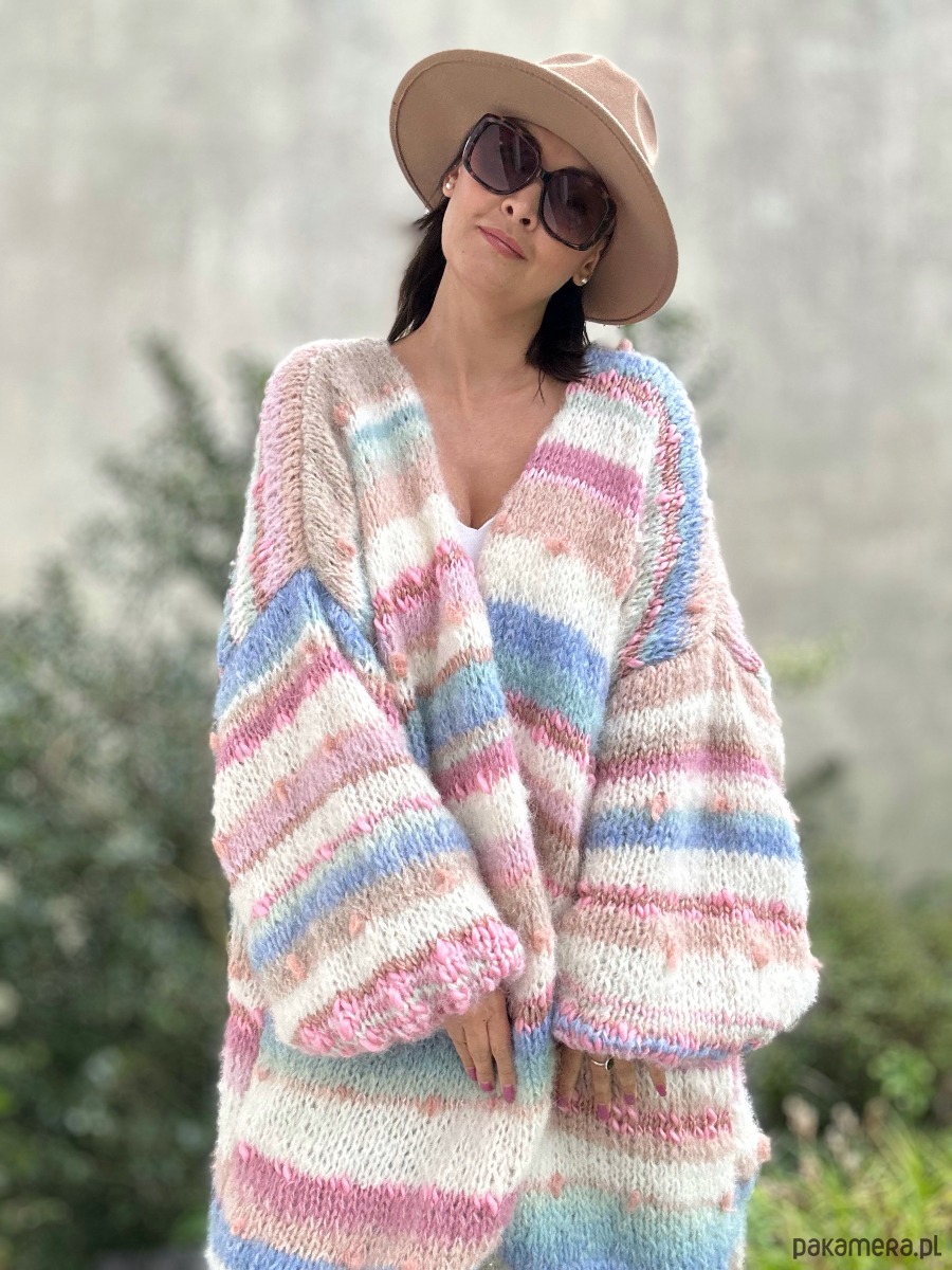 To niezwykłe połączenie delikatnych kolorów w pasach, przechodzących jeden w drugi , urozmaiconych piękną , fantazyjna włóczką. Szerokie rękawy dodają mu uroku, pazurka i oryginalności.