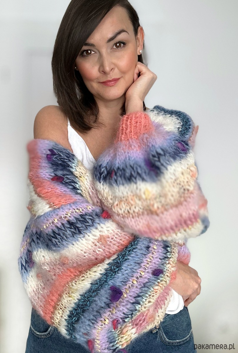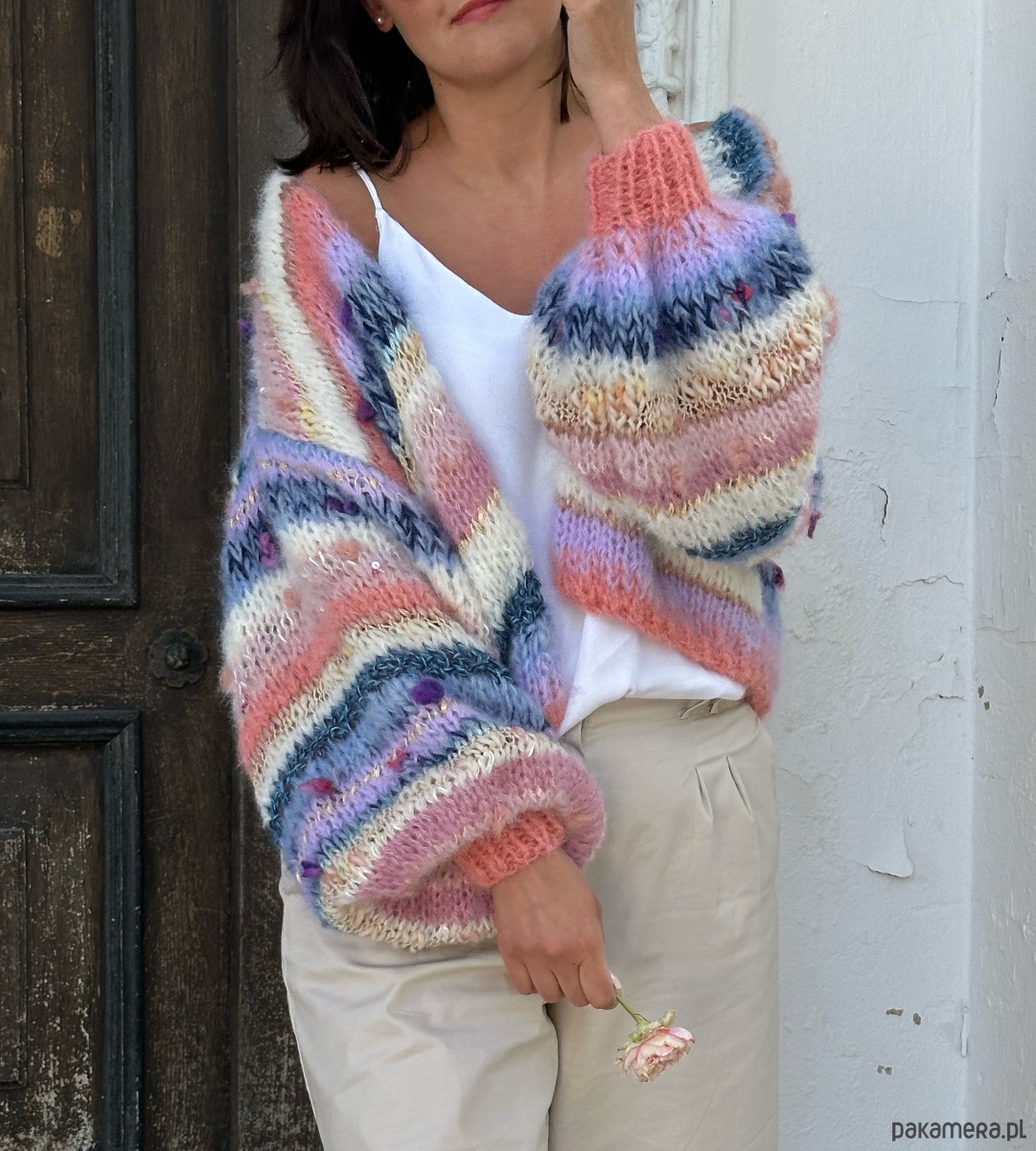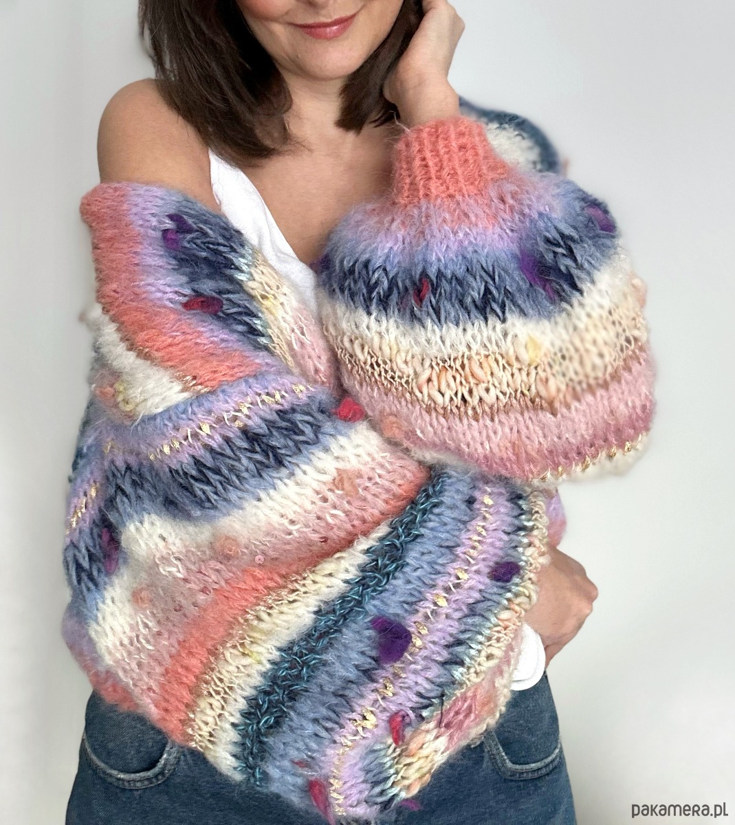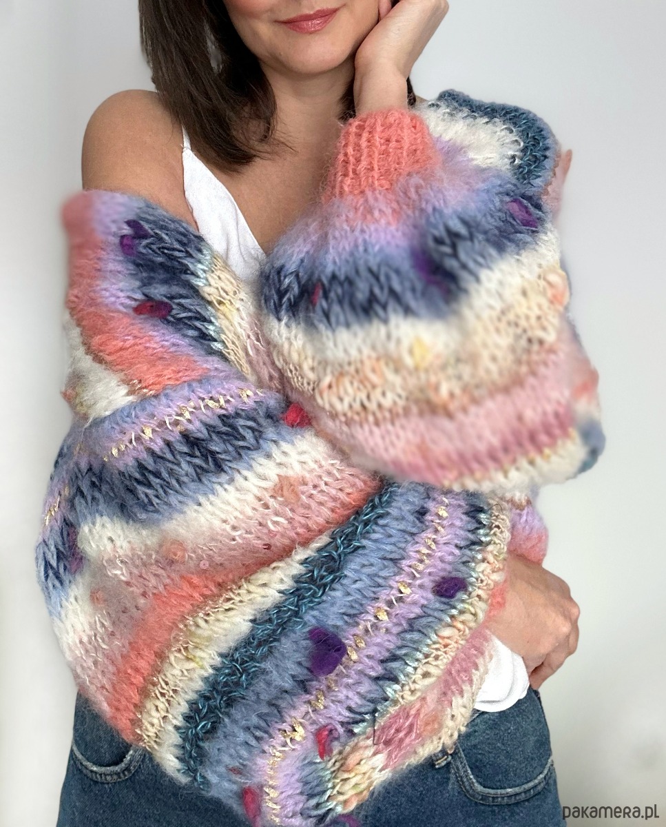 To niezwykłe połączenie delikatnych kolorów w pasach, przechodzących jeden w drugi , urozmaiconych piękną , fantazyjna włóczką. Szerokie rękawy dodają mu uroku, pazurka i oryginalności.