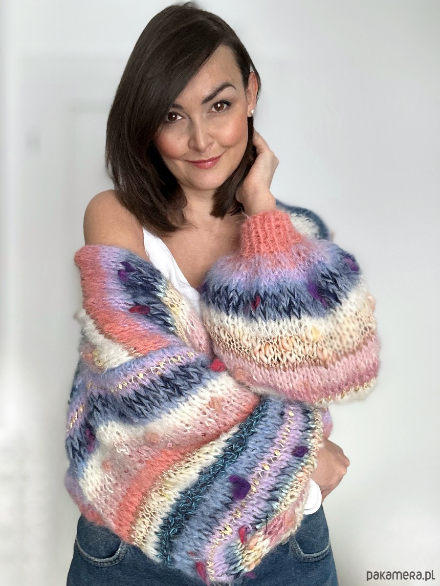 Kardigan Perla spleciony ręcznie na drutach z mieszanki włóczek alpaki, merino, jedwabiu oraz moheru urozmaicony przepiękną włóczką fantazyjną.