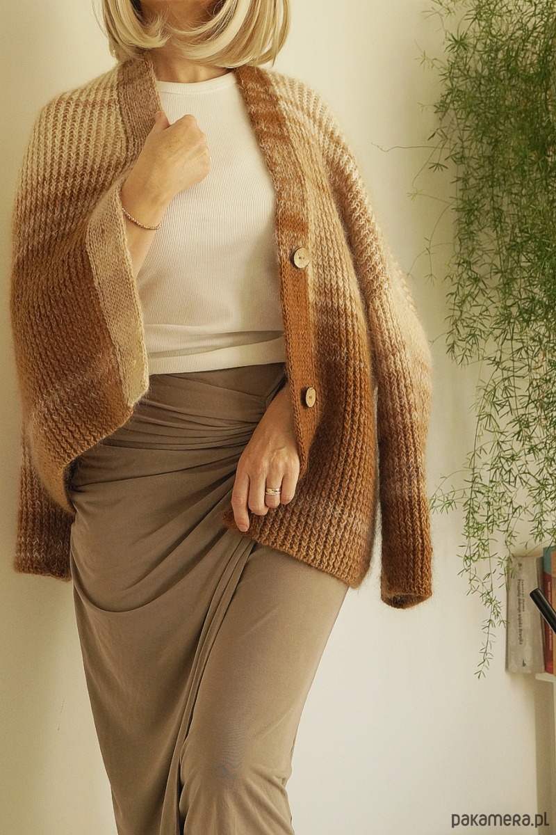 Kardigan o luźnej formie z nieco obniżoną linią rękawów, lekki dekolt w serek, zapięcie na naturalne guziki z kokosa.