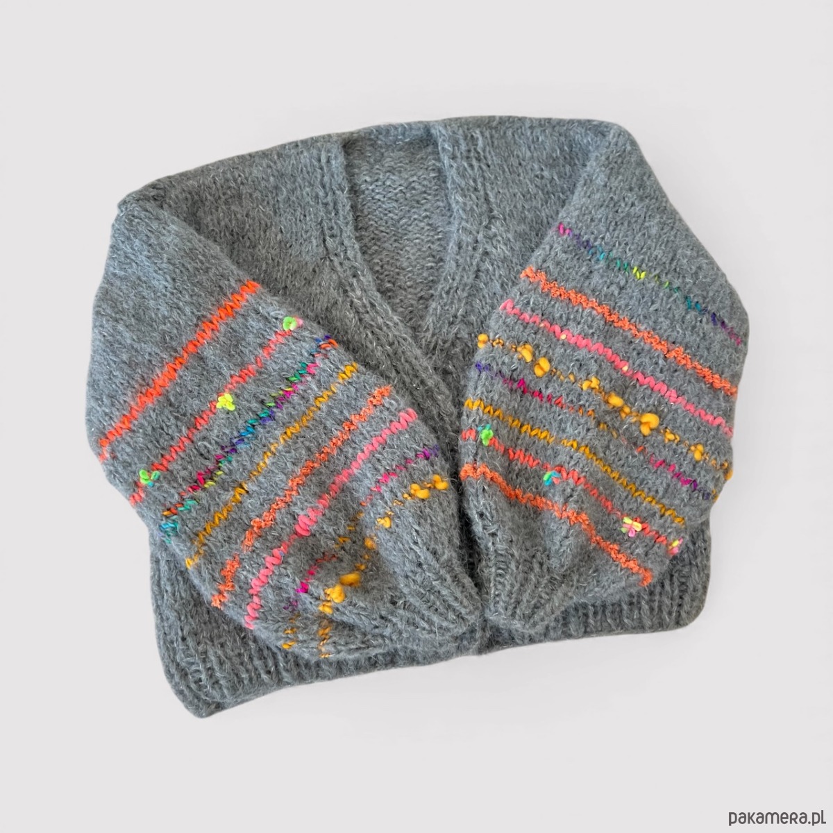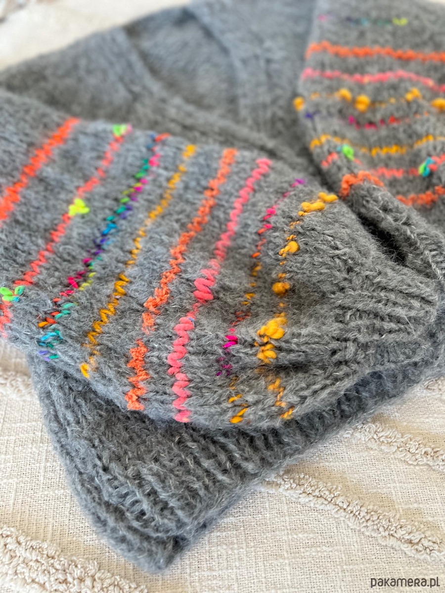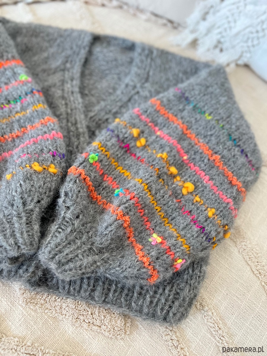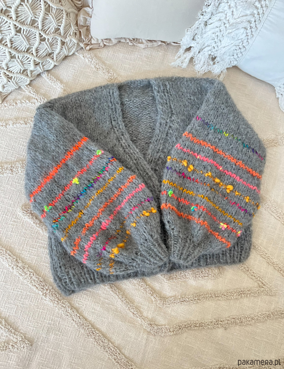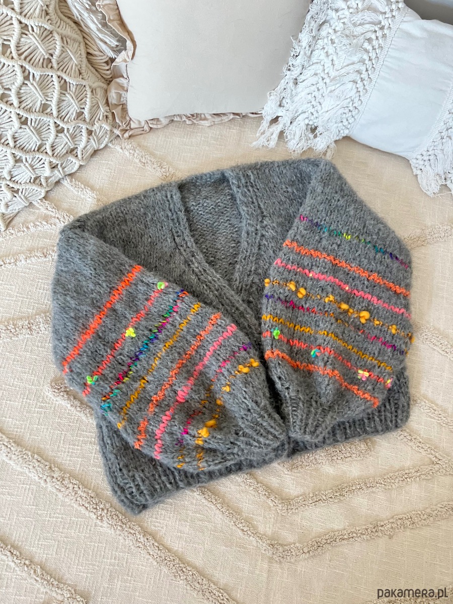 Grafitowy kardigan z ozdobnymi rękawami. Wykonany z dwóch nitek włóczki o składzie 1: 71% alpaka 25% wełna merino i 4% poliamid. W rękawach znajdziemy wiele mieszanek fantazyjnych włóczek (moher, wełna, alpaka, akryl). Kardigan doskonale prezentować się będzie na osobie noszącej rozmiar S-L