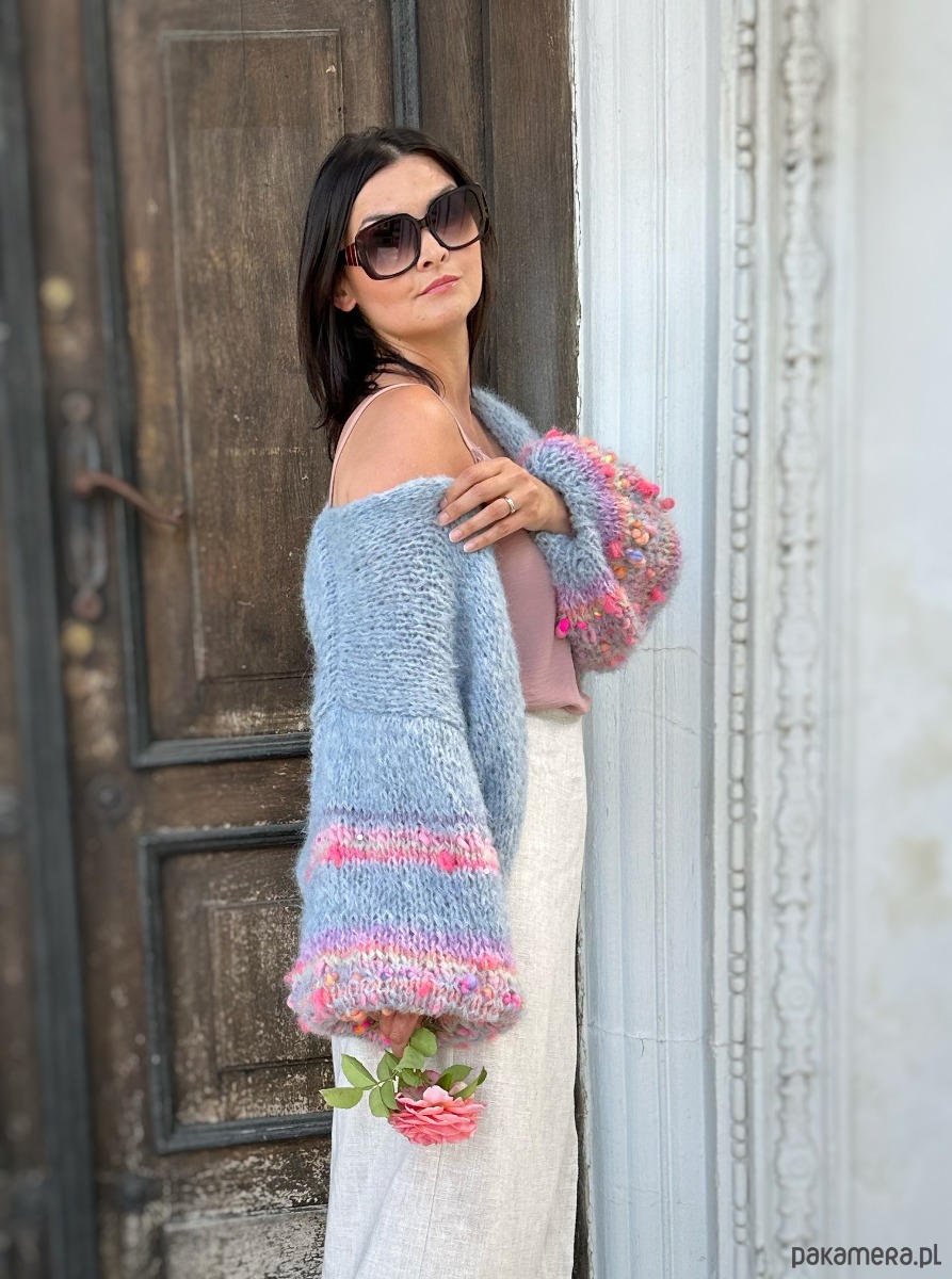 Lekki , przewiewny i efektowny kardigan Selena to przepiękna propozycja na wiosenno letni czas. Kardigan ma szerokie rękawy, z dodatkiem efektownych i fantazyjnych włóczek. Kardigan jest w pięknym , odcieniu spokojnego, zgaszonego błękitu Kobiecy i oryginalny. Spleciony jest z naturalnych włóczek (podwójna nitka).