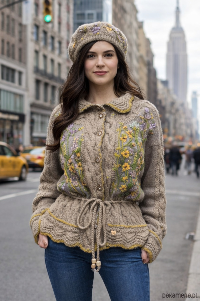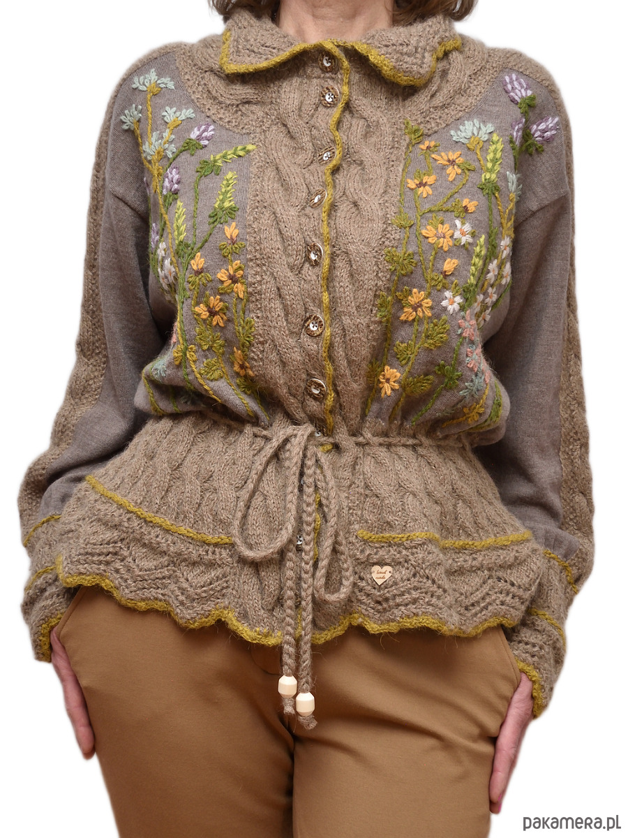 Kardigan nugatowy, z warkoczami i haftowanymi motywami kwiatowymi, wykonany z sercem i dbałością o detale.