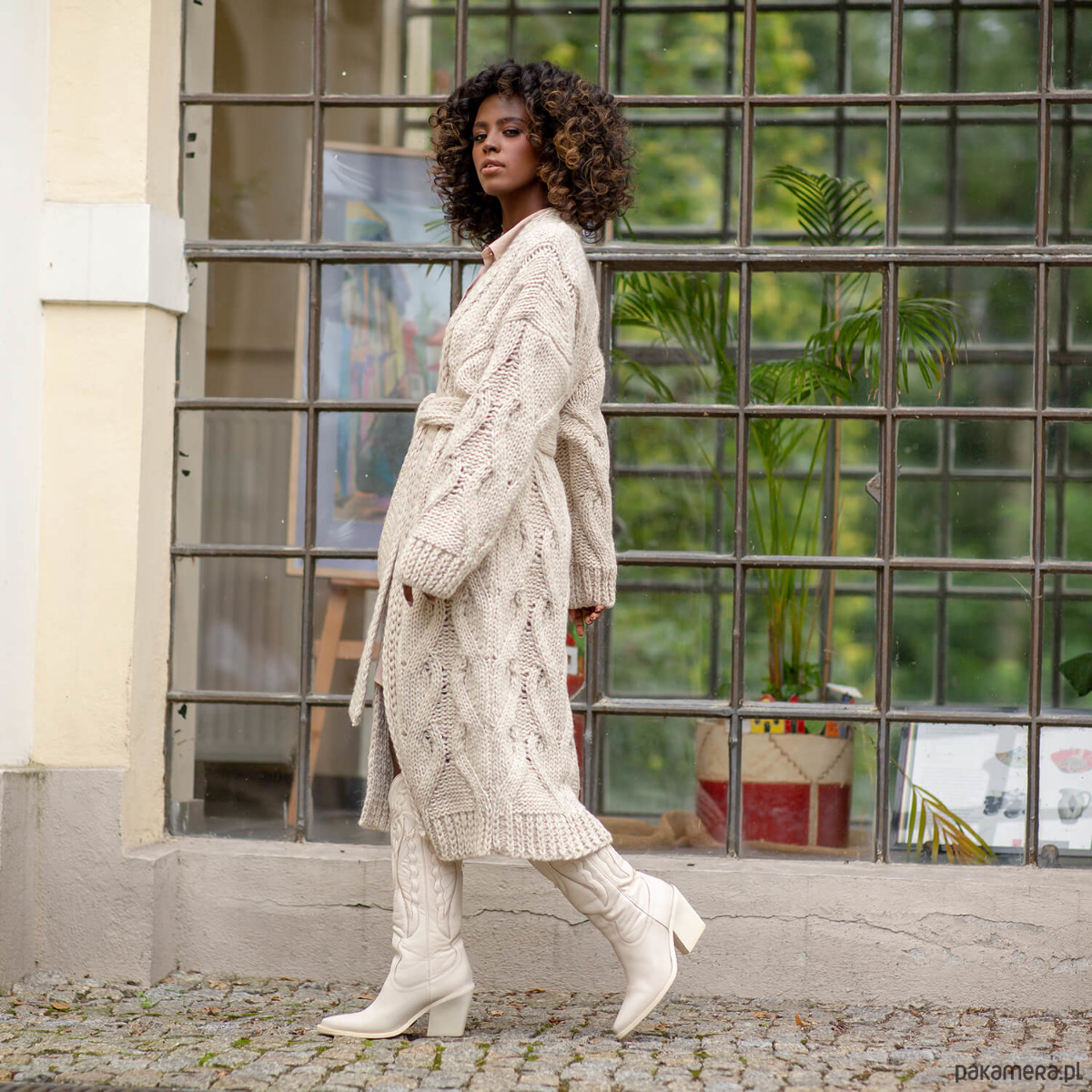 Długi kardigan o pięknym splocie stworzonym w naszej pracowni. Wygodny, stylowy i ciepły - przewiązany w pasie zyskuje charakter trencza. Noszony luźno ma wygodny oversizowy fason. Jego forma została tak skonstruowana, aby jak najlepiej układał się na sylwetce i dawał efekt grubego trencza. Pasek w zestawie.