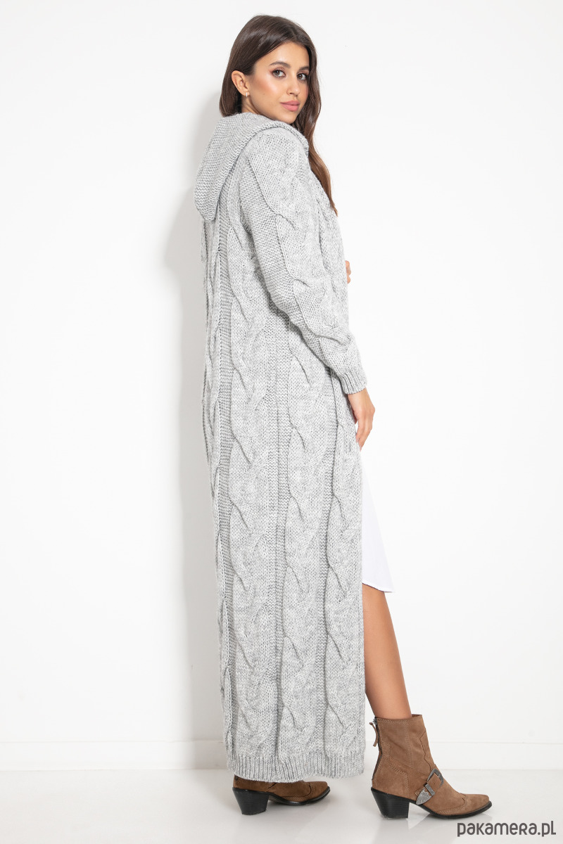 Niezwykle stylowy, ciepły i wygodny kardigan z wzorem grubych warkoczy i dużym kapturem.