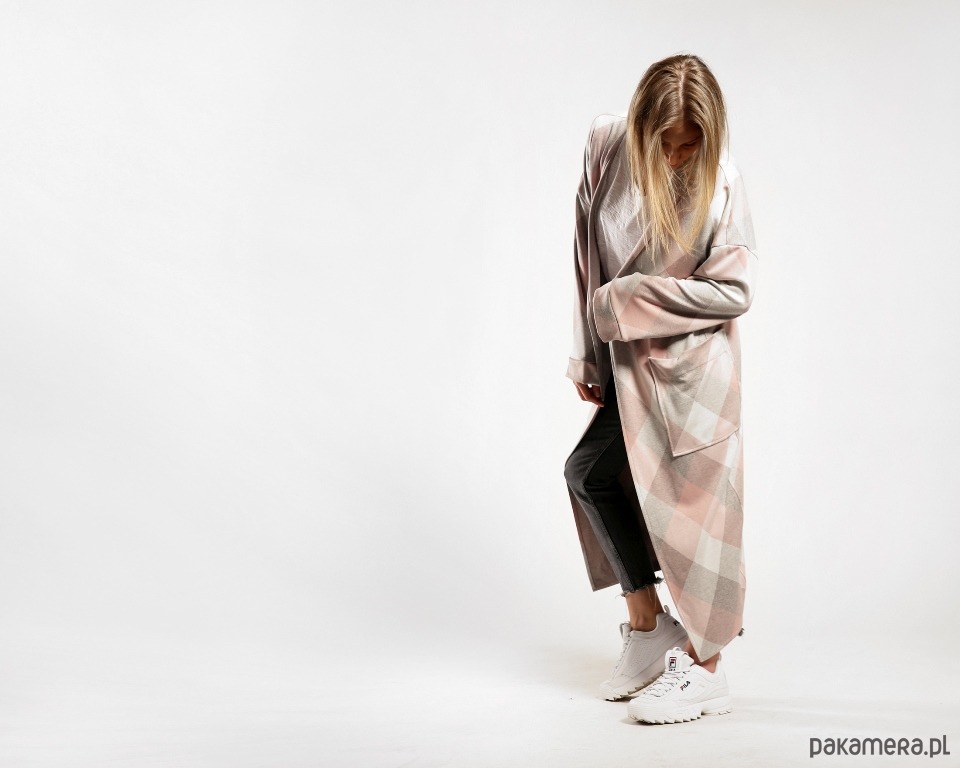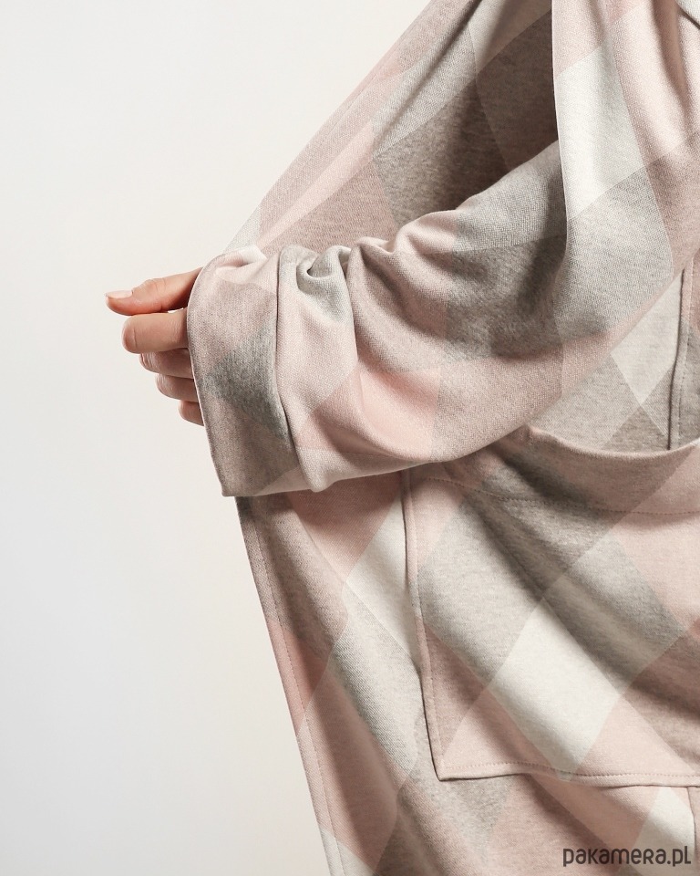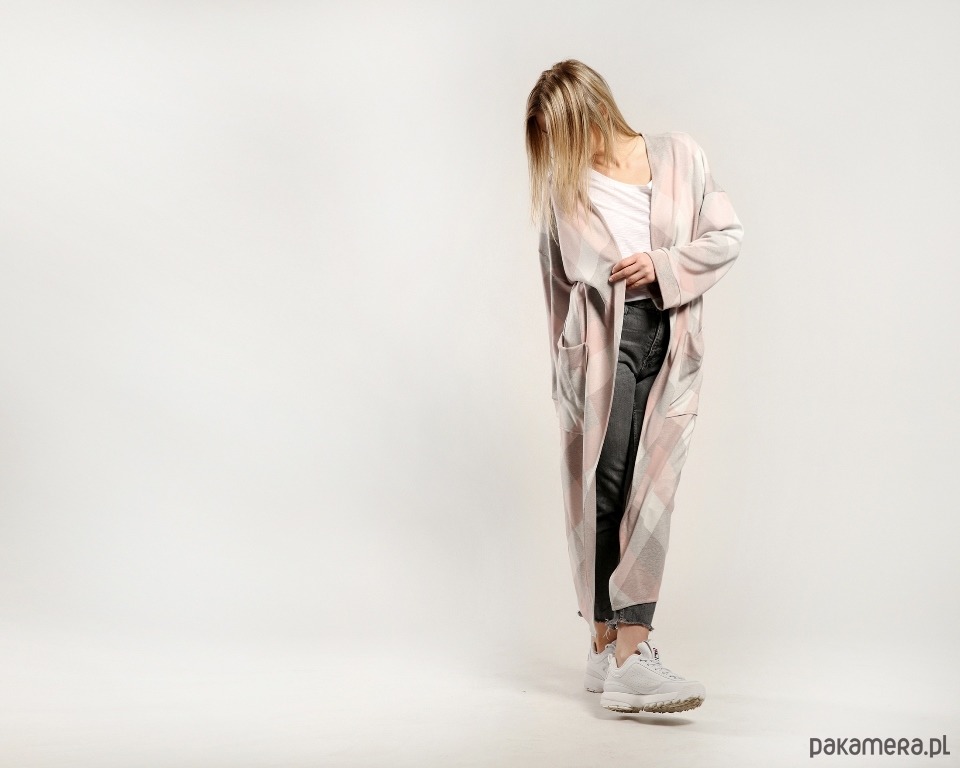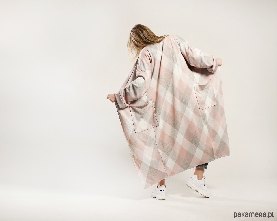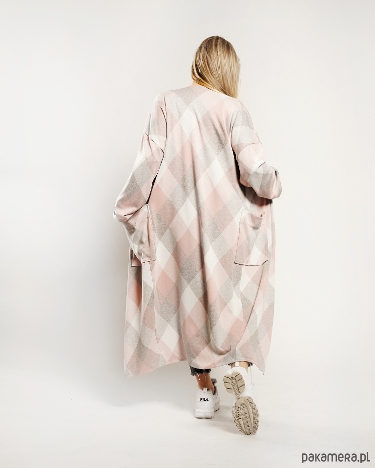 Efektowny i wygodny kardigan sięgający niewiele ponad kostkę. Wykonany z wysokogatunkowej dzianiny w romby w odcieniach ciemnej zieleni i granatu. Po bokach dwie duże naszywane kieszenie. Obszerne rękawy zakończone szerokim mankietem.