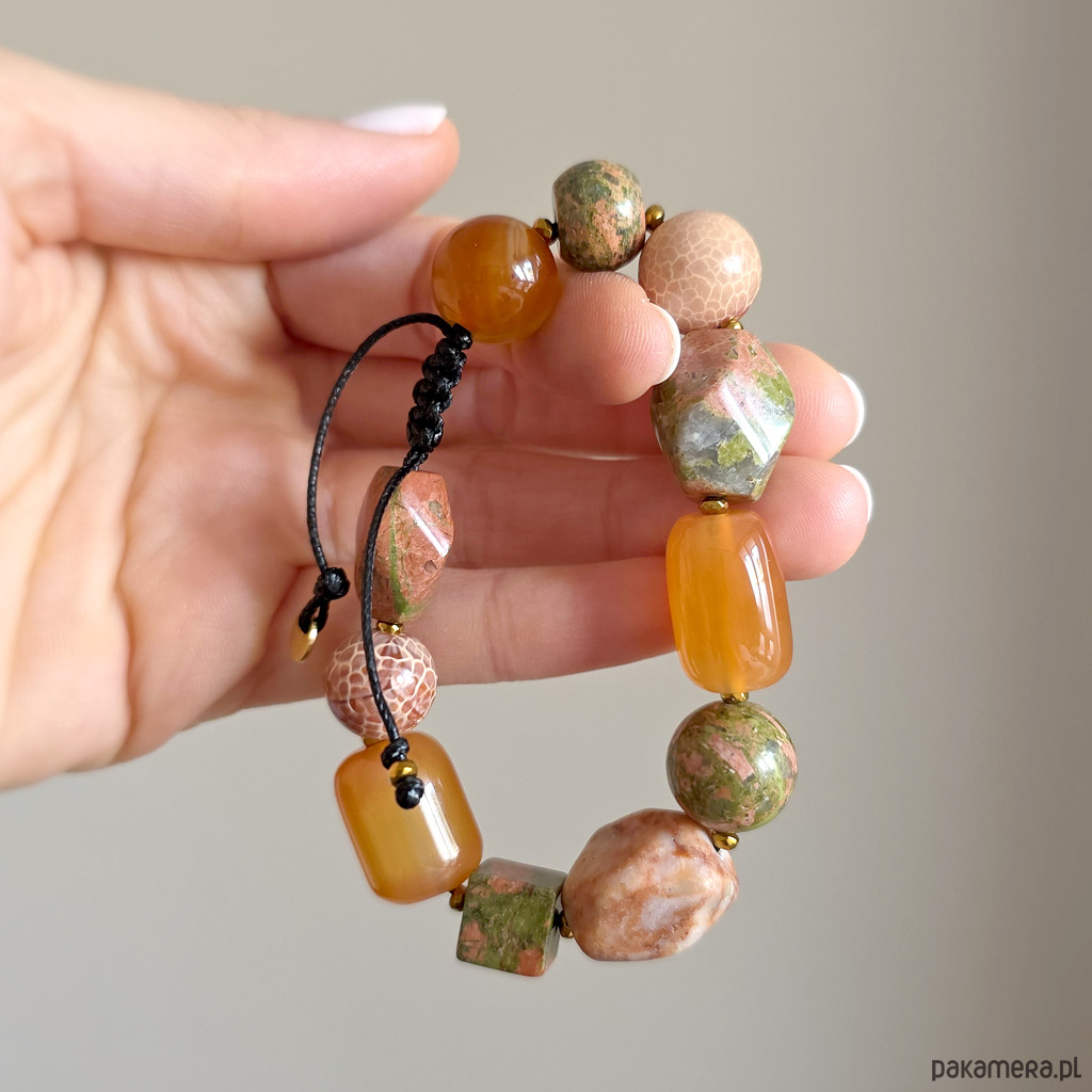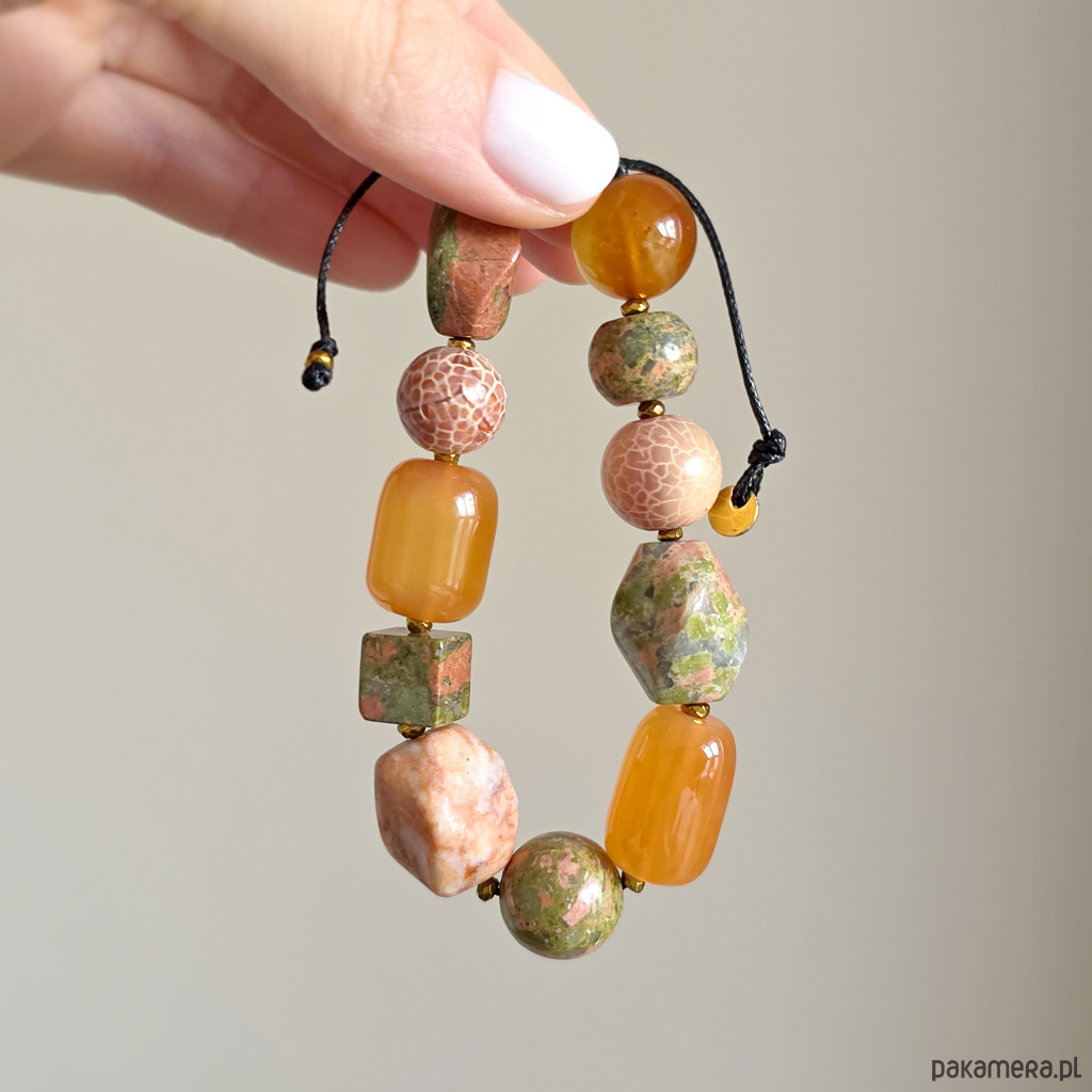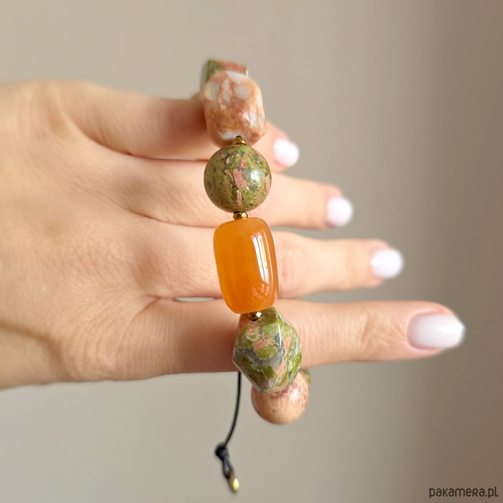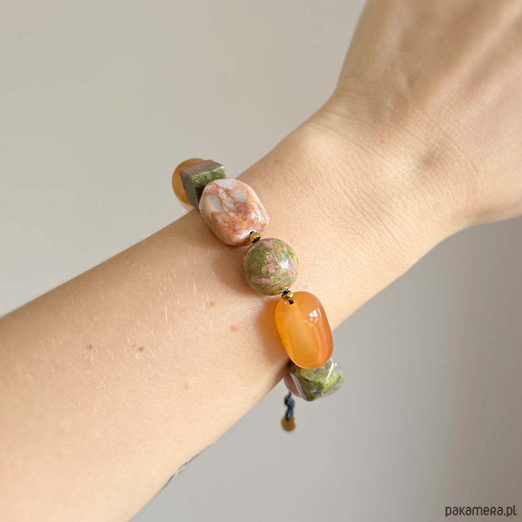 Bransoletka wykonana z kamieni naturalnych - unakitu, karneolu, awenturynu czerwonego, agatu ognistego i hematytu oraz nylonowego sznureczka. Bransoletka będzie odpowiednia na nadgarstek o obwodzie 15-16,5 cm.