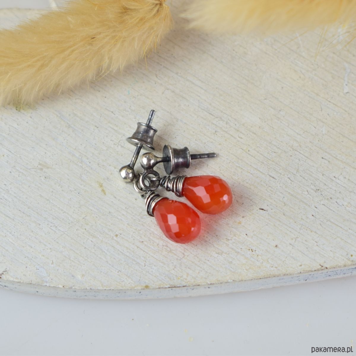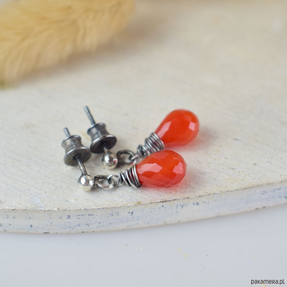 Srebrne kolczyki (srebro 925) z kroplami karneolu. Biżuteria została zoksydowana i wypolerowana. Długość całego kolczyka 2 cm.