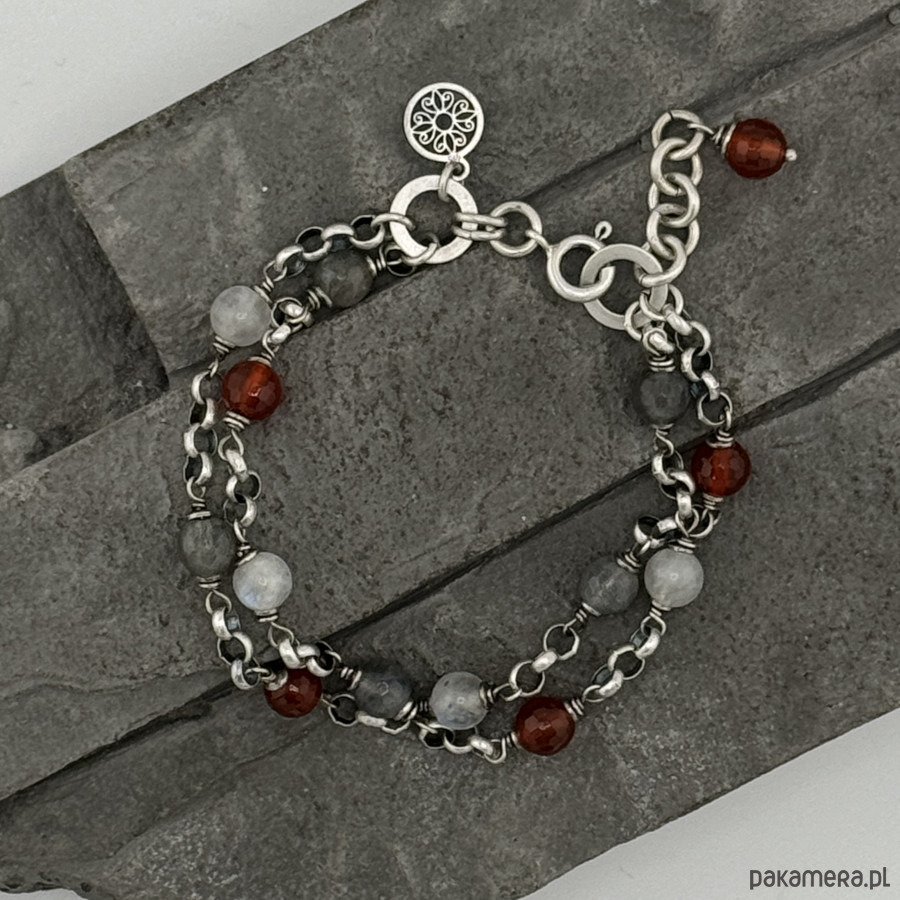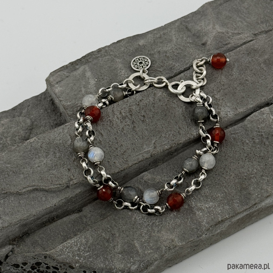 Kobieca, oryginalna bransoletka na co dzień. Wykonana w całości z oksydowanego srebra próby 925 oraz kulek karneolu, kamienia księżycowego i labradorytu wielkości 6 mm. Całkowita długość bransoletki regulowana od 18,5 cm do 20 cm. W mojej galerii kolczyki do kompletu. Ozdobnie zapakowana.