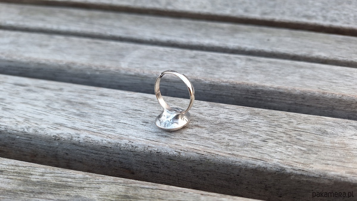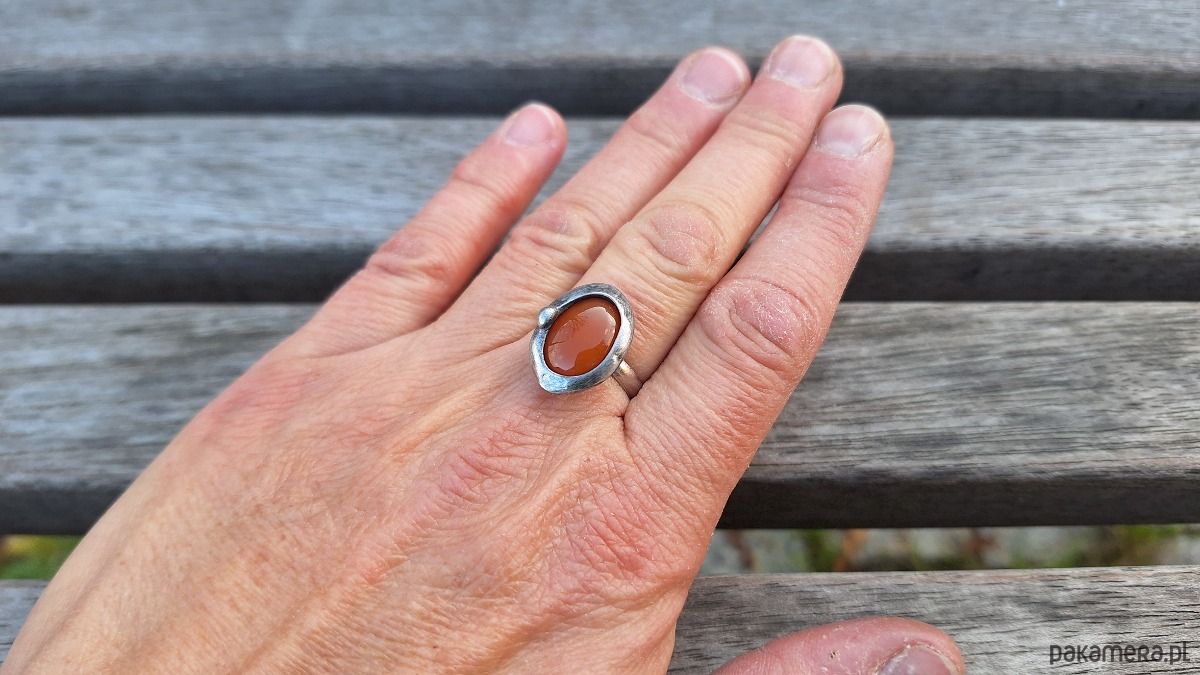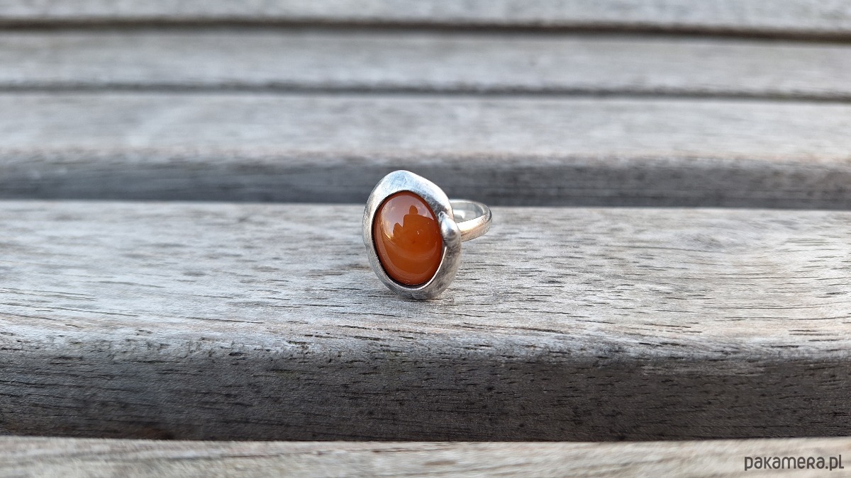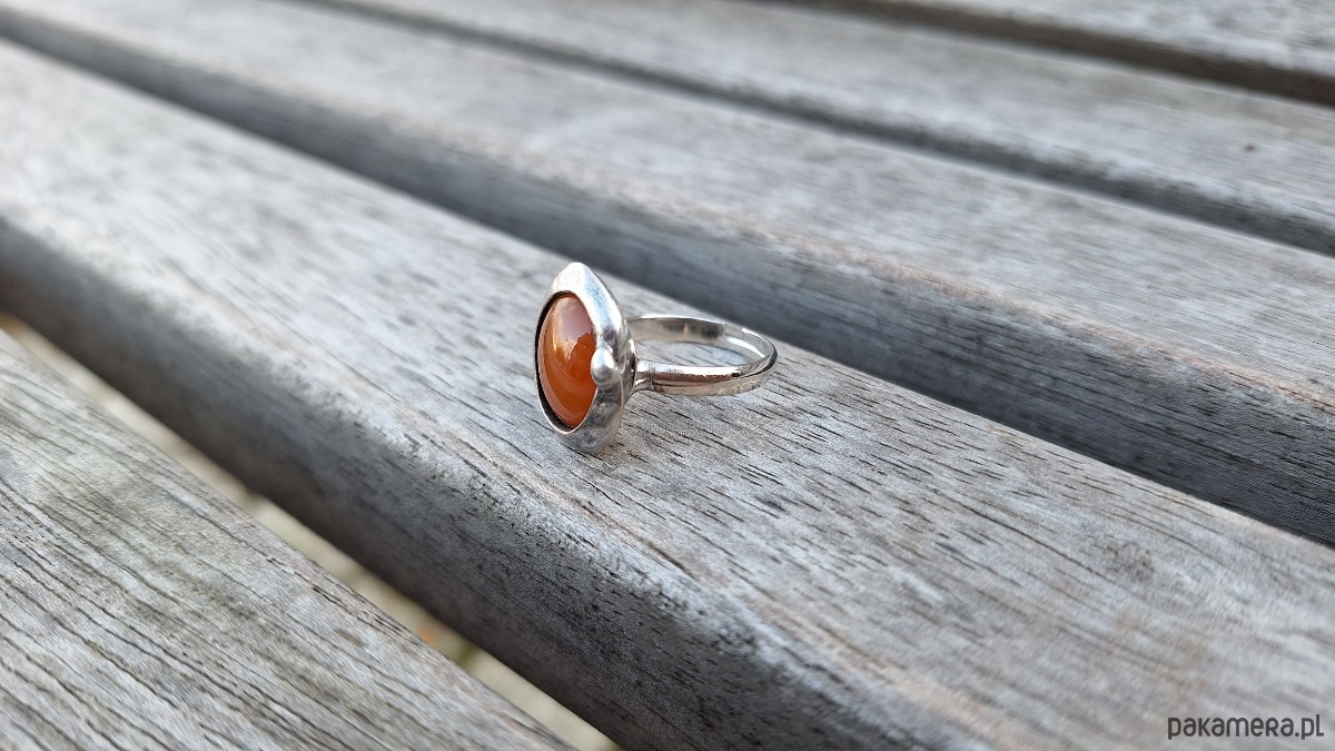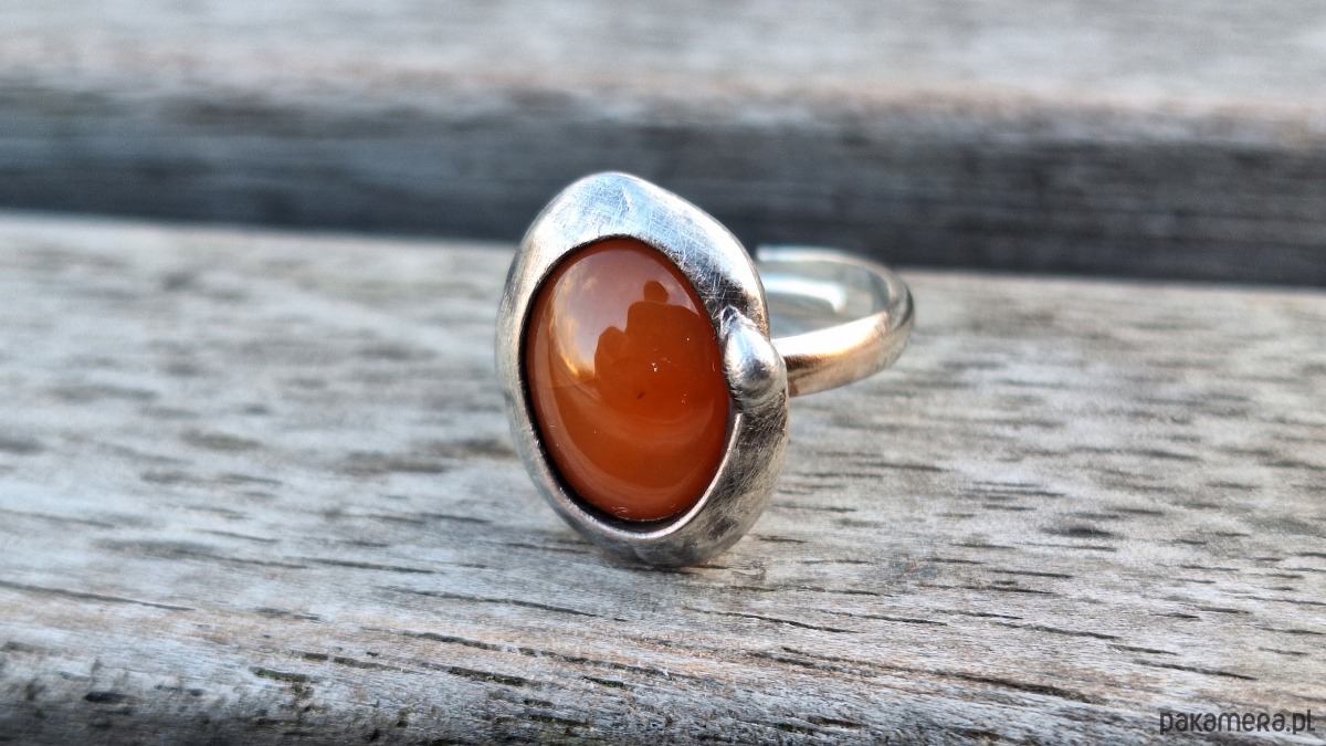 Pierścionek wykonany z miedzi, cyny i naturalnego karneolu. Wymiary ok. 1.5 na 1.1 cm. Regulowany. Nie jest ciężki.