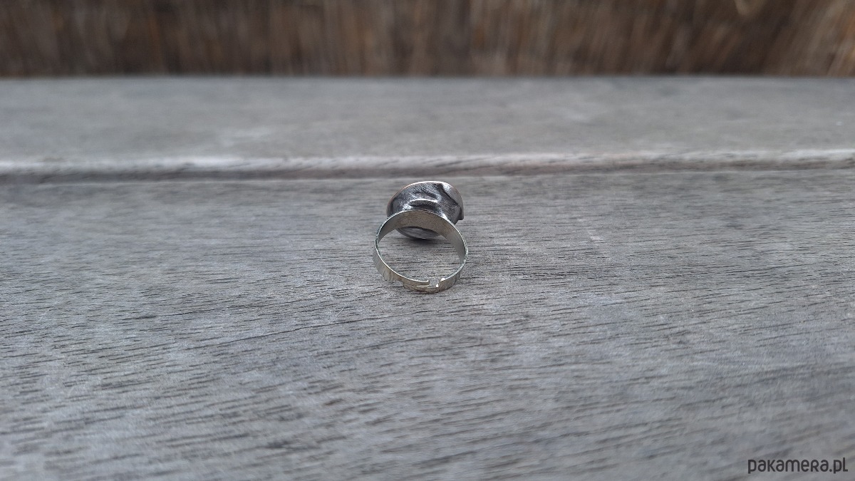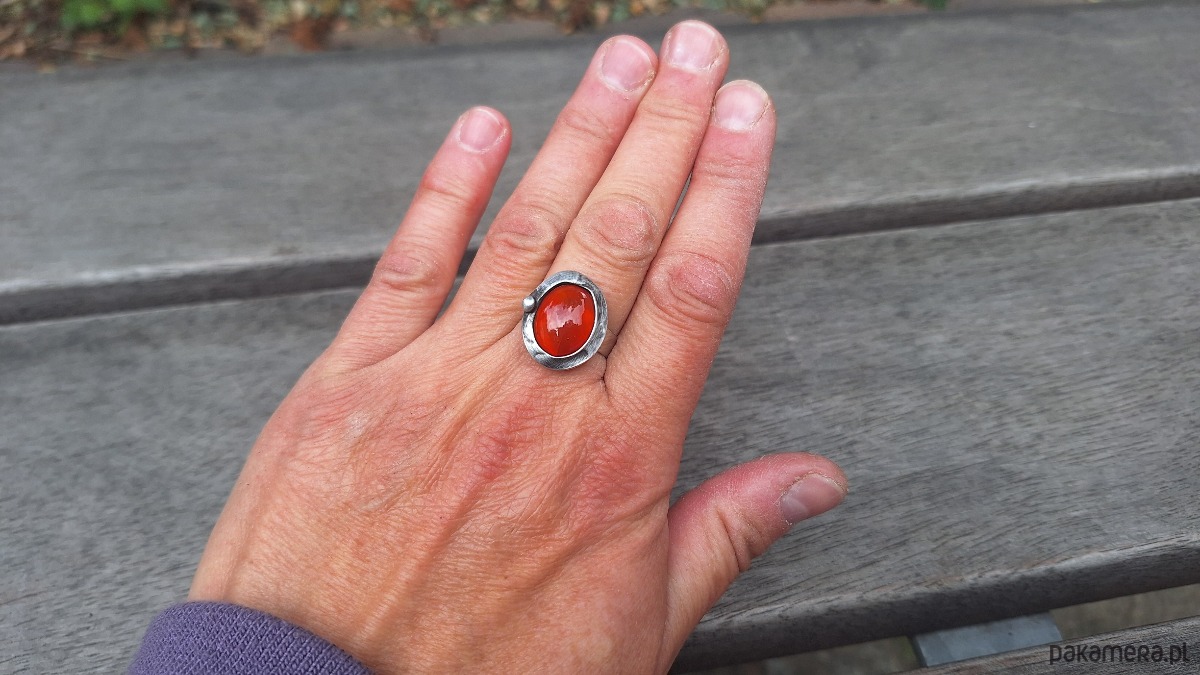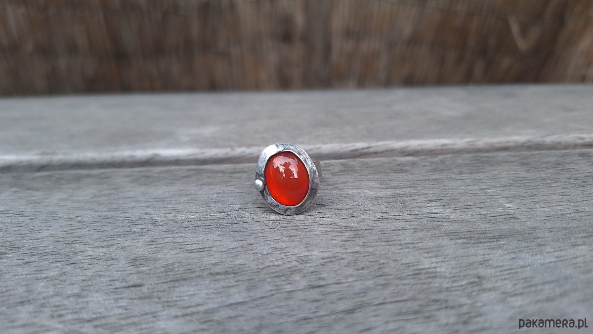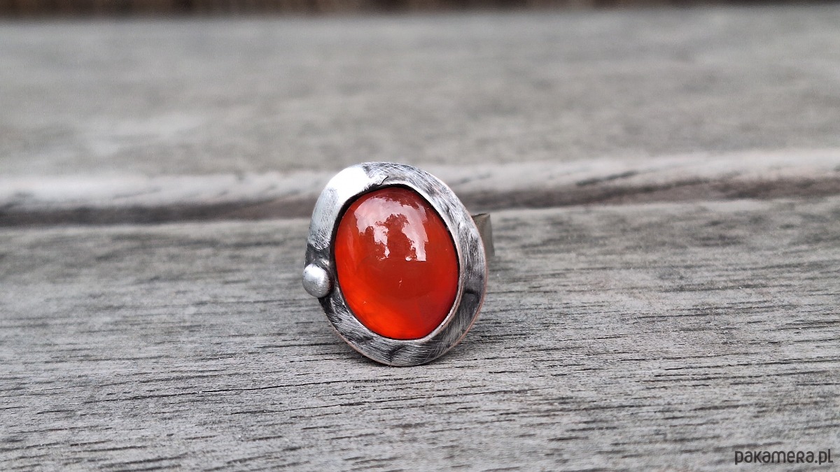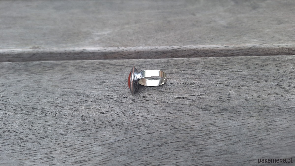 Pierścionek wykonany z miedzi, cyny i naturalnego karneolu. Wymiary ok. 1.8 na 1.5 cm. Regulowany. Nie jest ciężki.