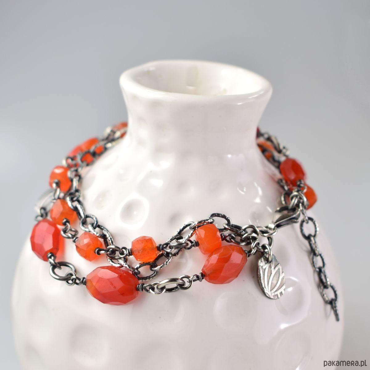 Bransoletka wykonana w całości ze srebra (próba 925) z karneolem. Całość została zoksydowana (przyciemniona) i wypolerowana. Długość regulowana 20,5 - 24 cm. Biżuteria zostanie ozdobnie zapakowana.