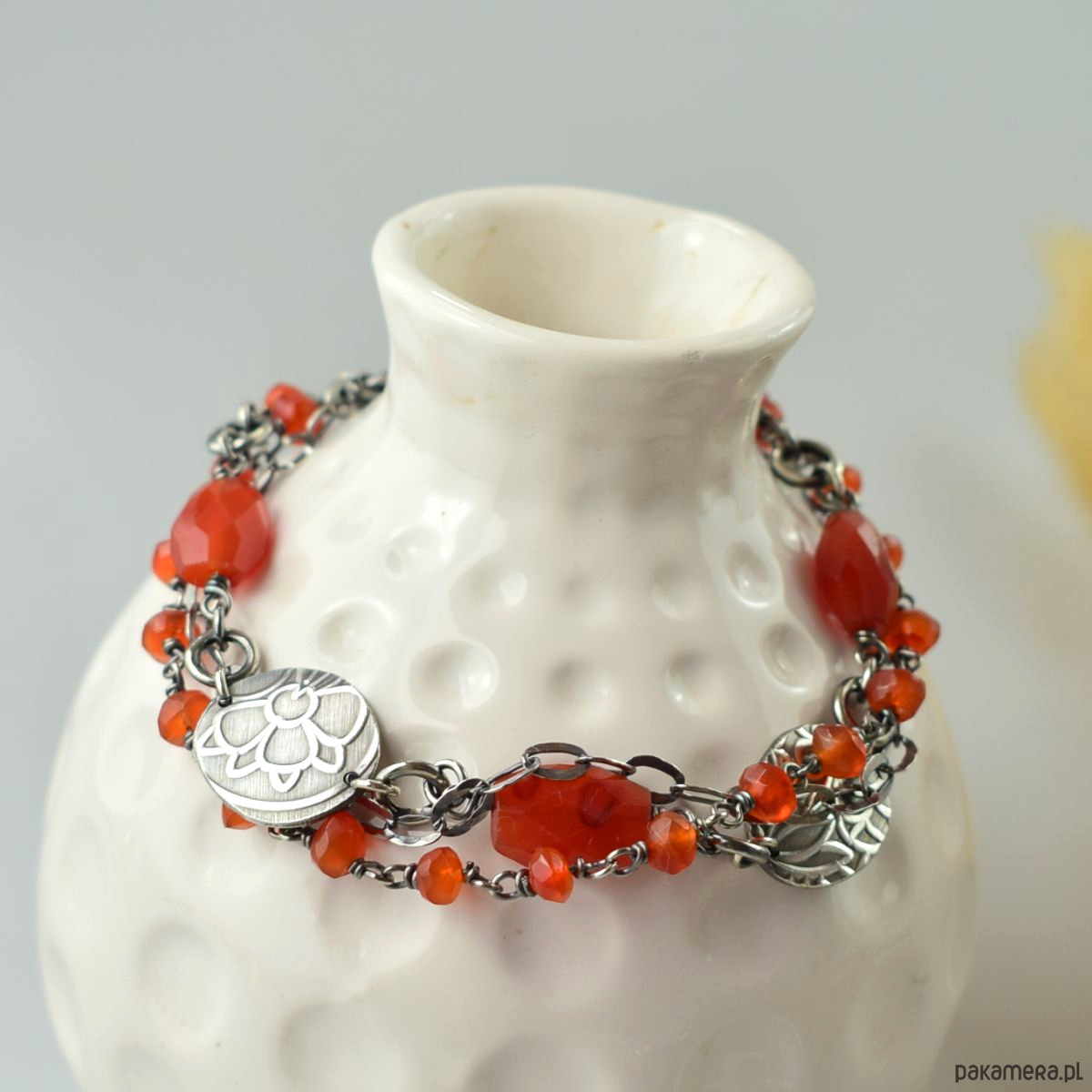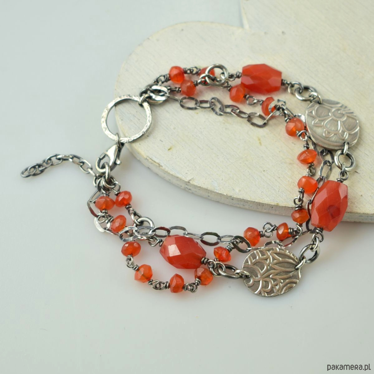 Bransoletka wykonana w całości ze srebra (próba 925) z karneolem. Całość została zoksydowana (przyciemniona) i wypolerowana. Długość regulowana 20 - 23,5 cm. Biżuteria zostanie ozdobnie zapakowana.