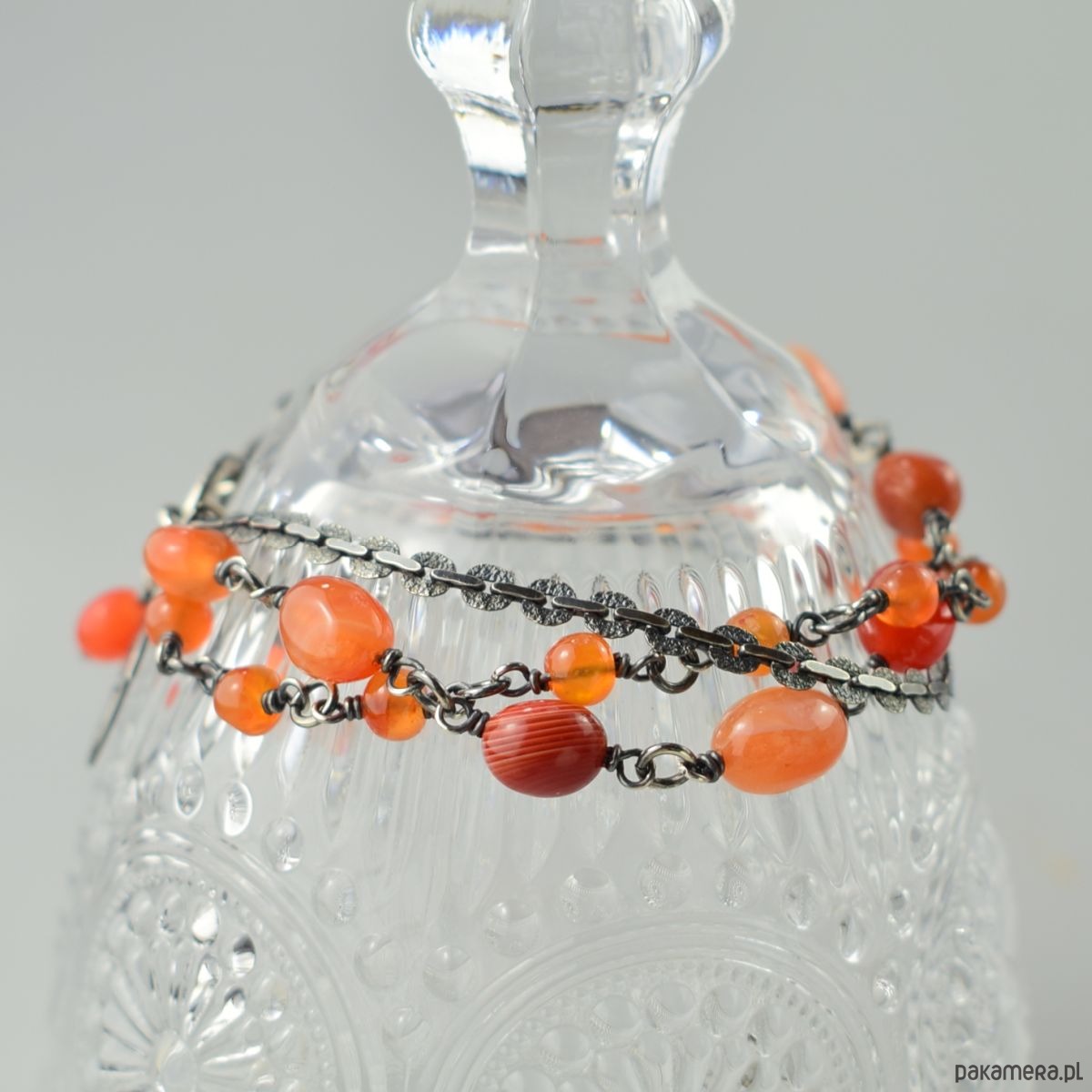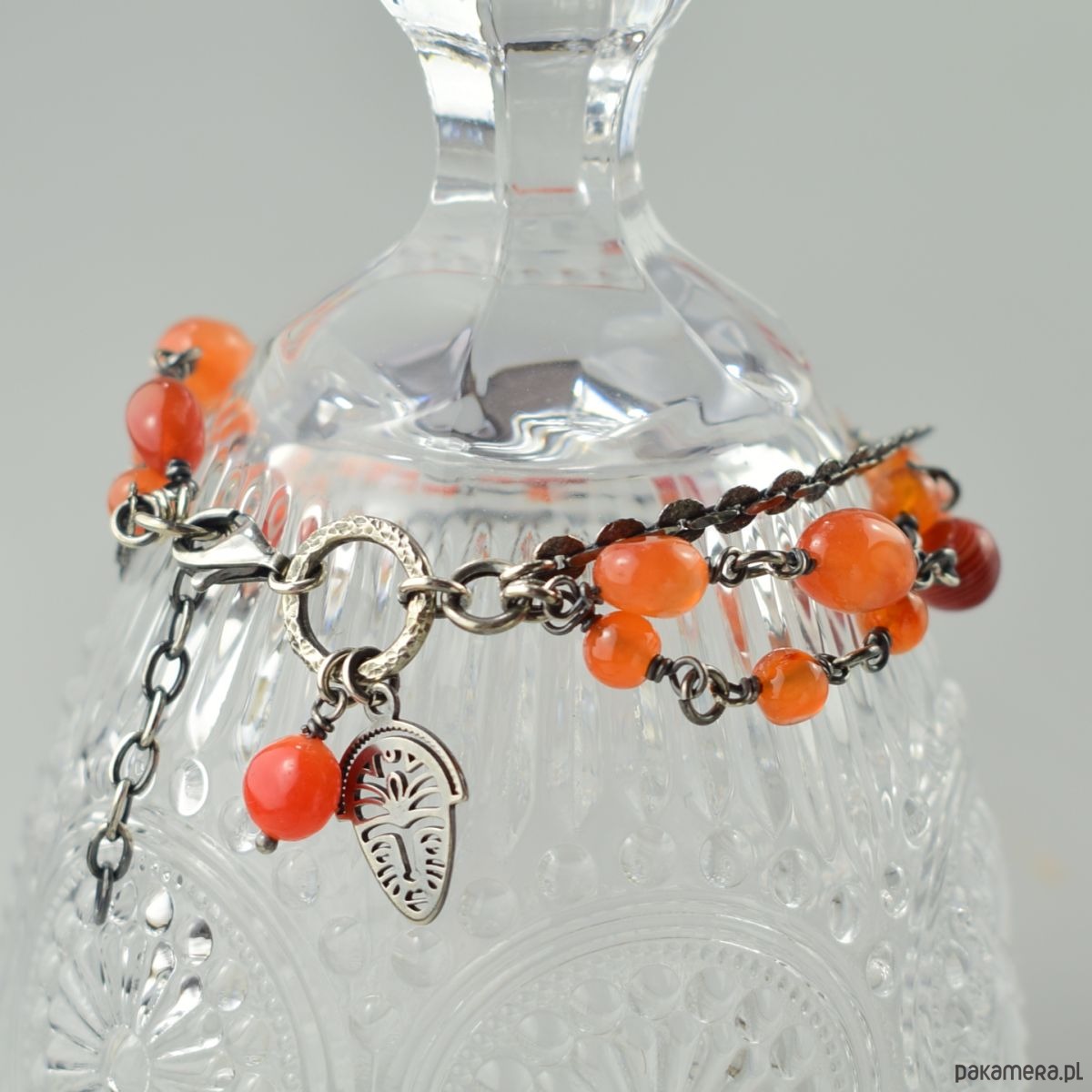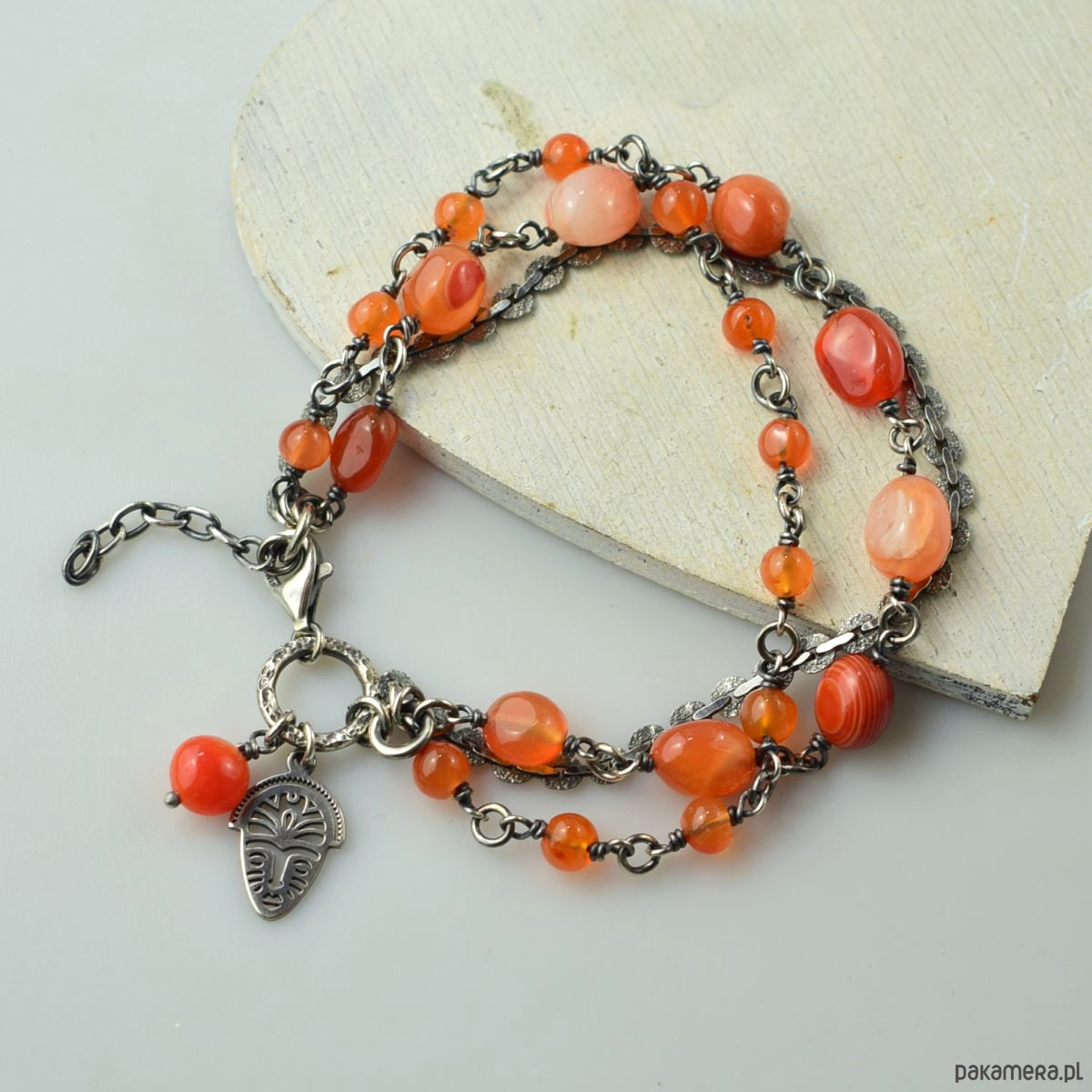 Bransoletka wykonana w całości ze srebra (próba 925) z karneolem. Całość została zoksydowana (przyciemniona) i wypolerowana. Długość regulowana 20,5 - 23,5 cm. Biżuteria zostanie ozdobnie zapakowana.