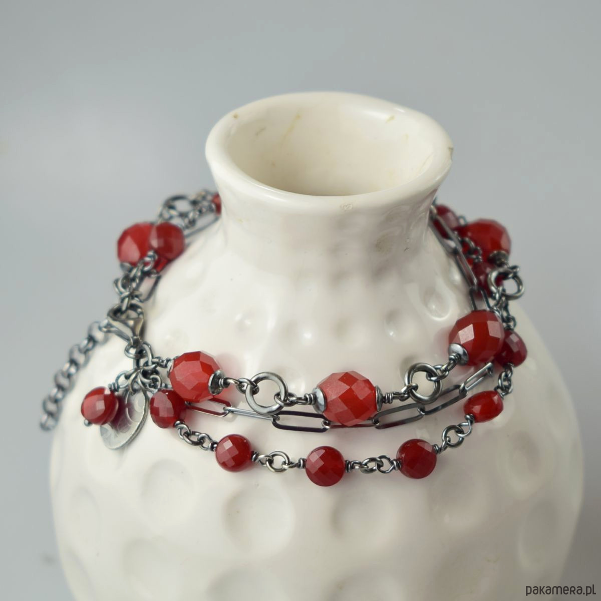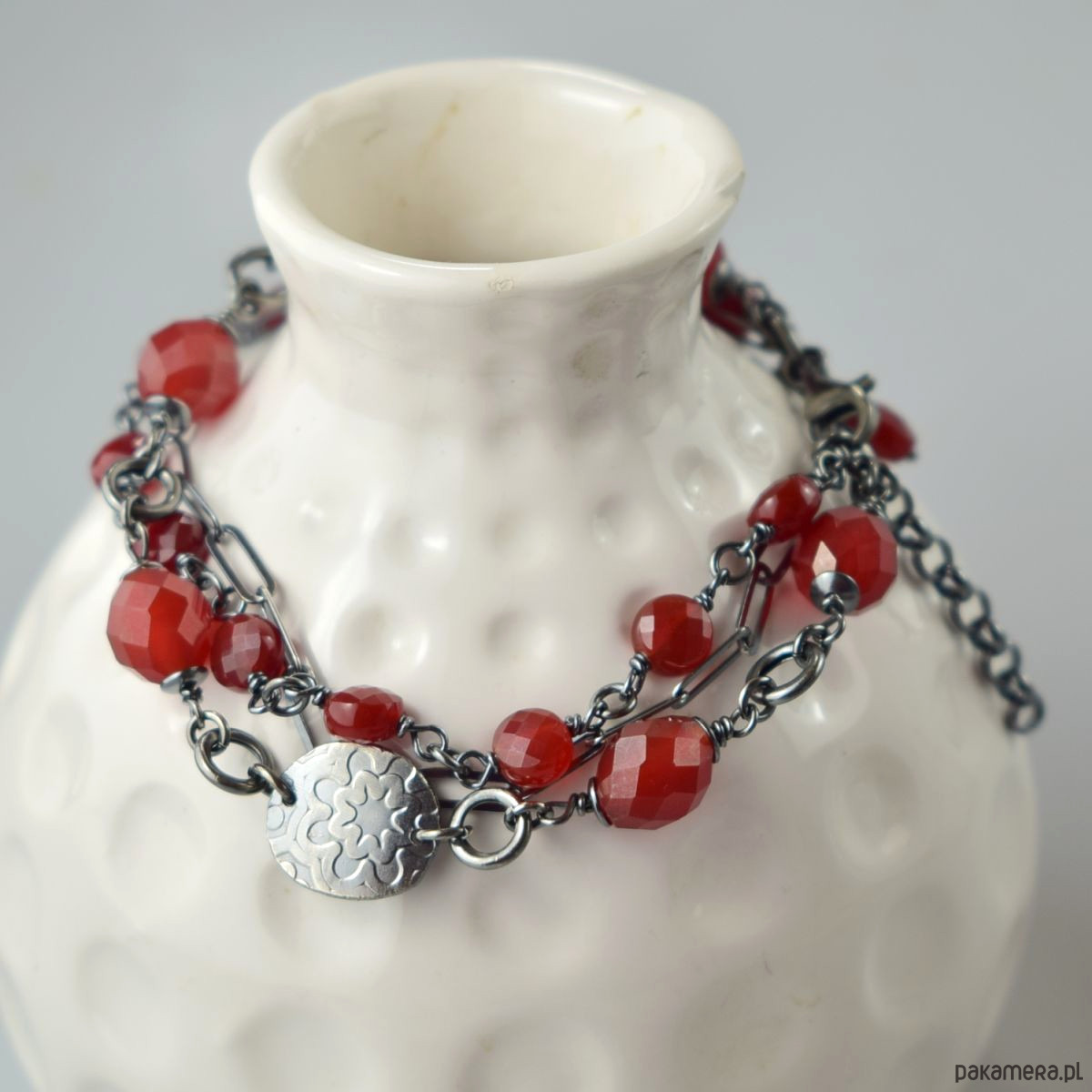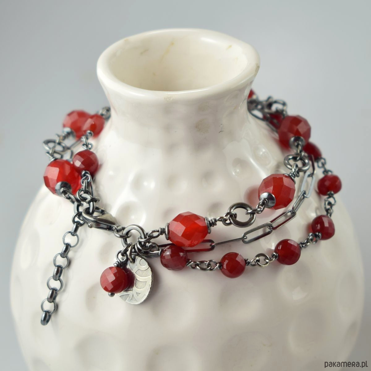 Bransoletka wykonana w całości ze srebra (próba 925) z karneolem. Całość została zoksydowana (przyciemniona) i wypolerowana. Długość regulowana 19,5 - 22 cm. Biżuteria zostanie ozdobnie zapakowana.