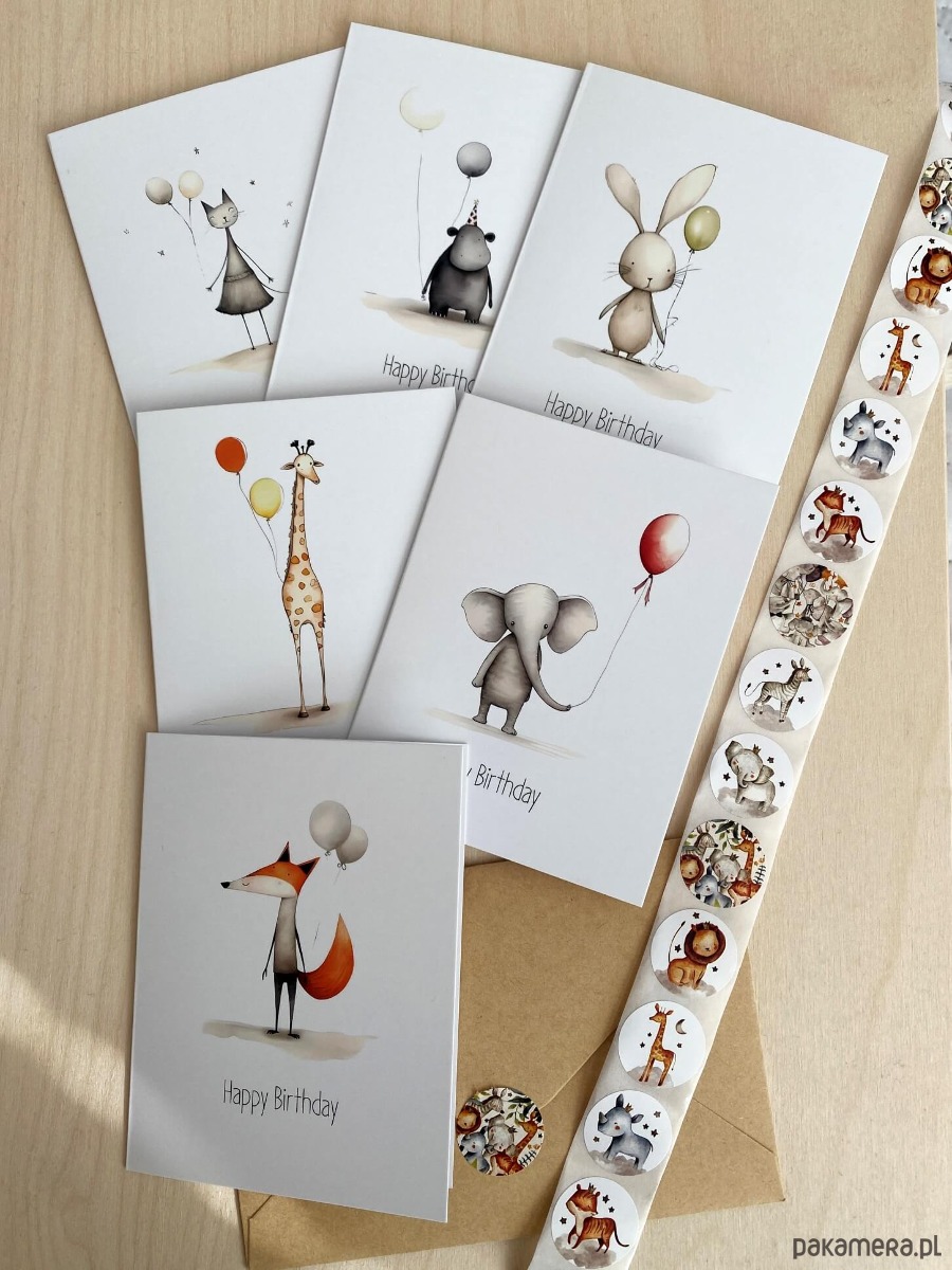 Przedstawiamy urodzinową kartkę z grafiką, motyw zwierząt z balonikiem. Dodatkowo na kartce mieści się napis -Happy Birthday .