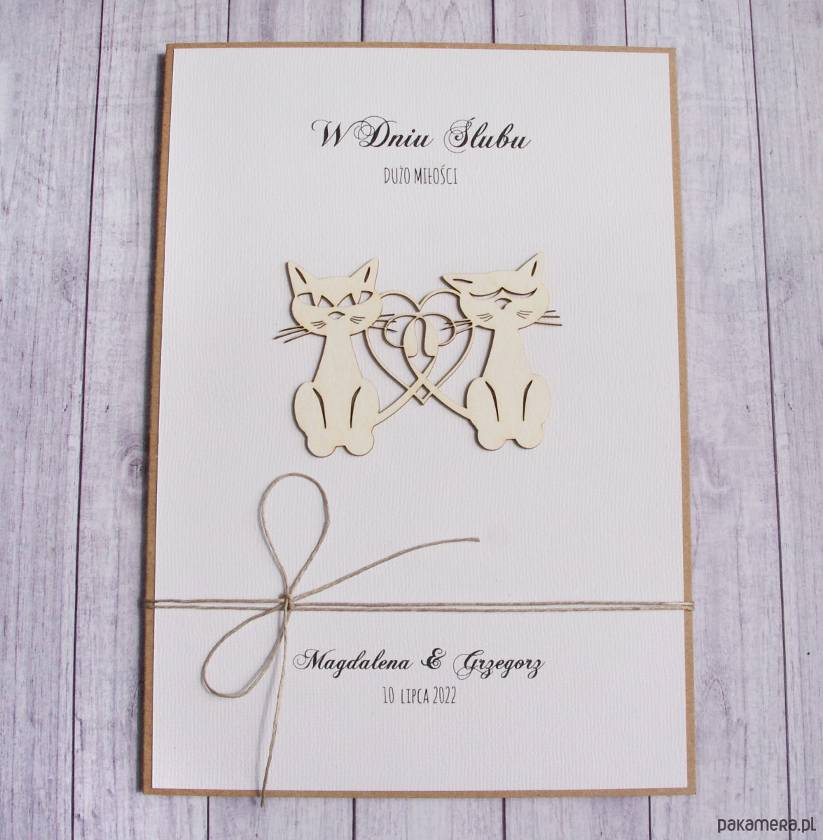 wykonana na bazie grubego kartonu EKO-kraft (100% makulatury), ozdobiona najwyższej jakości papierem wizytówkowym (faktura płótna) z personalizacją. w centrum : najwyższej jakości tekturka z beermaty: zakochane koty.
