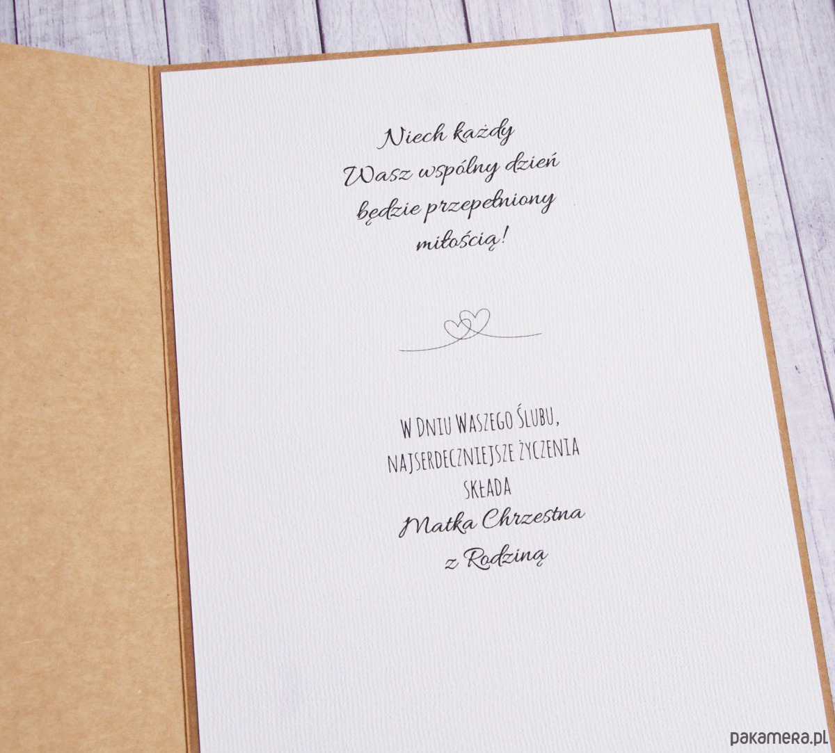 w środku wklejone personalizowane życzenia (takie jak na zdjęciu lub dowolne - wg Twojego pomysłu) - drukowane na tym samym papierze wizytówkowym.