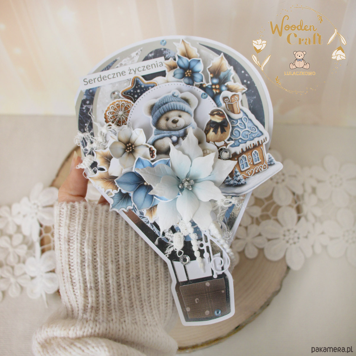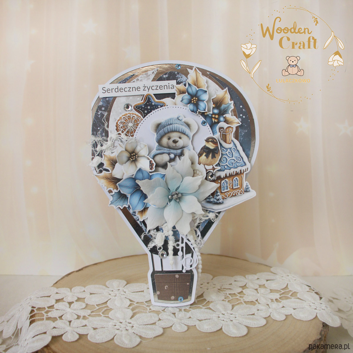 Jedyna w swoim rodzaju, bogato zdobiona kartka urodzinowa w kształcie balonika, utrzymana w zimowym klimacie, w odcieniach granatu, błękitu, beżu i bieli z dodatkiem srebrnych błyszczących akcentów. Kartka wykonana z prześlicznej, zimowej kolekcji papierów "Jolly Season". Kartka ozdobiona grafiką uroczego pluszowego misia, udekorowana ręcznie robioną, biało-niebieską poinsecją, koronkami, kryształkami, brokatem oraz napisem "Serdeczne Życzenia" (na życzenie napis mogę zmienić na dowolny, dopasowany do okazji).