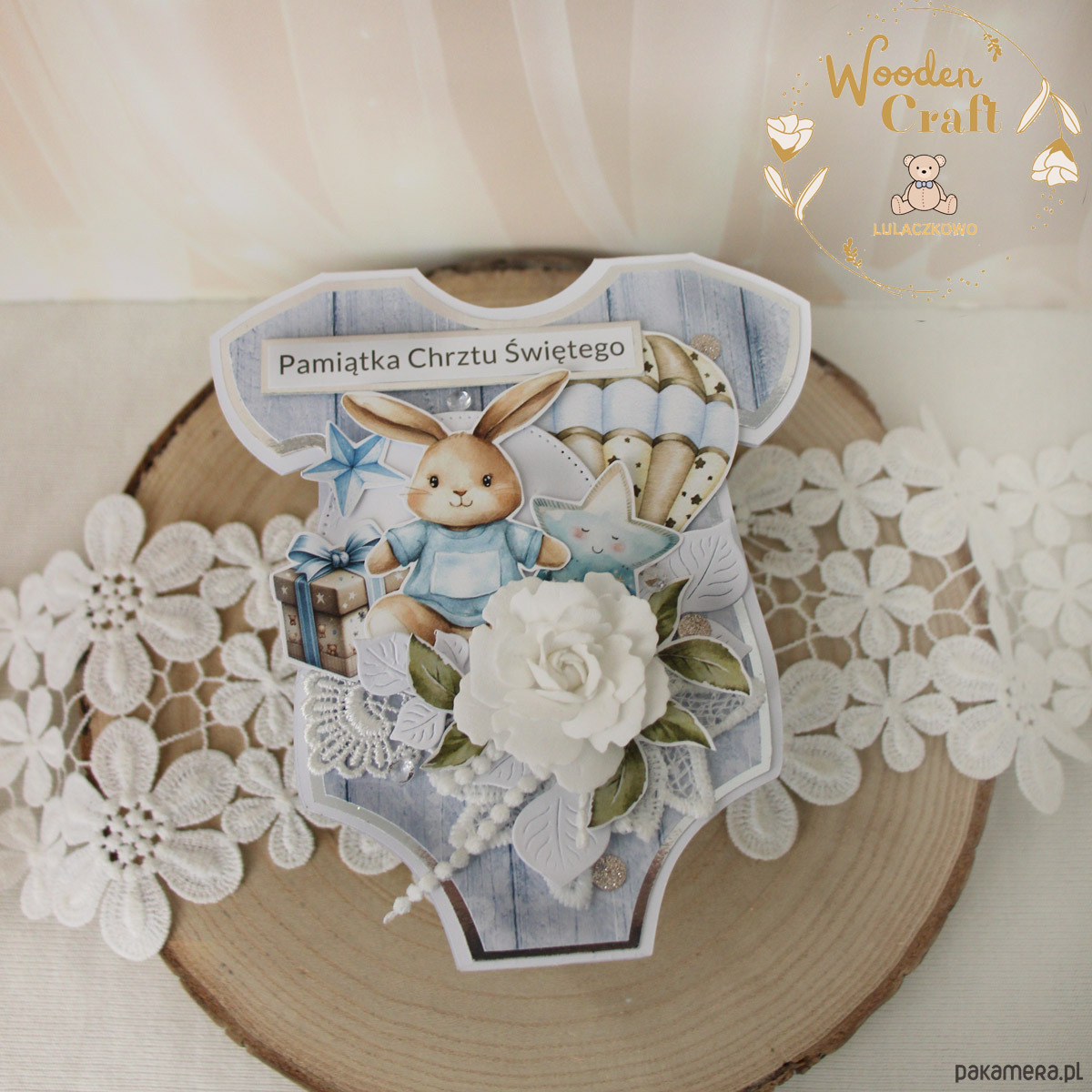 Urocza i nietuzinkowa kartka z okazji Chrztu Świętego, w kształcie dziecięcego body, wykonana z mixu dziecięcych kolekcji papierów, utrzymana w odcieniach bieli, beżu i delikatnego błękitu różu, z dodatkiem błyszczących, srebrnych akcentów. Kartka wykonana ręcznie z dbałością o każdy szczegół. Na środku znajduje się grafika słodkiego króliczka, ozdobiona kompozycją kwiatową z ręcznie robioną różyczką, dodatkowo zdobiona grafikami gwiazdki, balonika i prezentu, kryształkami oraz połyskującymi cekinami, a także napisem "Pamiątka Chrztu Świętego" (na życzenie mogę dodać również imię dziecka, bądź całkowicie zmienić napis na dowolny - w zależności od okazji).
