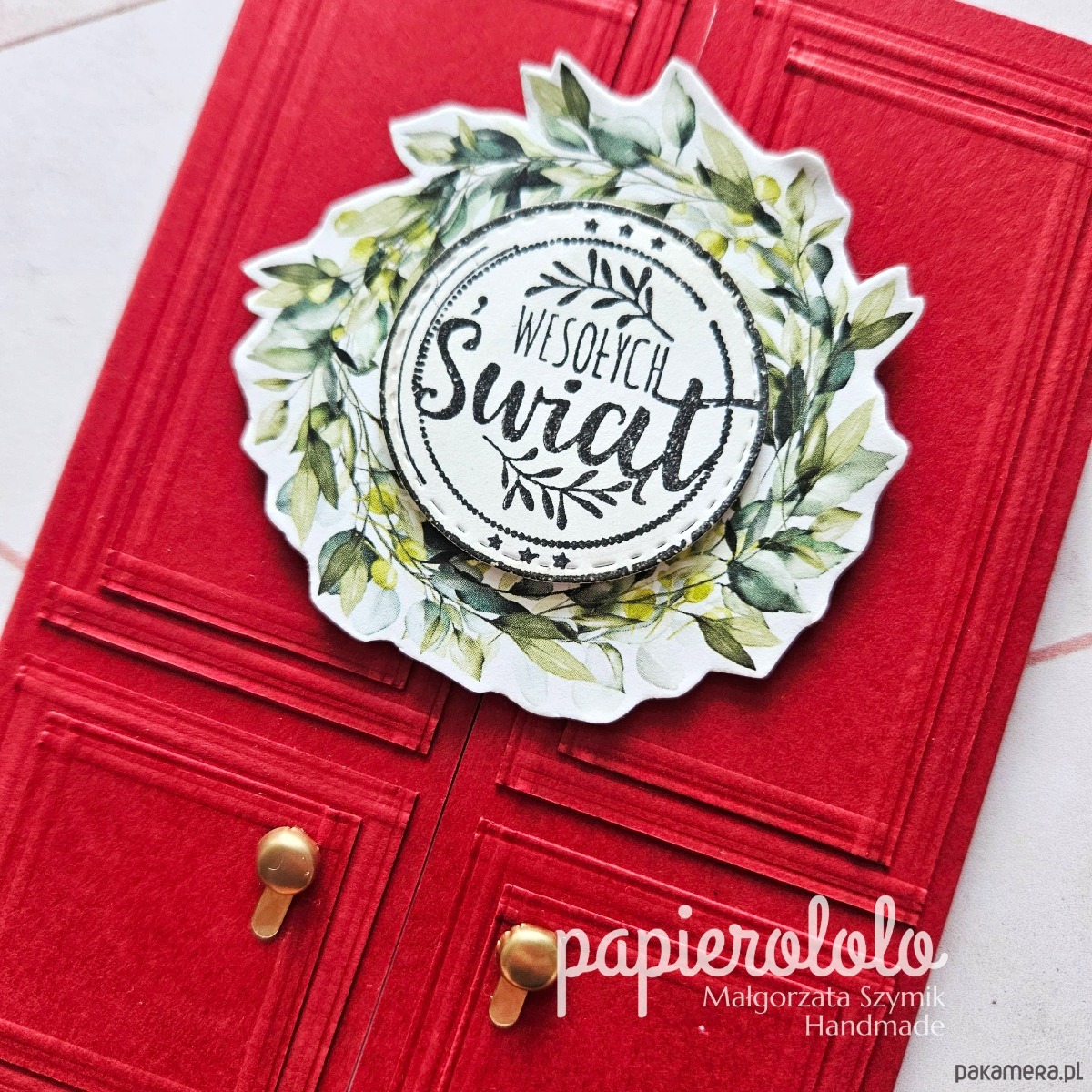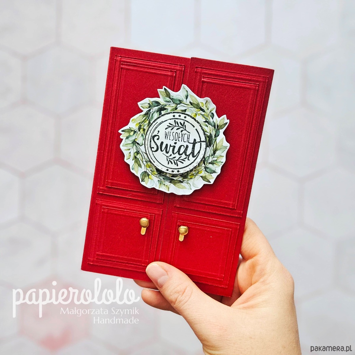 Szczegóły: Kartka świąteczna z czerwonego papieru. Ozdobiona arkuszami papieru przypominającymi rzeźbienia drzwi, metalowe elementy jako gałki oraz wieniec z napisem. W środku jest miejsce na wypisanie życzeń.