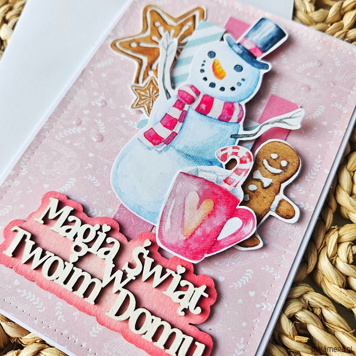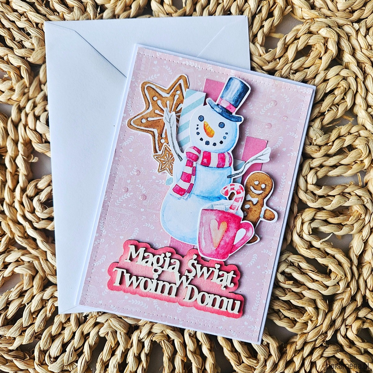 Kartka bożonarodzeniowa z bałwanem w różowym kolorze