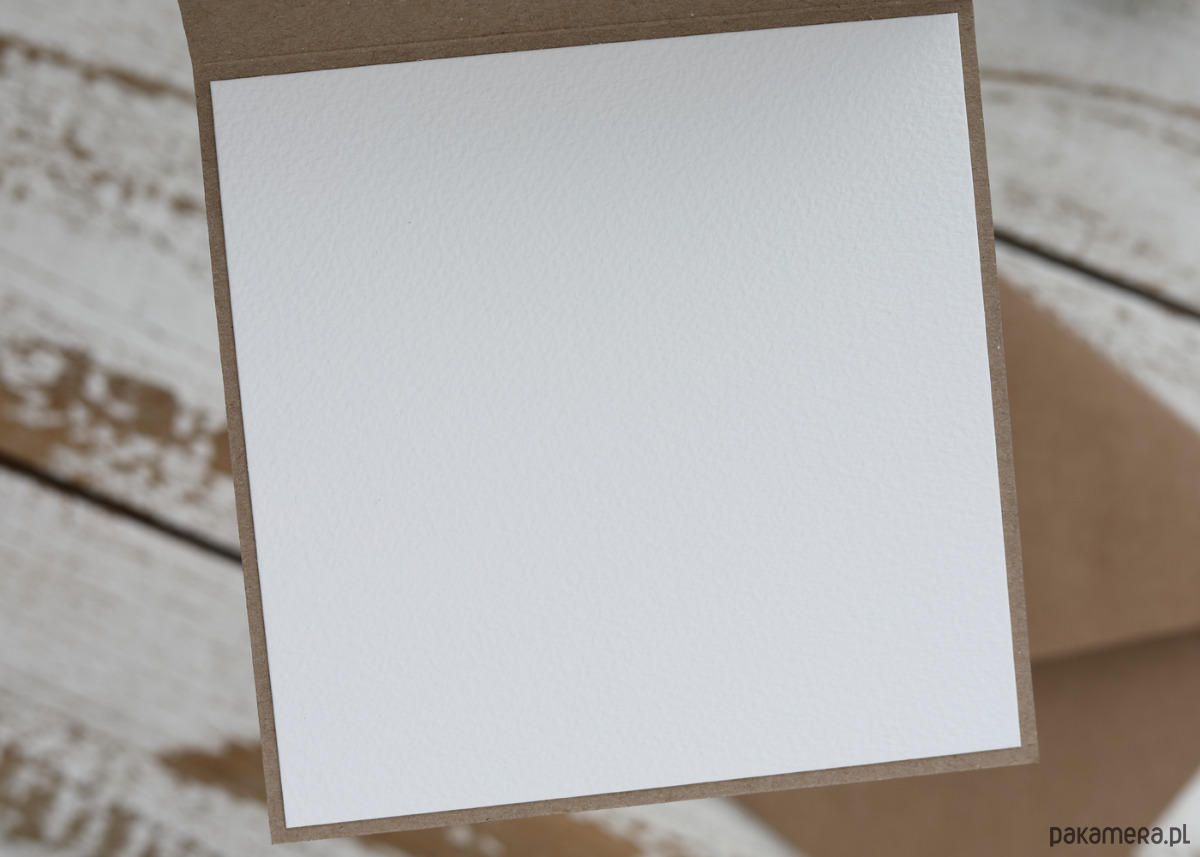 Kartka o wymiarach 14x14 cm w zestawie z brązową kopertą.
