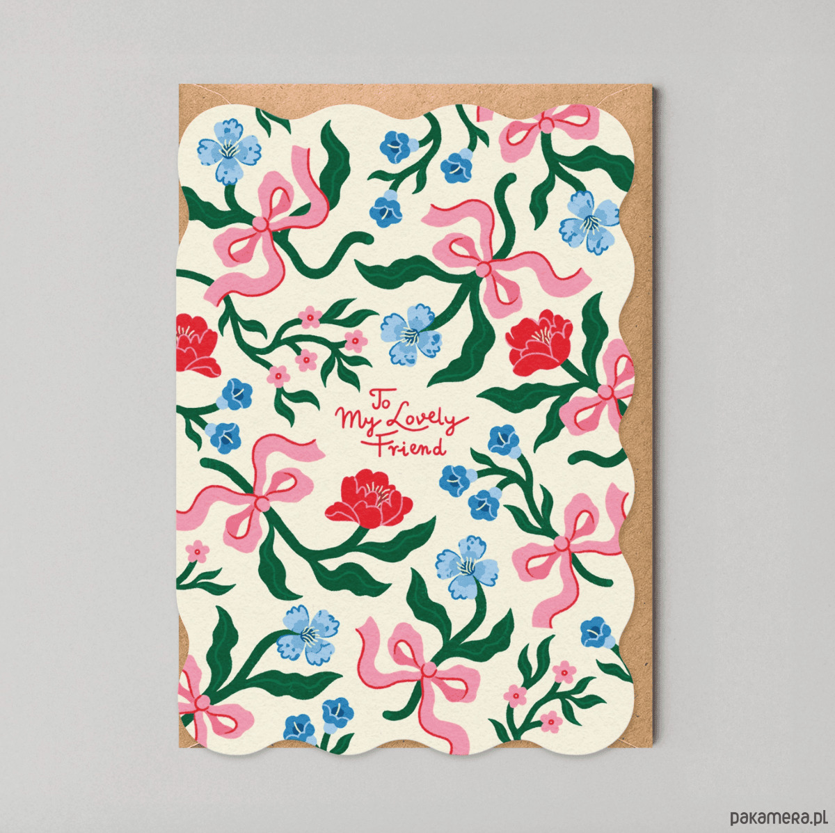 Pokaż bliskiej osobie, jak bardzo jest dla Ciebie ważna, wręczając jej tę artystyczną kartkę zaprojektowaną przez Edytę Demurat. Wzór to misterna kompozycja ręcznie malowanych kwiatów w odcieniach czerwieni i błękitu, przeplecionych uroczymi różowymi kokardami. Centralny punkt stanowi subtelny, odręczny napis „To My Lovely Friend”.